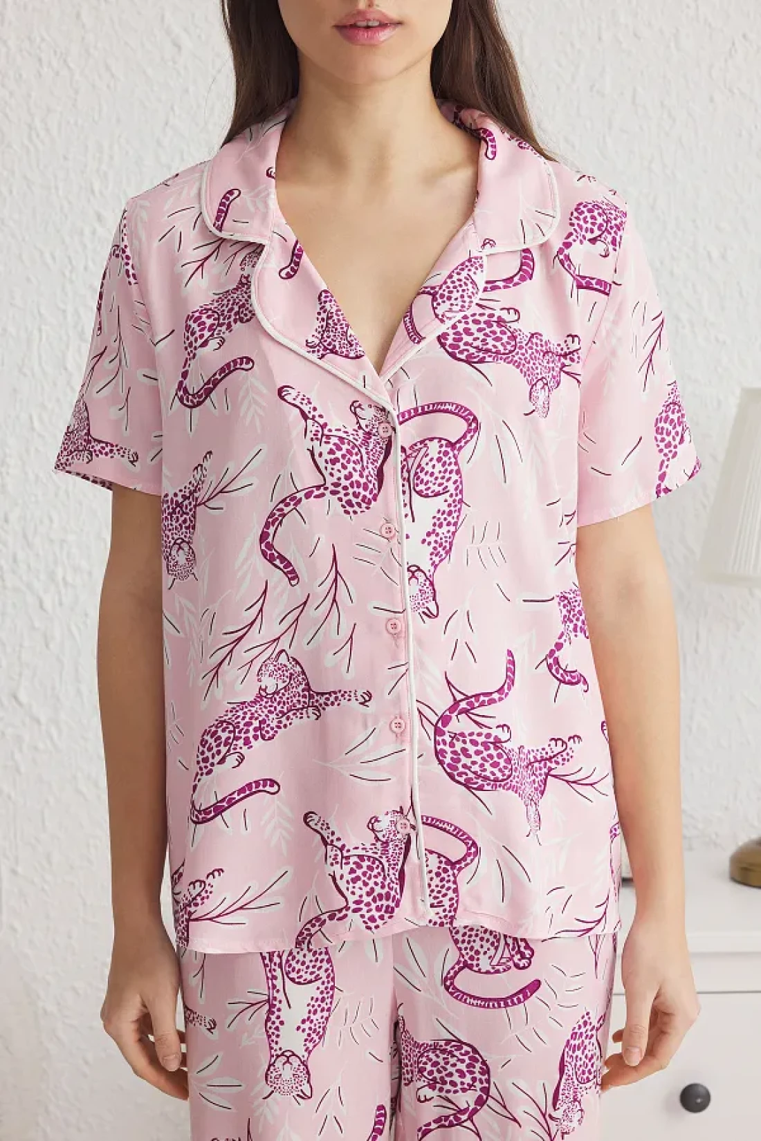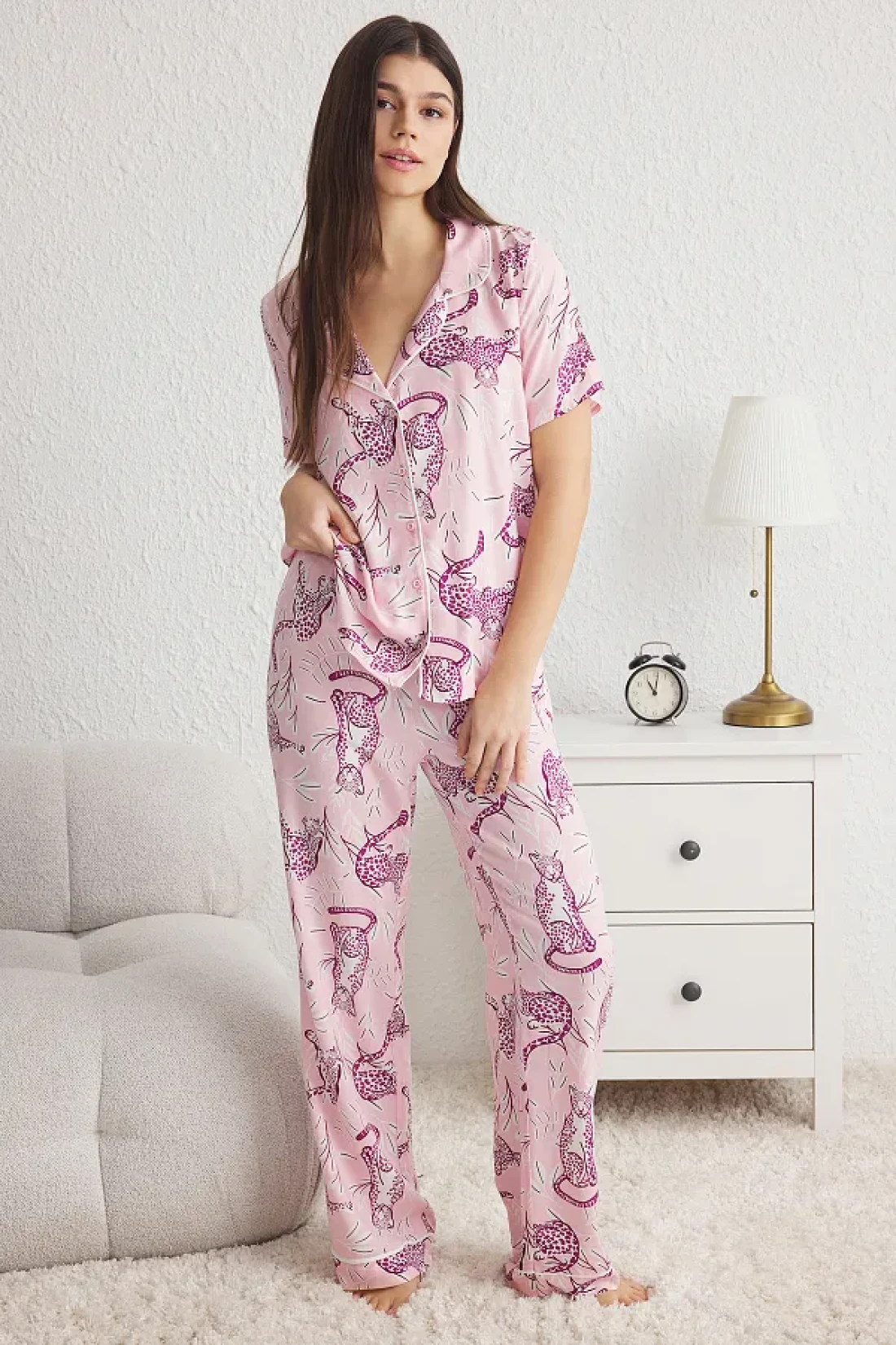 Collection طقم بيجامة منسوجة من الفيسكوز بطباعة حيوانات وردية THMSS25PT00022