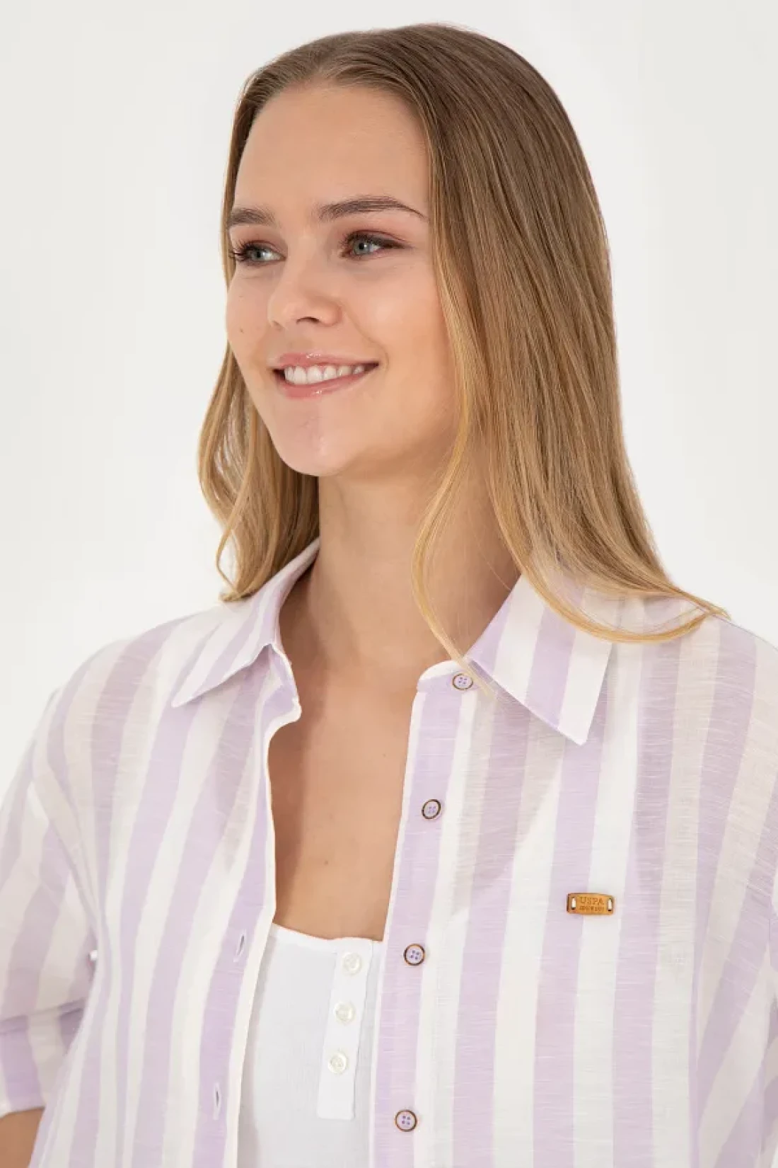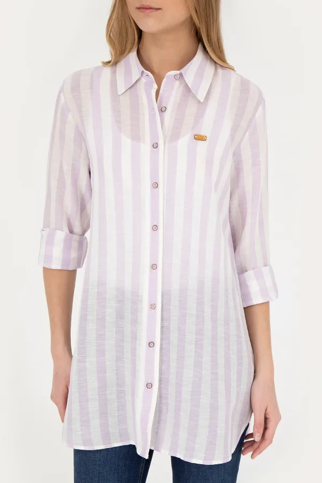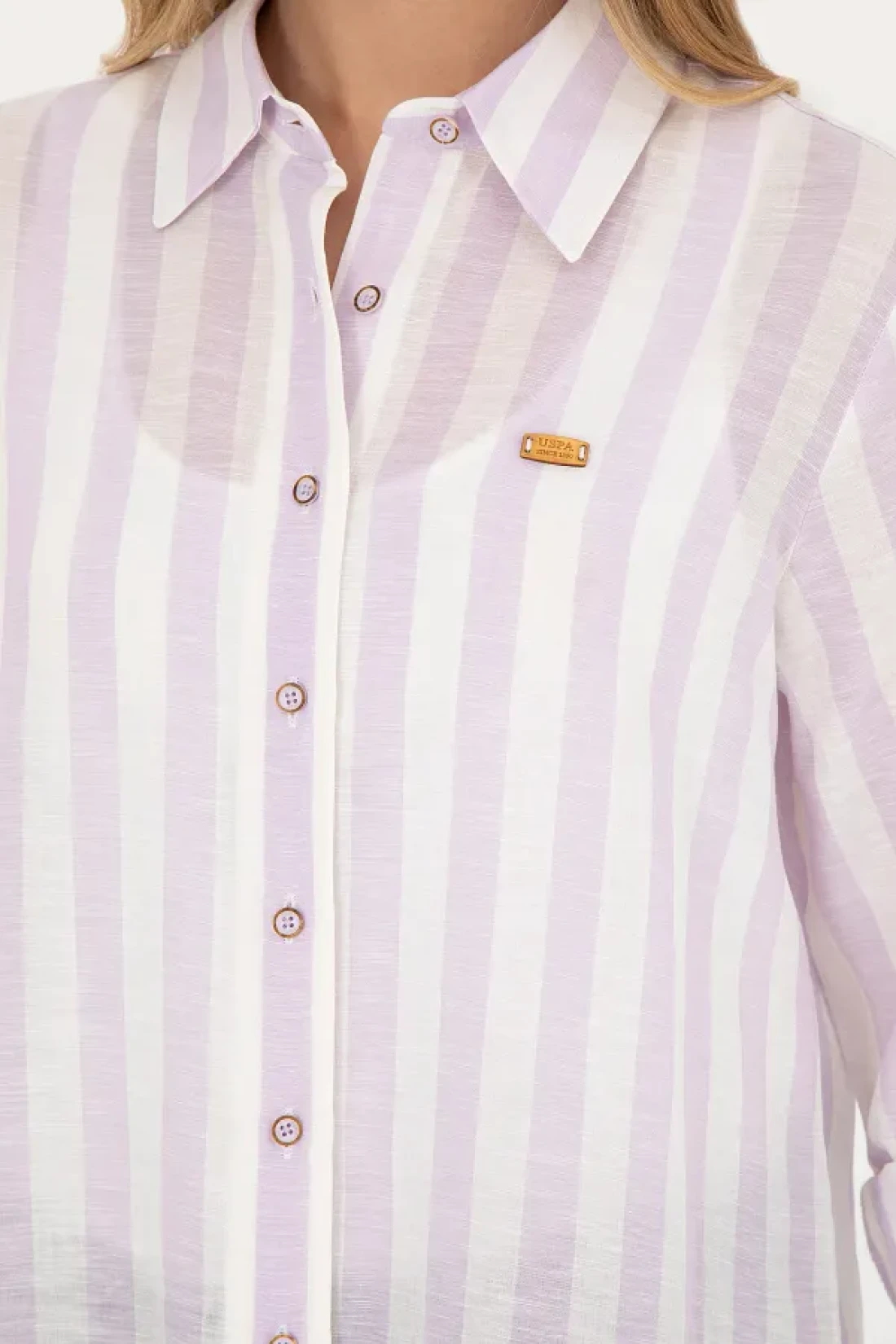 U.S. Polo Assn. قميص نسائي ذو مظهر كتان أرجواني - كم طويل50288408-VR034