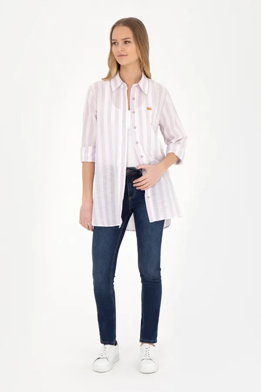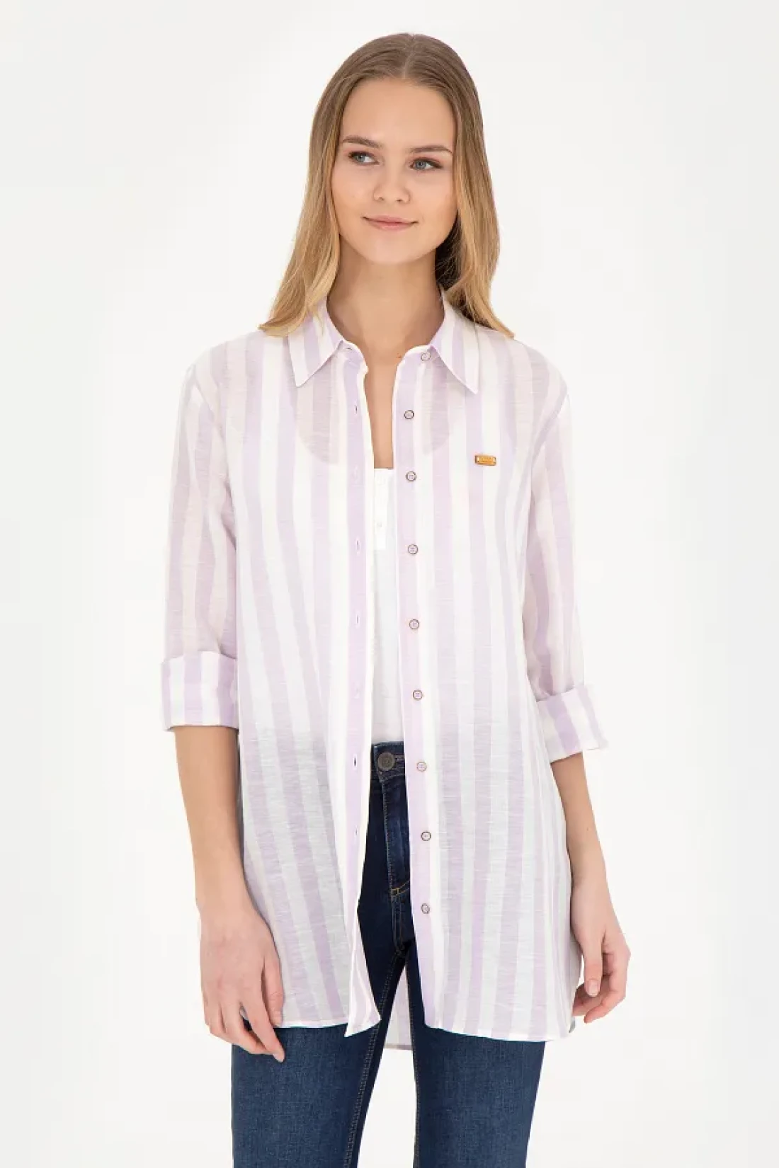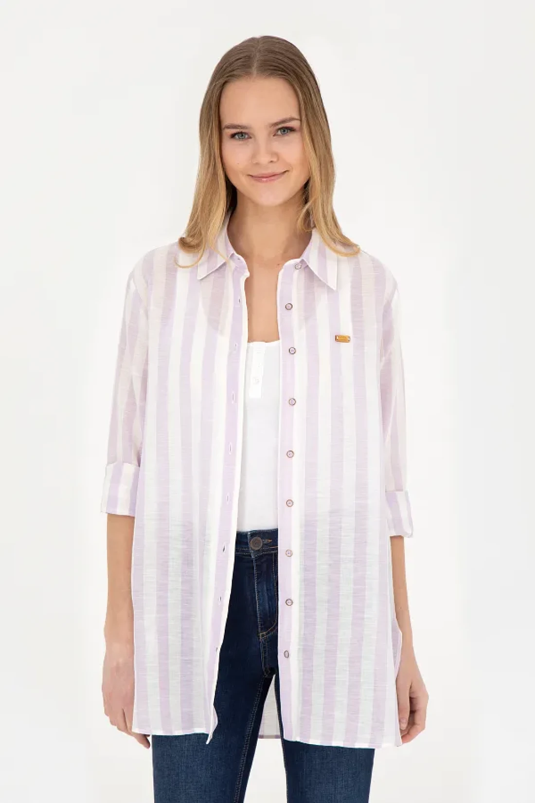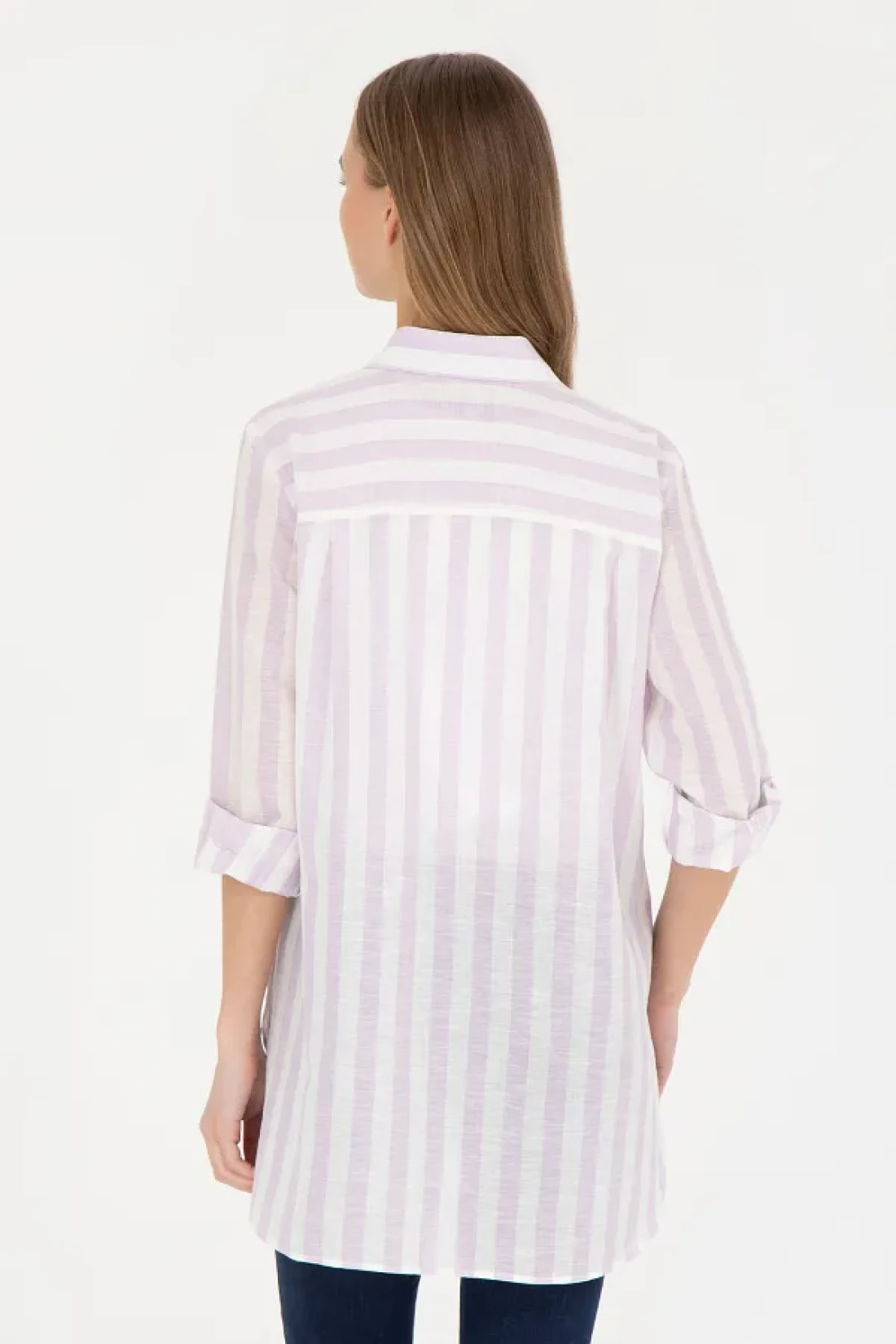 U.S. Polo Assn. قميص نسائي ذو مظهر كتان أرجواني - كم طويل50288408-VR034