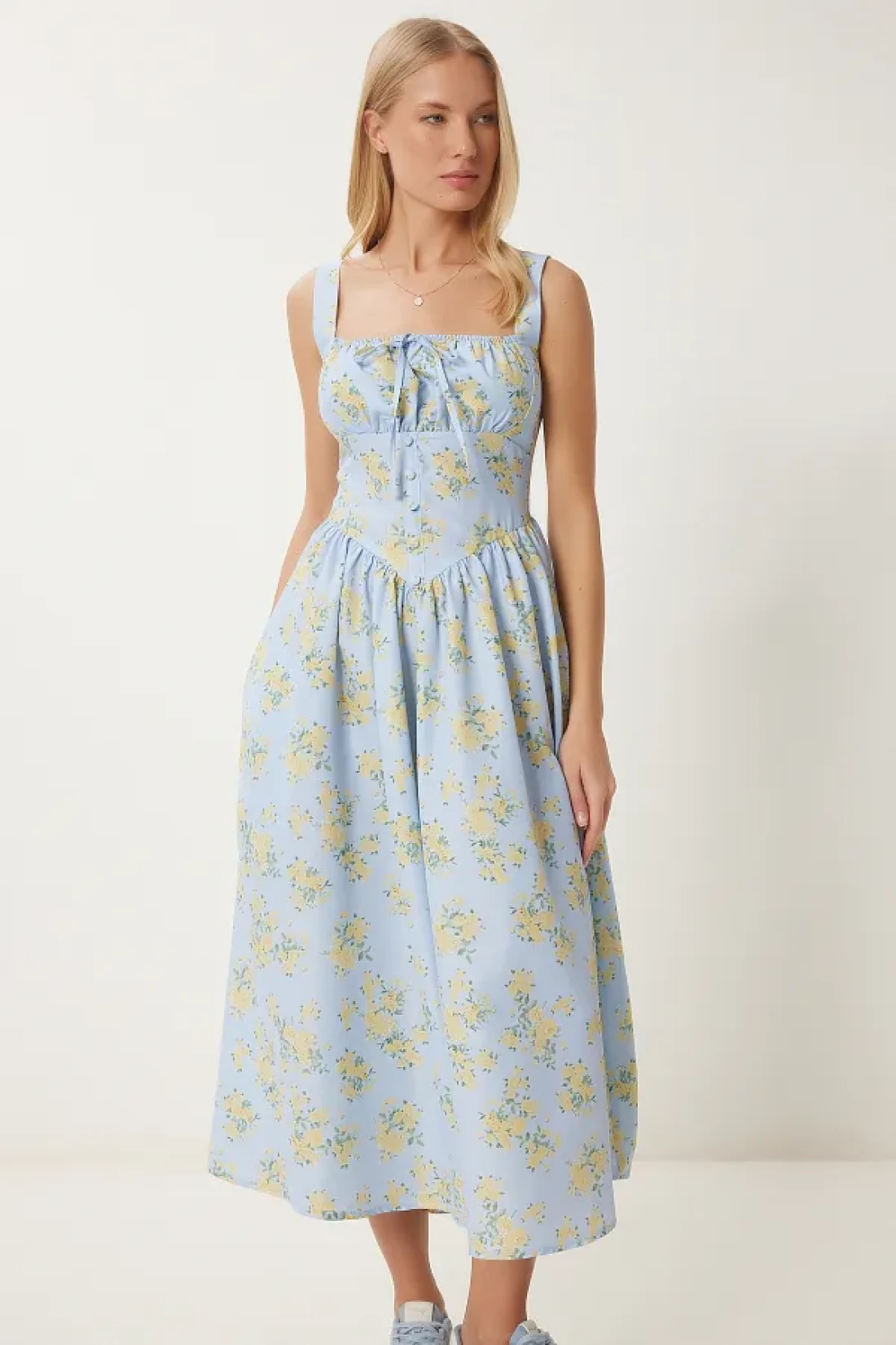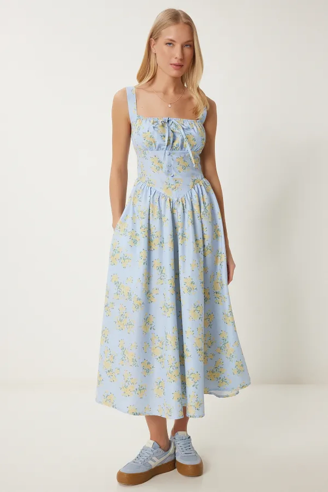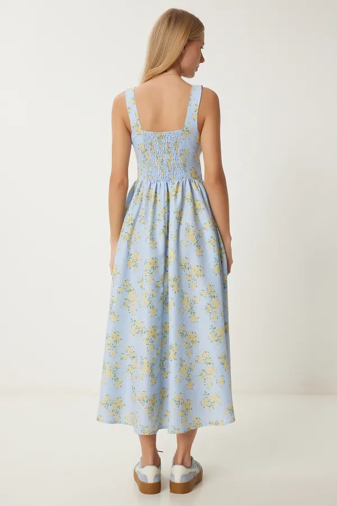 Happiness İstanbul فستان بوبلين صيفي متوسط الطول منقوش عليه زهور باللون الأزرق والأصفر للنساء UB00353