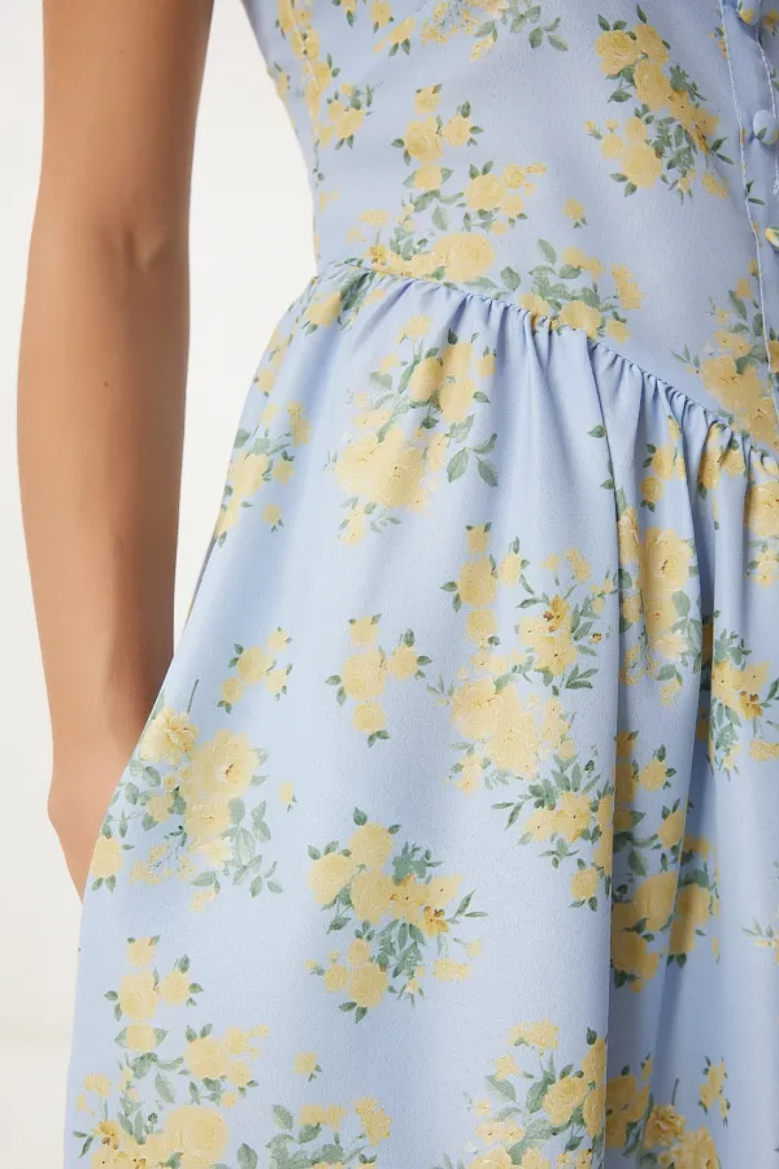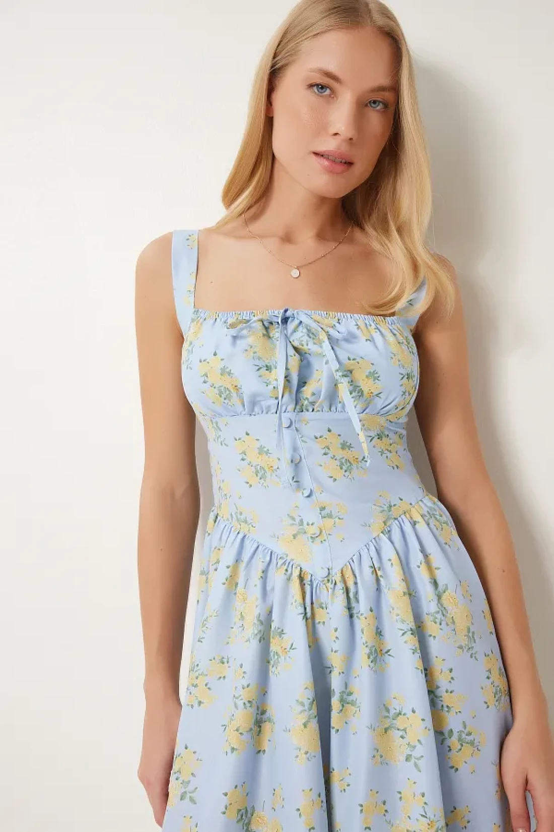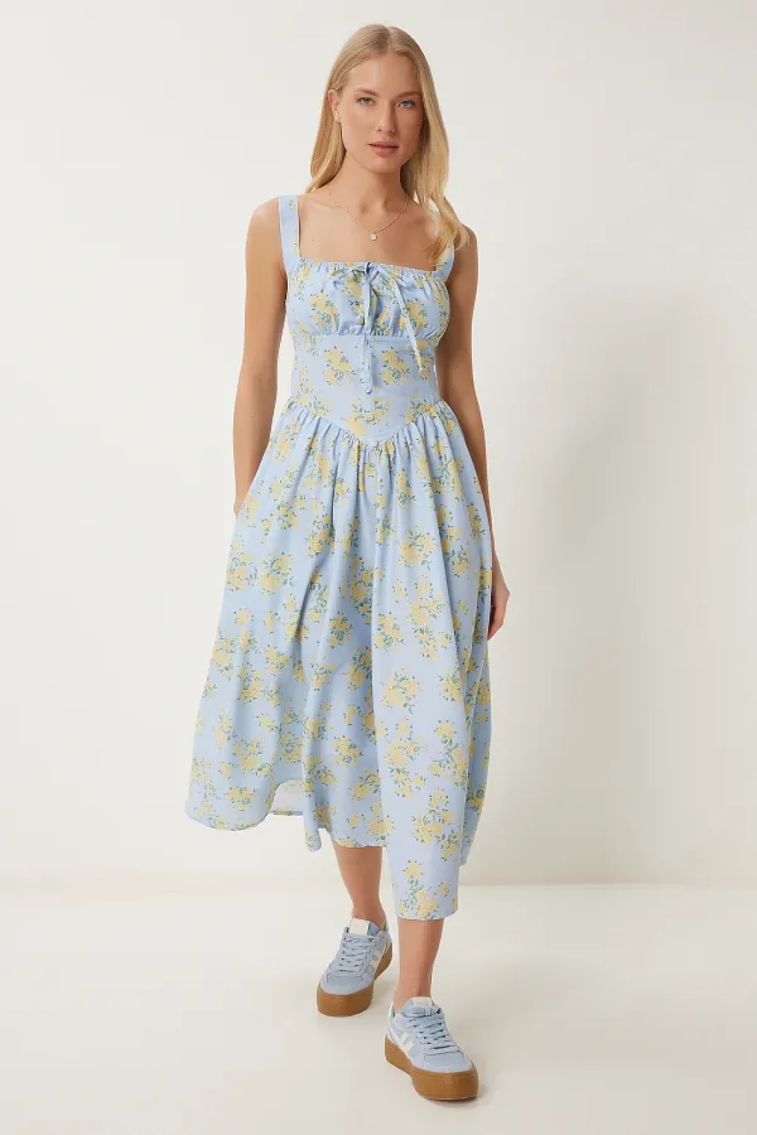 Happiness İstanbul فستان بوبلين صيفي متوسط الطول منقوش عليه زهور باللون الأزرق والأصفر للنساء UB00353