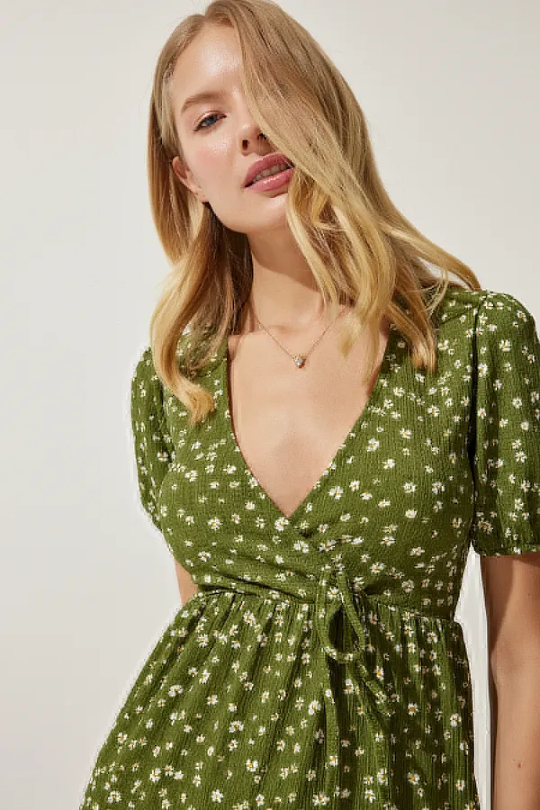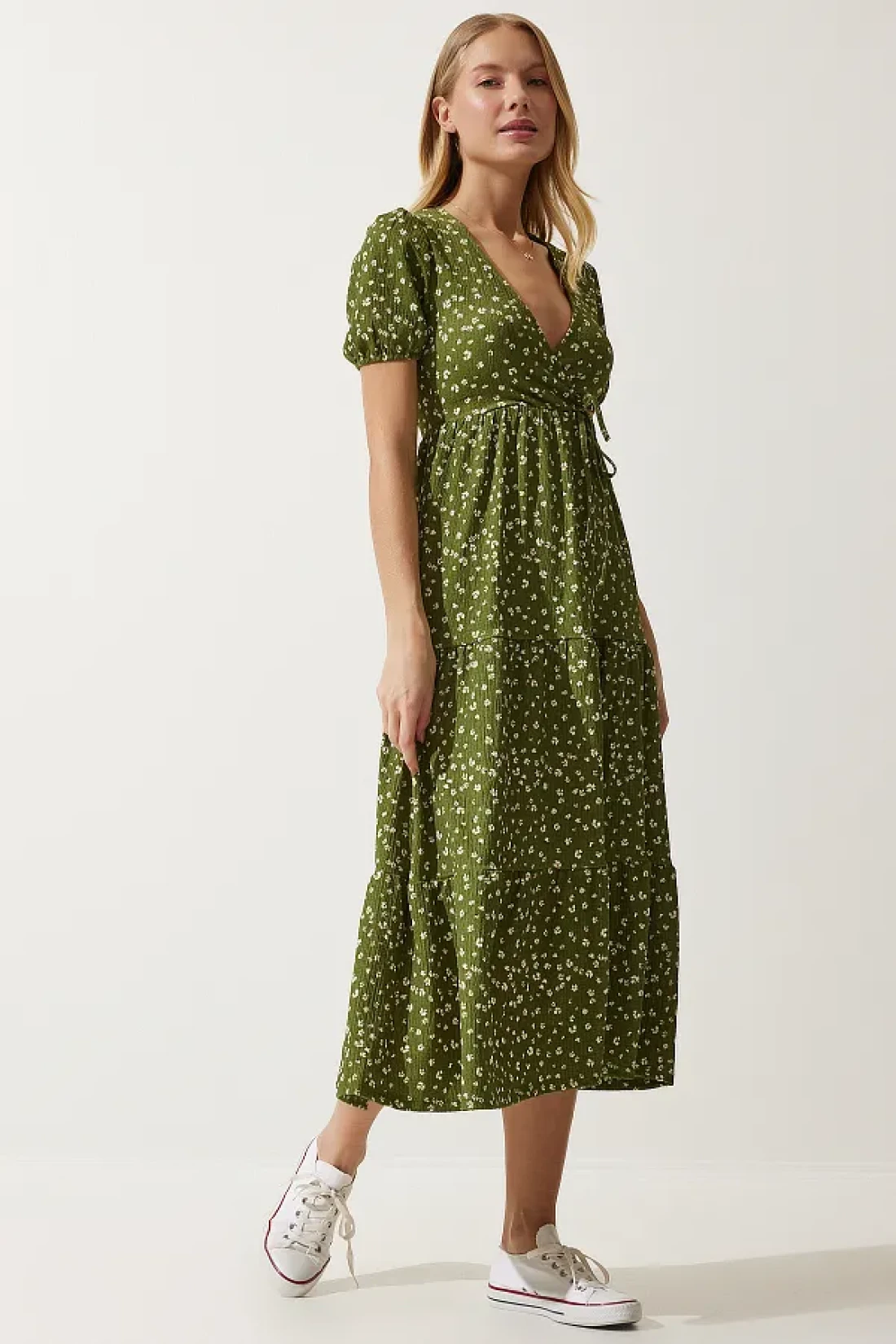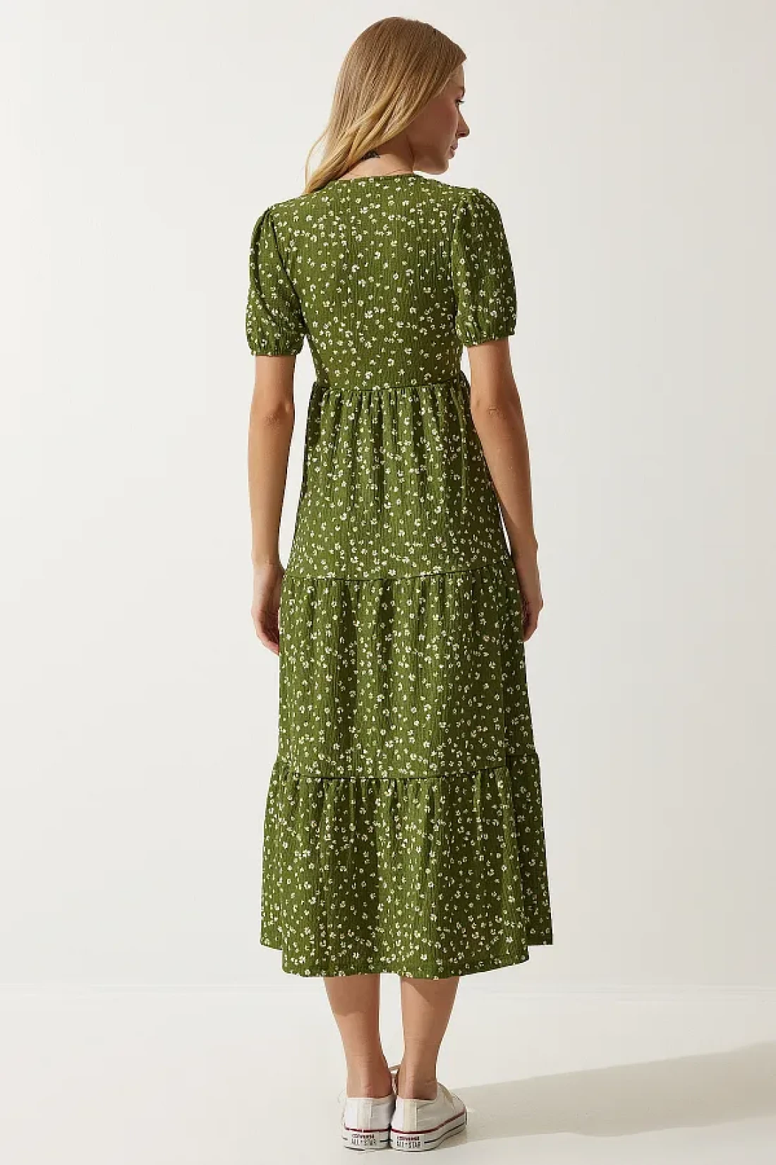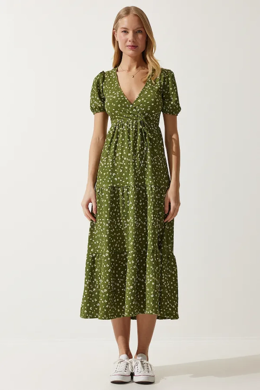 Happiness İstanbul فستان نسائي صيفي محبوك بياقة ملفوفة باللون الكاكي UB00267
