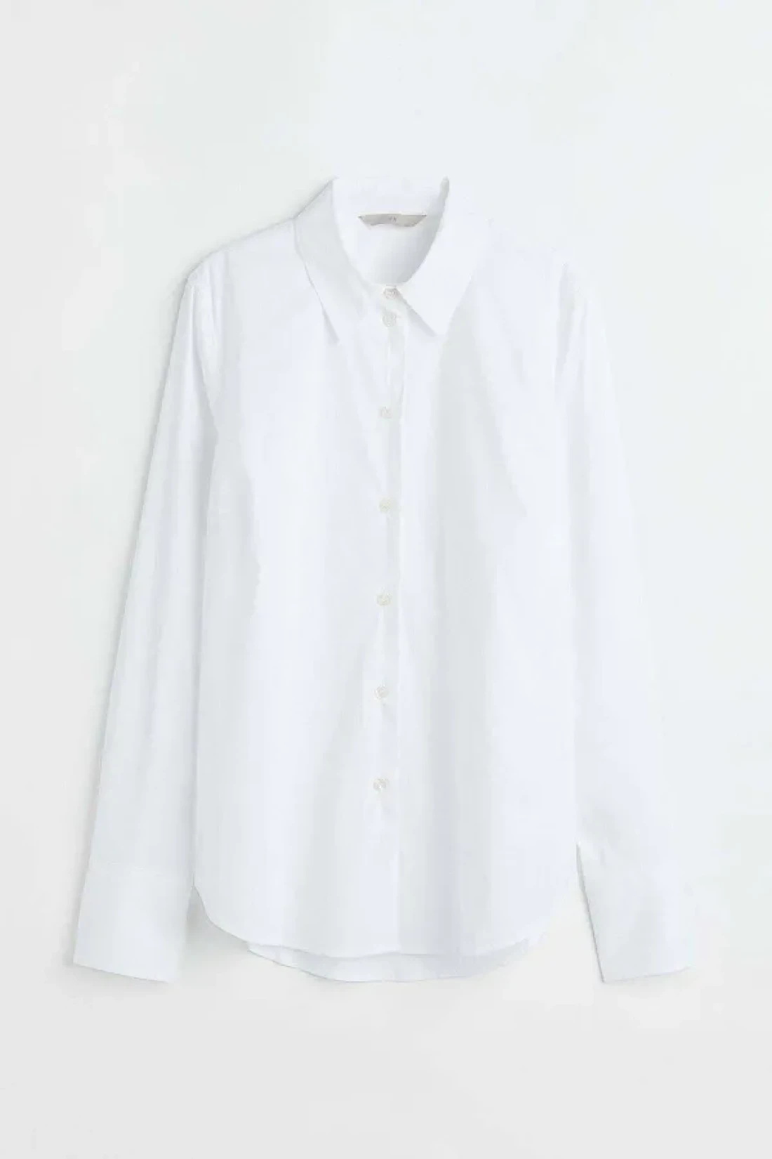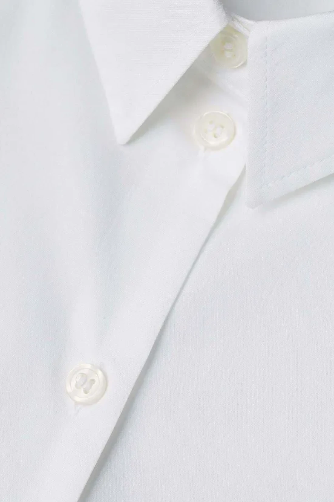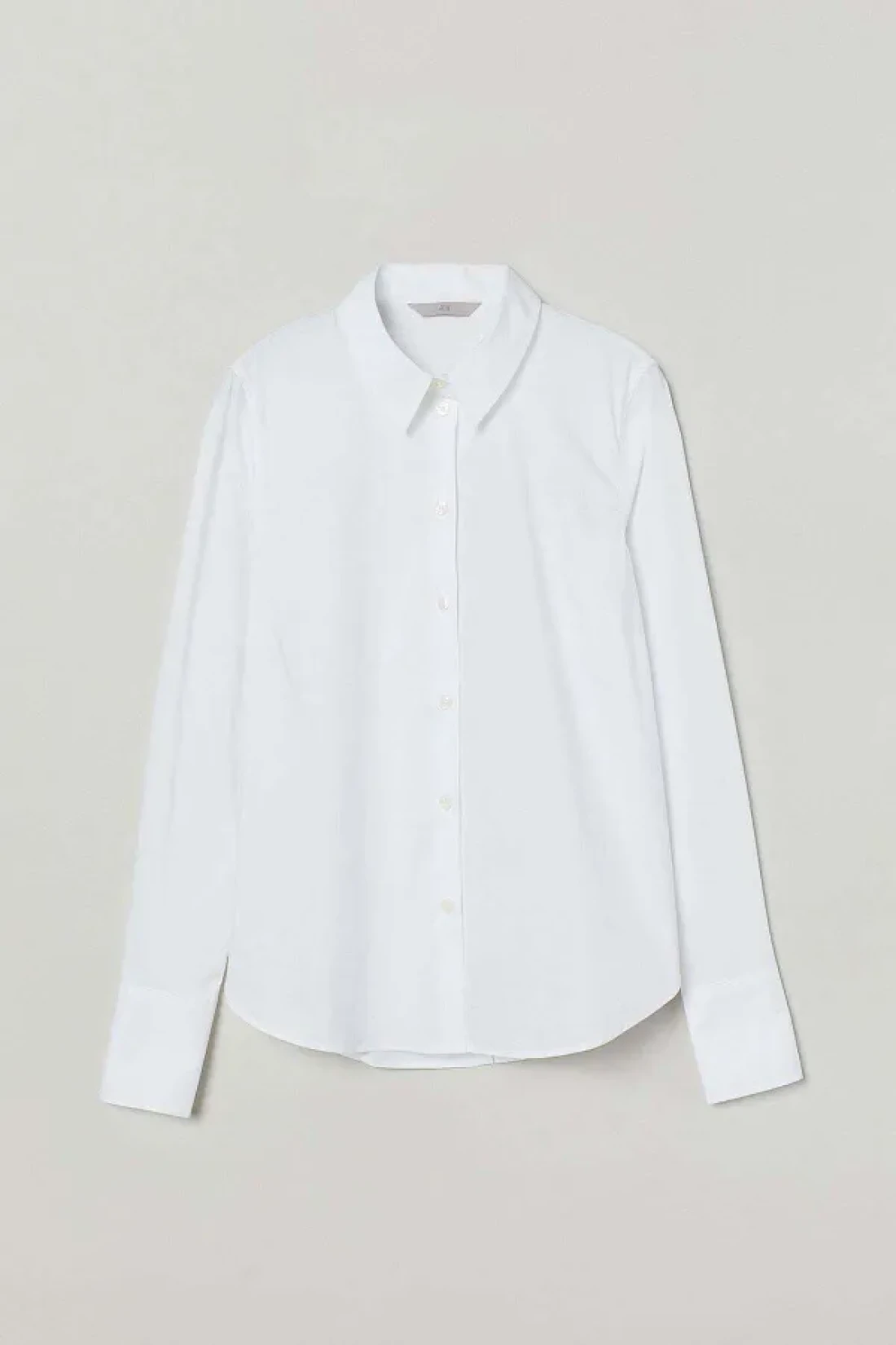 قميص بأكمام طويلة منسوج من مزيج القطن مع طوق وأزرار على طول الجزء الأمامي؛ نير في الخلف، وأزرار عند الأكمام وحاشية مستديرة.