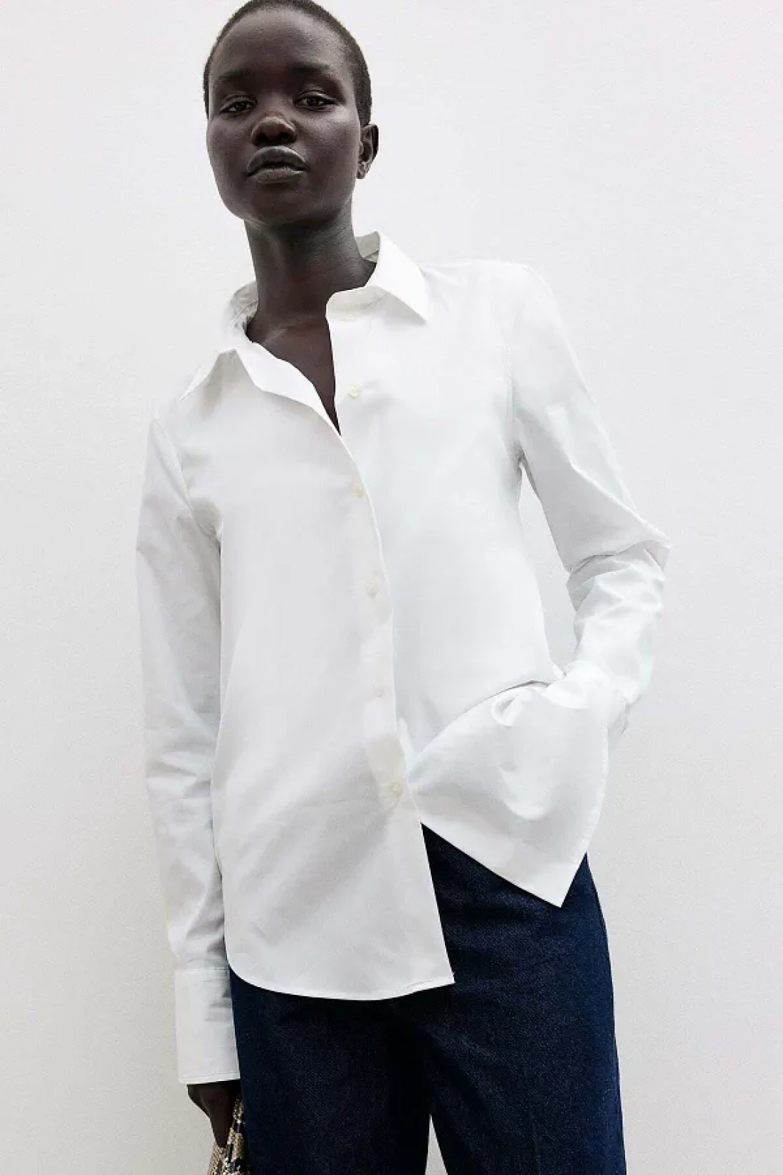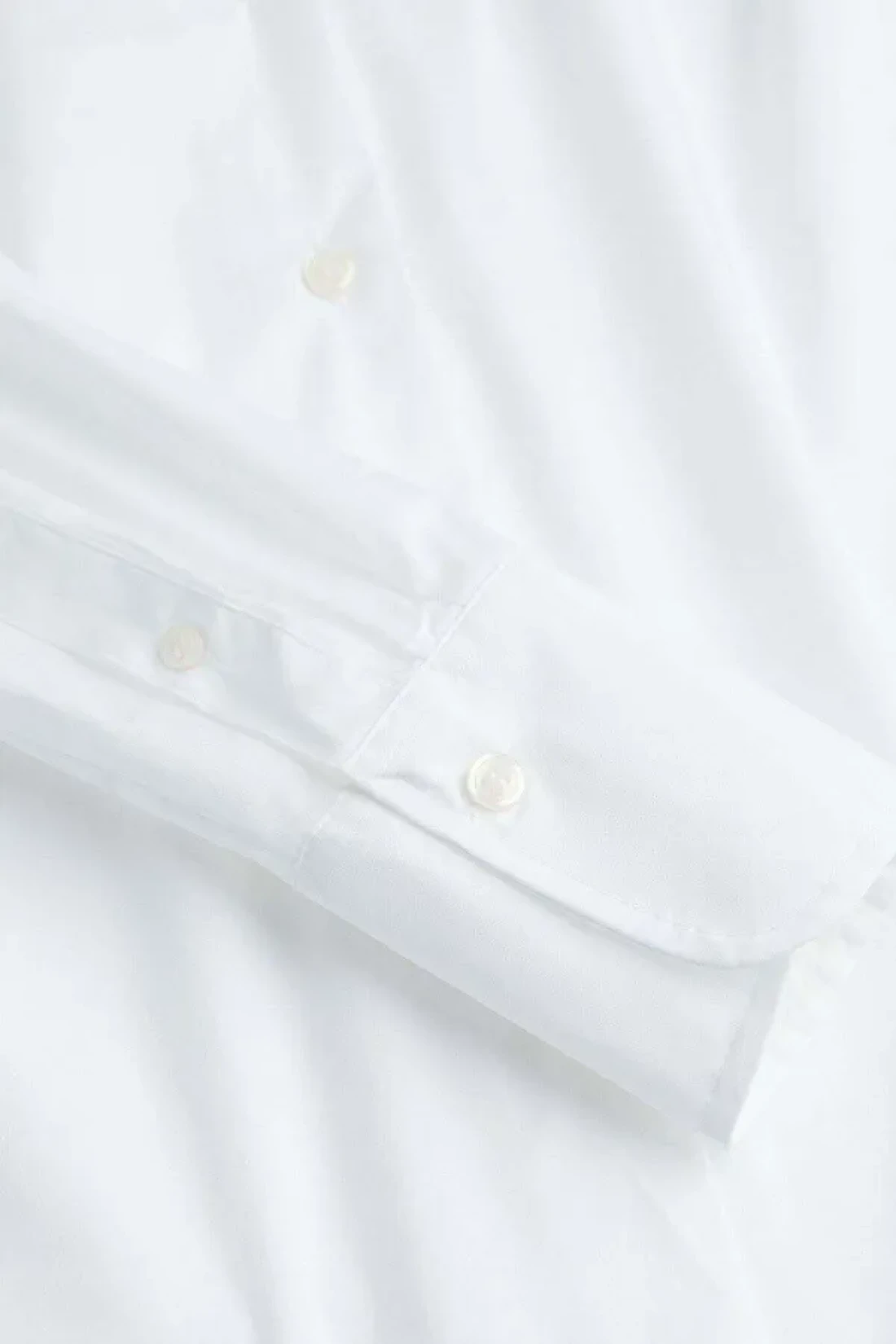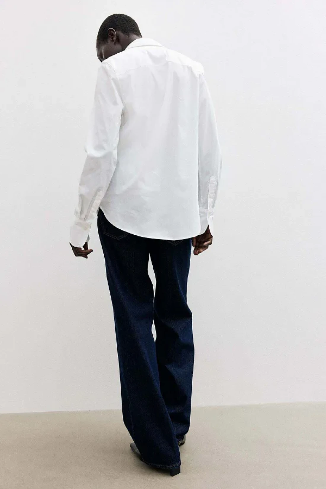 قميص بأكمام طويلة منسوج من مزيج القطن مع طوق وأزرار على طول الجزء الأمامي؛ نير في الخلف، وأزرار عند الأكمام وحاشية مستديرة.