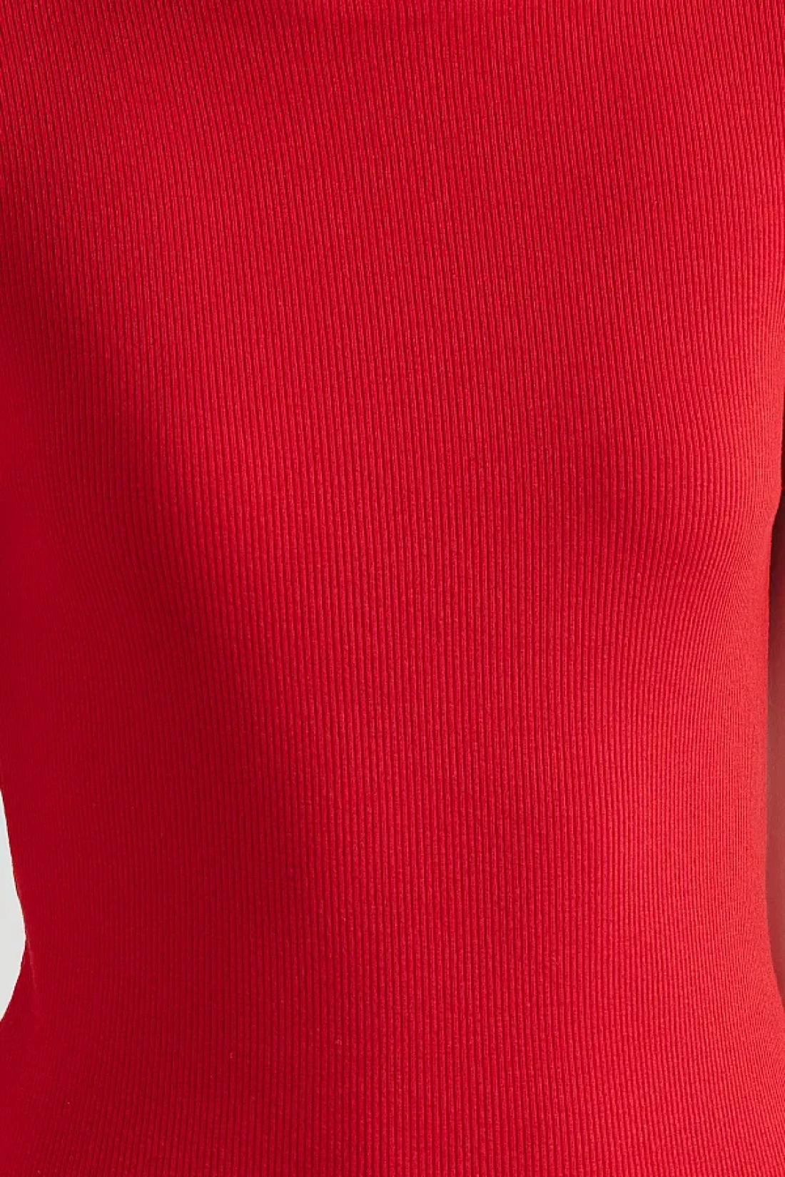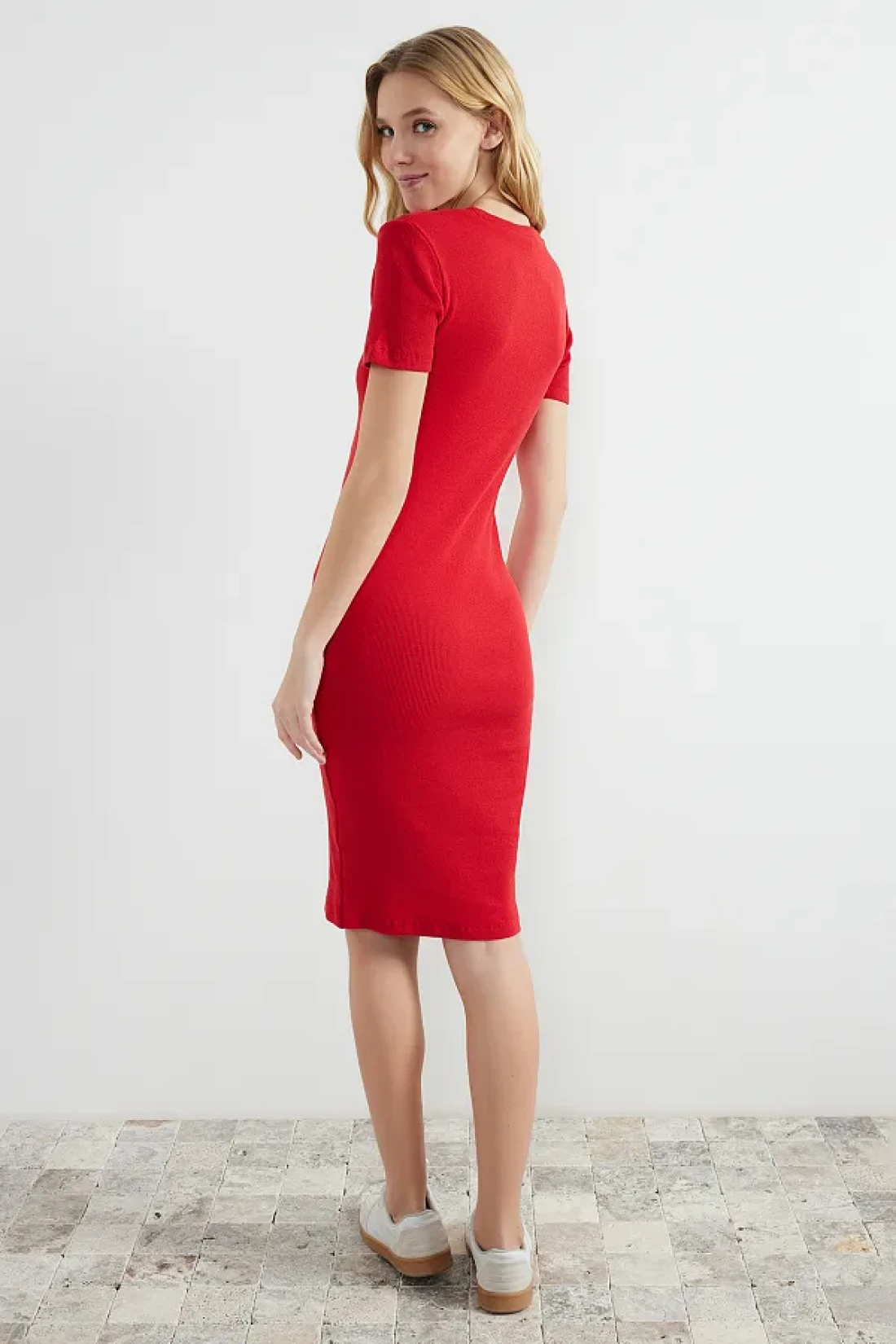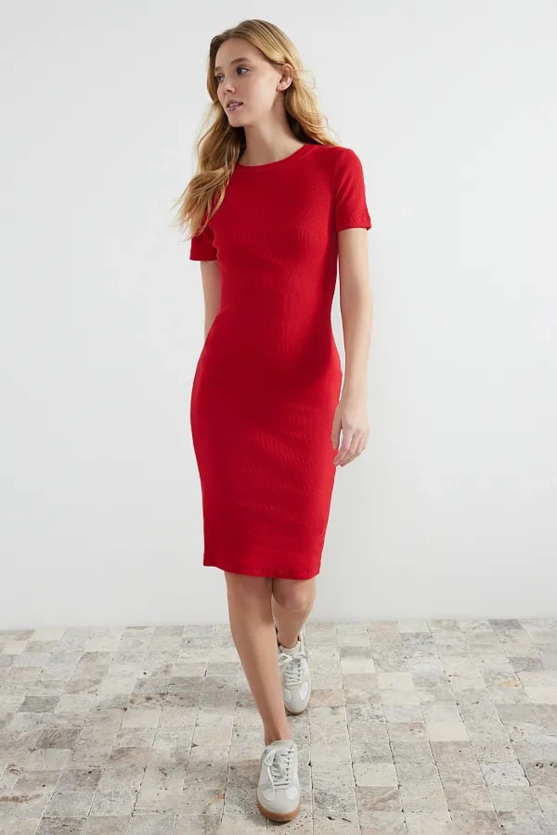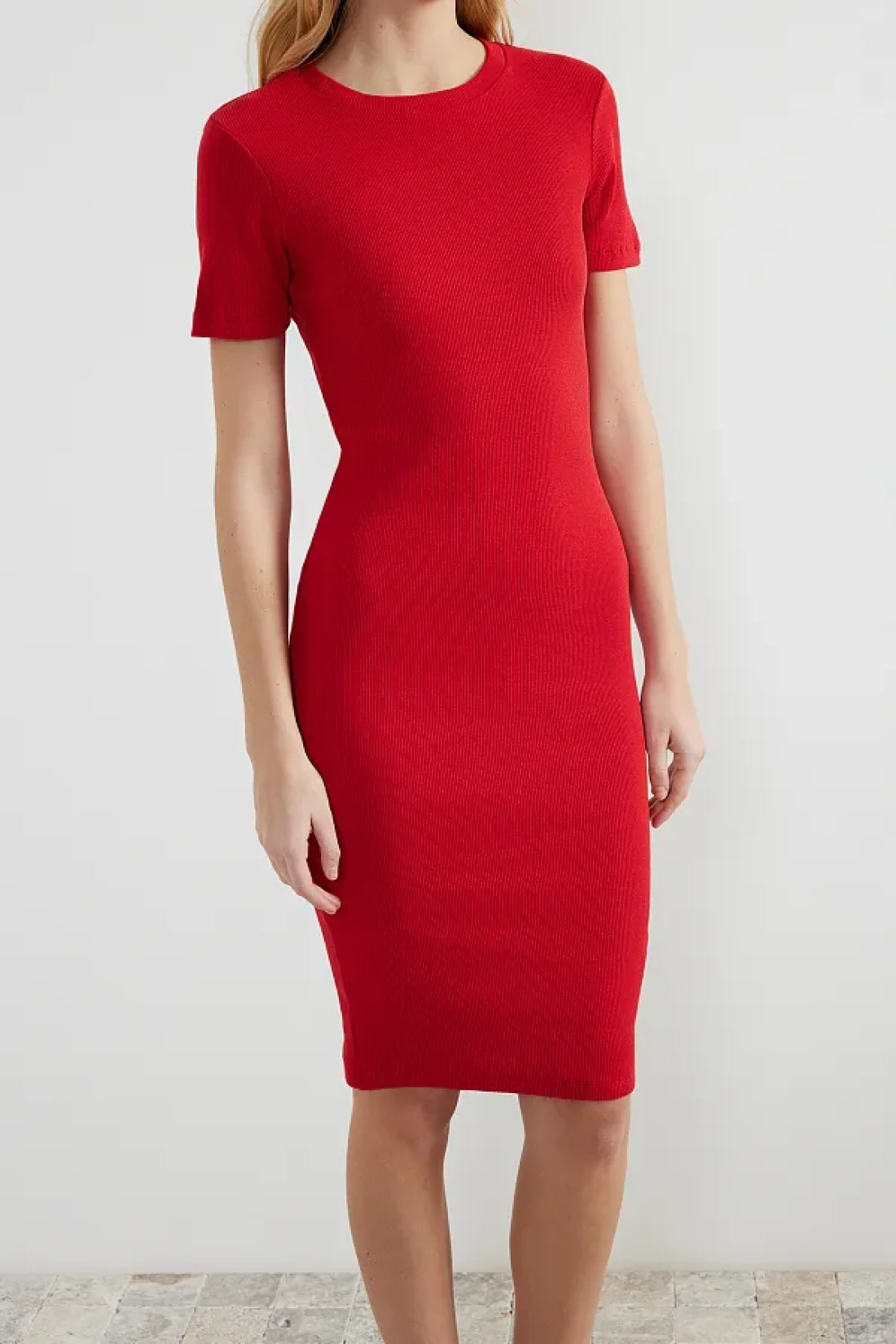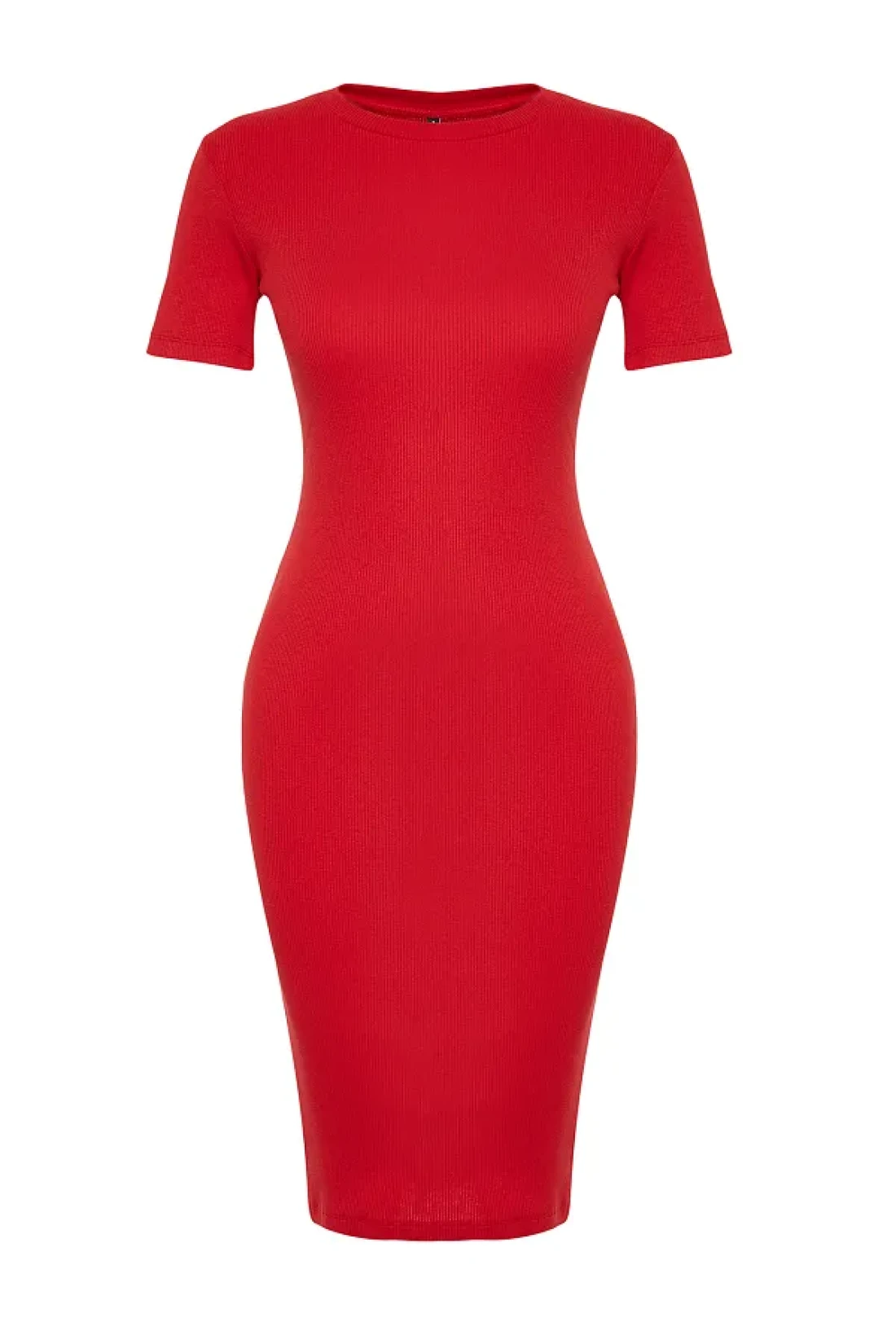 Collection فستان رصاص ميدي محبوك قابل للتمدد برقبة دائرية باللون الأحمر TWOSS24EL00486