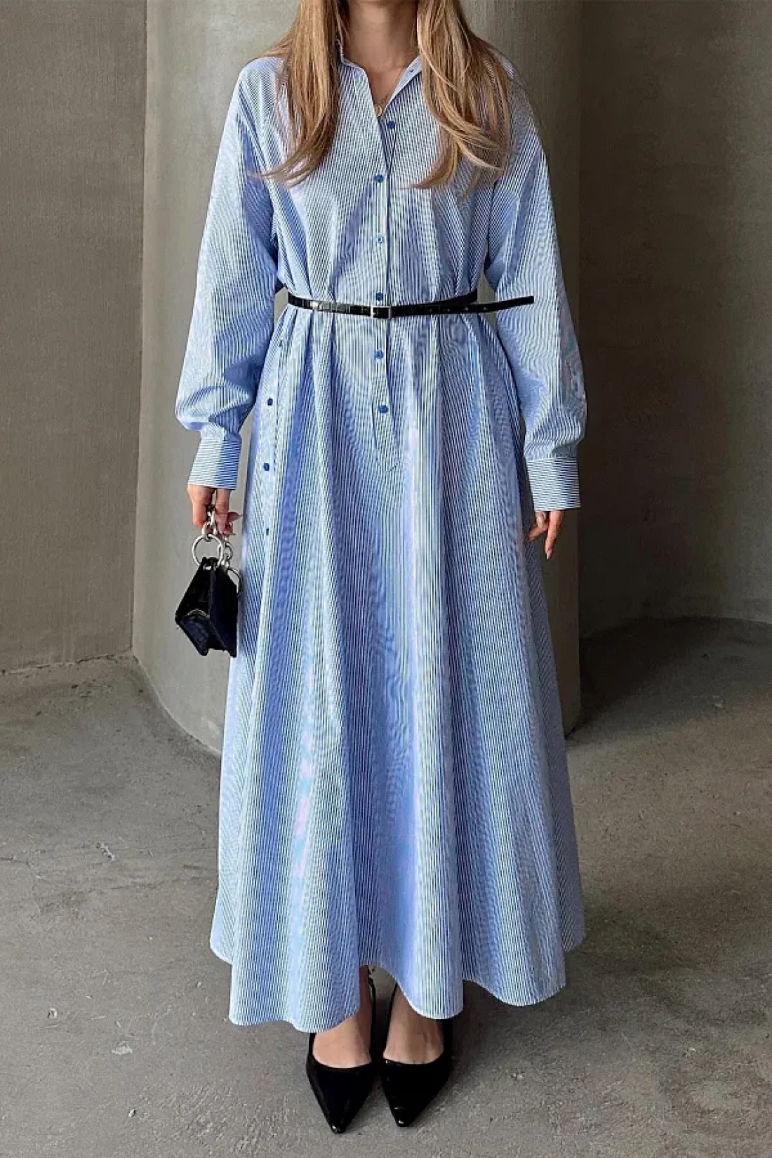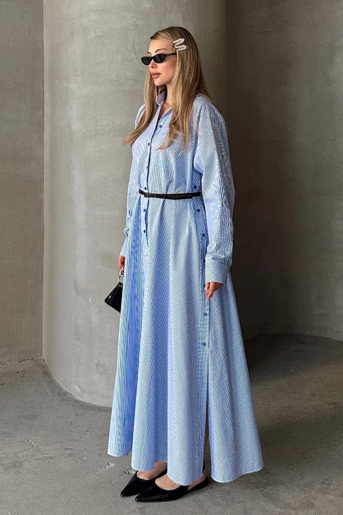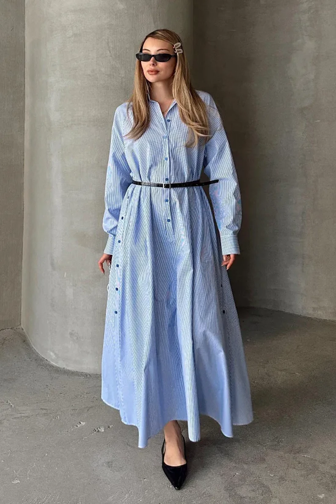 Olcay فستان بوبلين فضفاض بتفاصيل أزرار على الجانب أزرق-أبيض 9316-E
