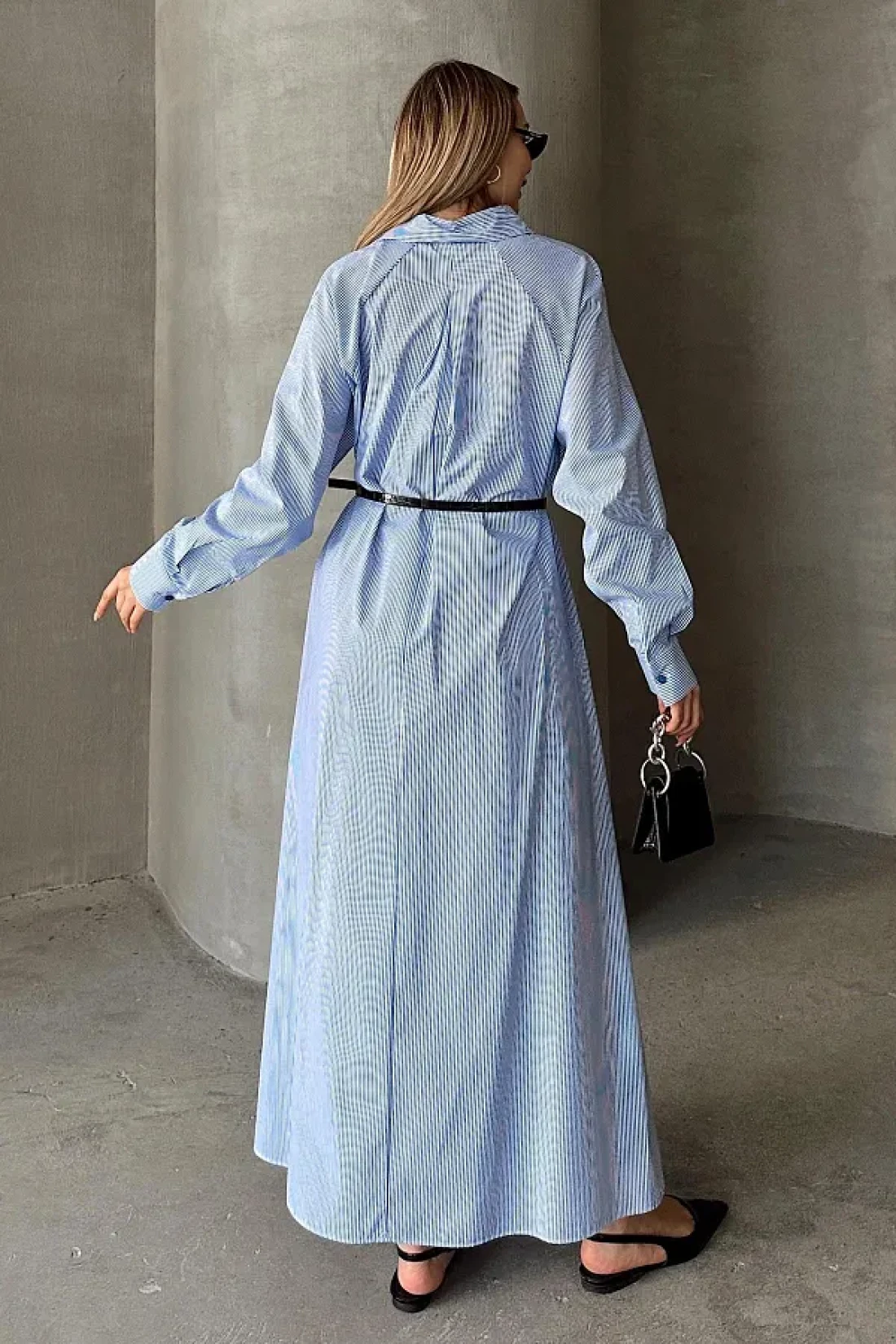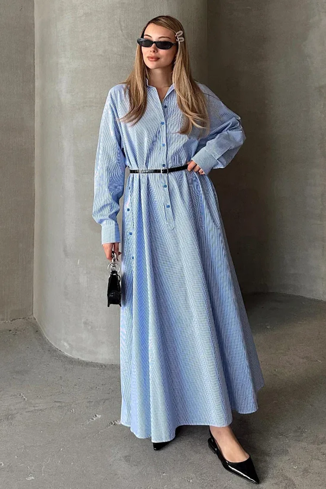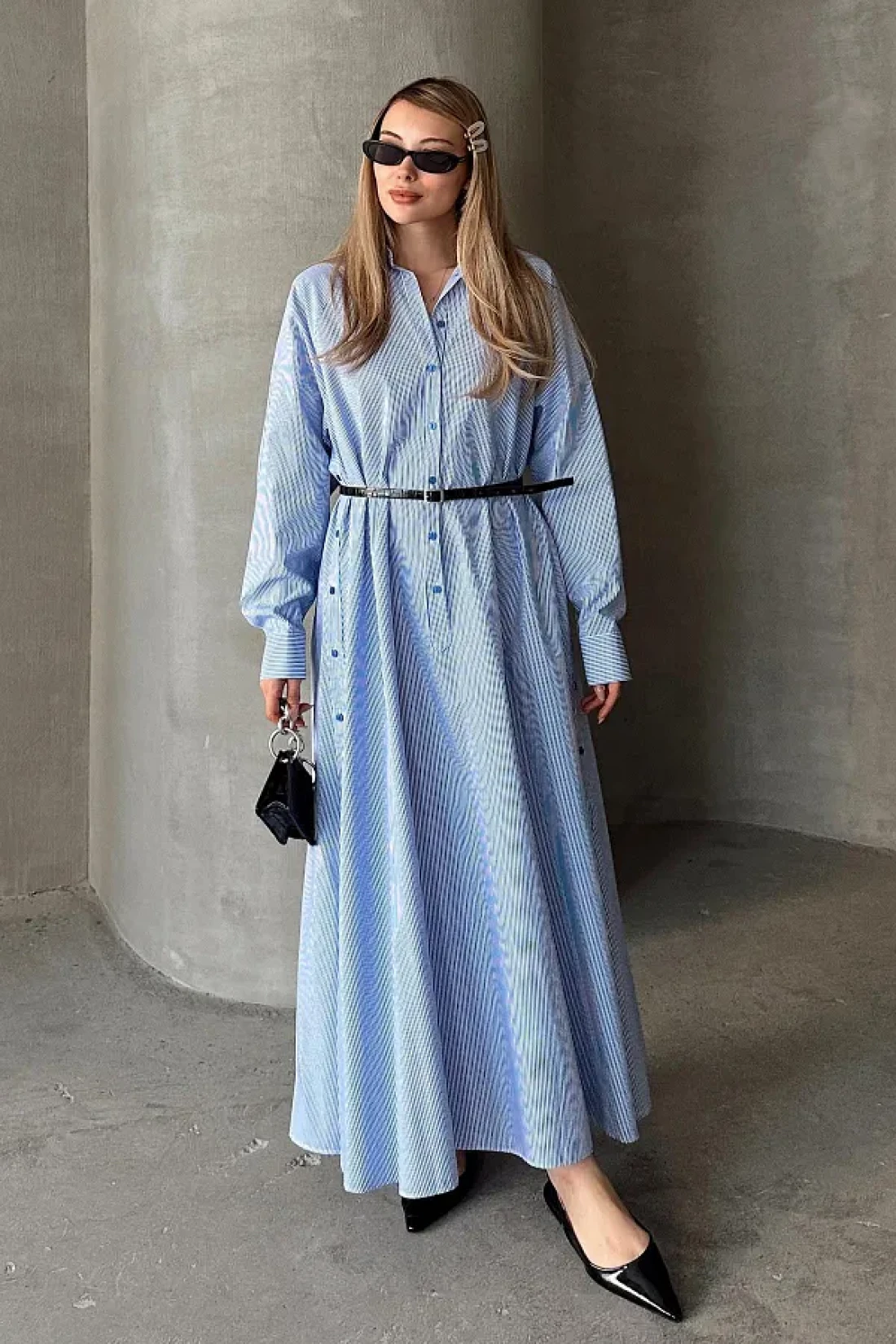 Olcay فستان بوبلين فضفاض بتفاصيل أزرار على الجانب أزرق-أبيض 9316-E