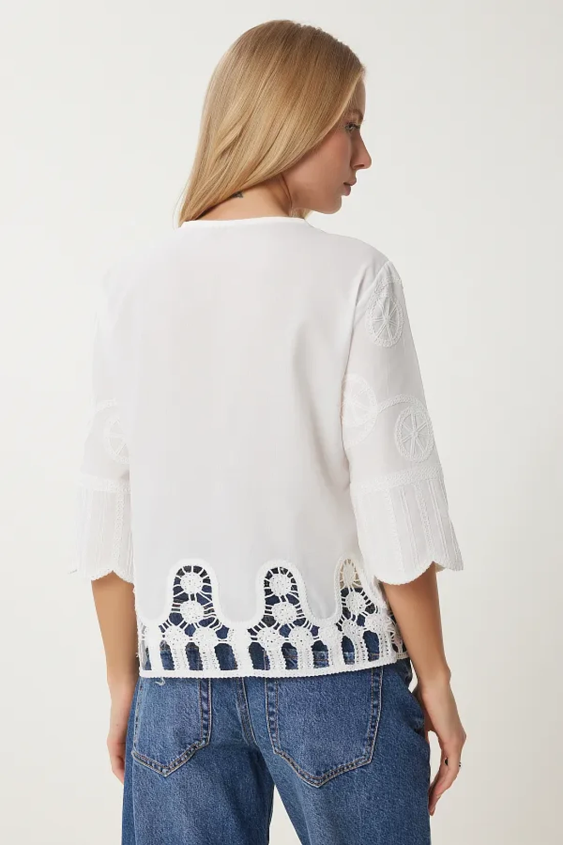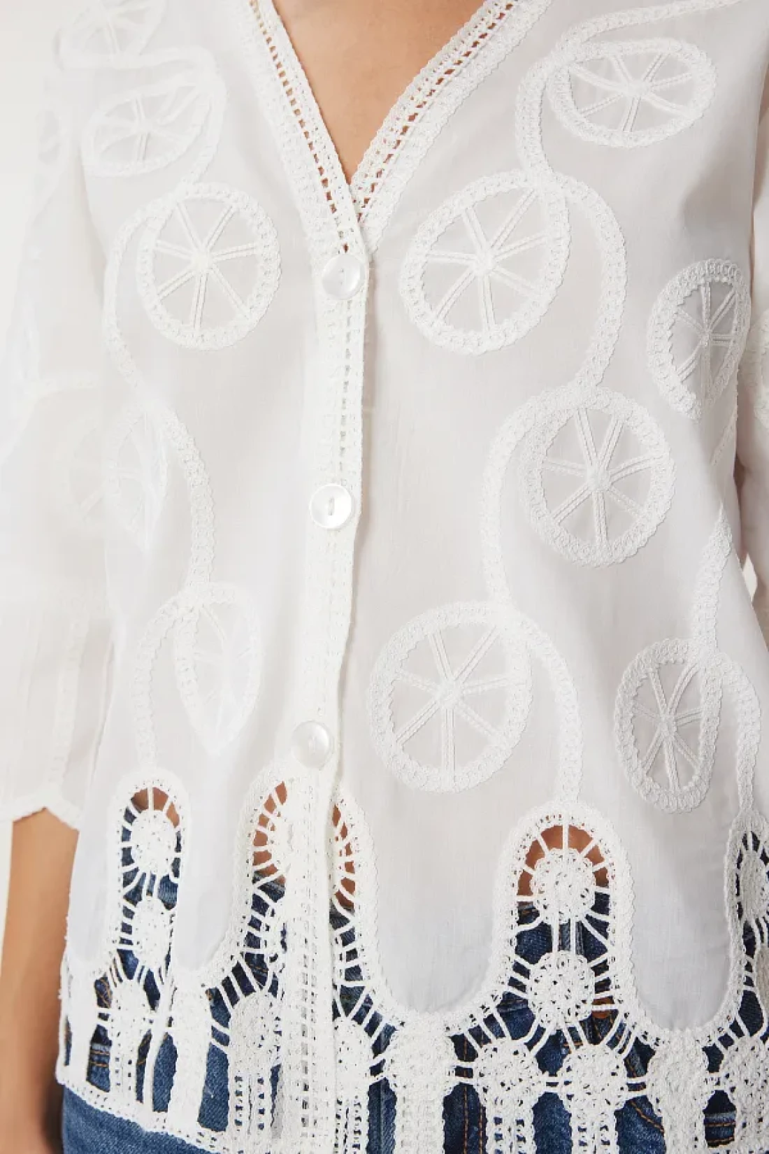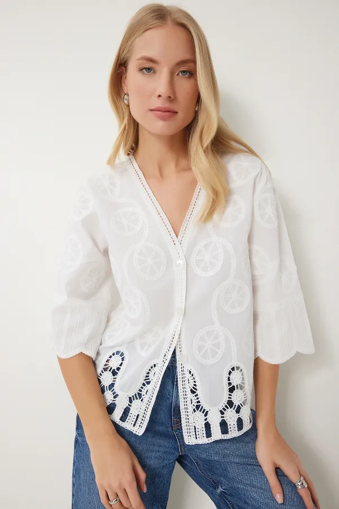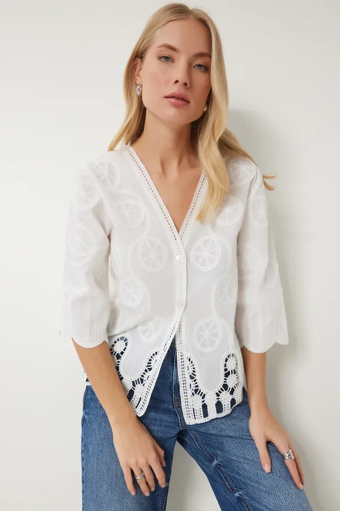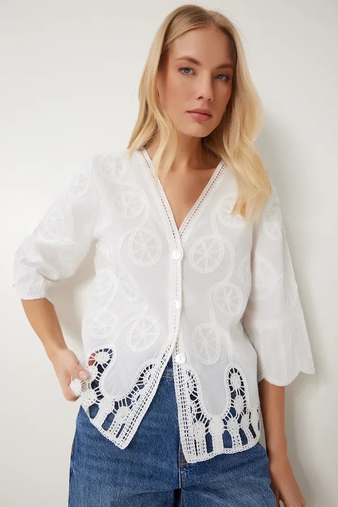 Happiness İstanbul بلوزة قميص منسوجة بيضاء رومانسية مطرزة للنساء QS00012
