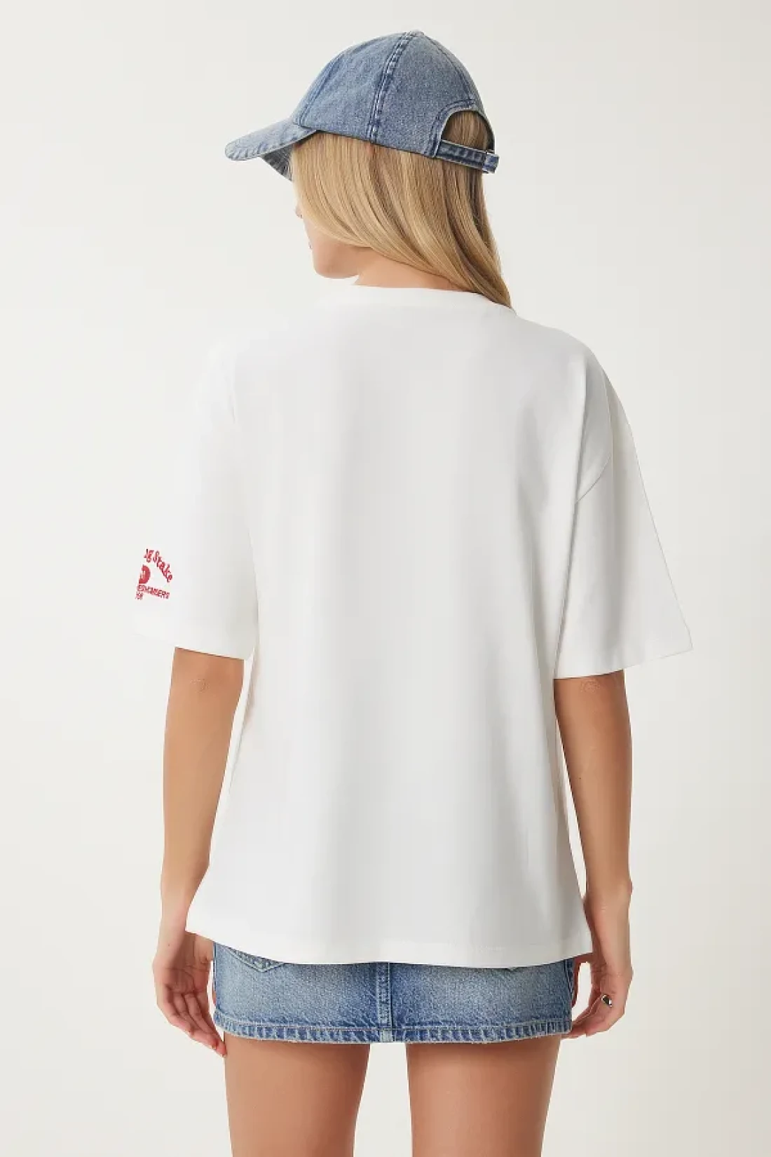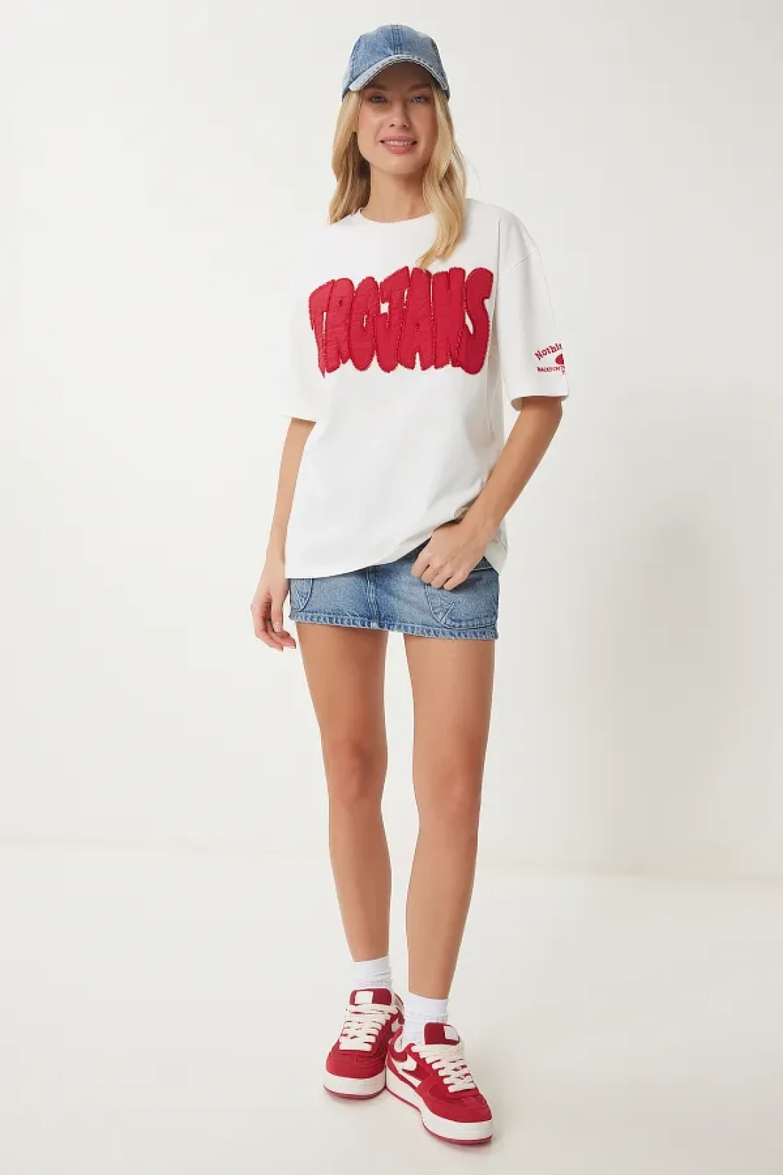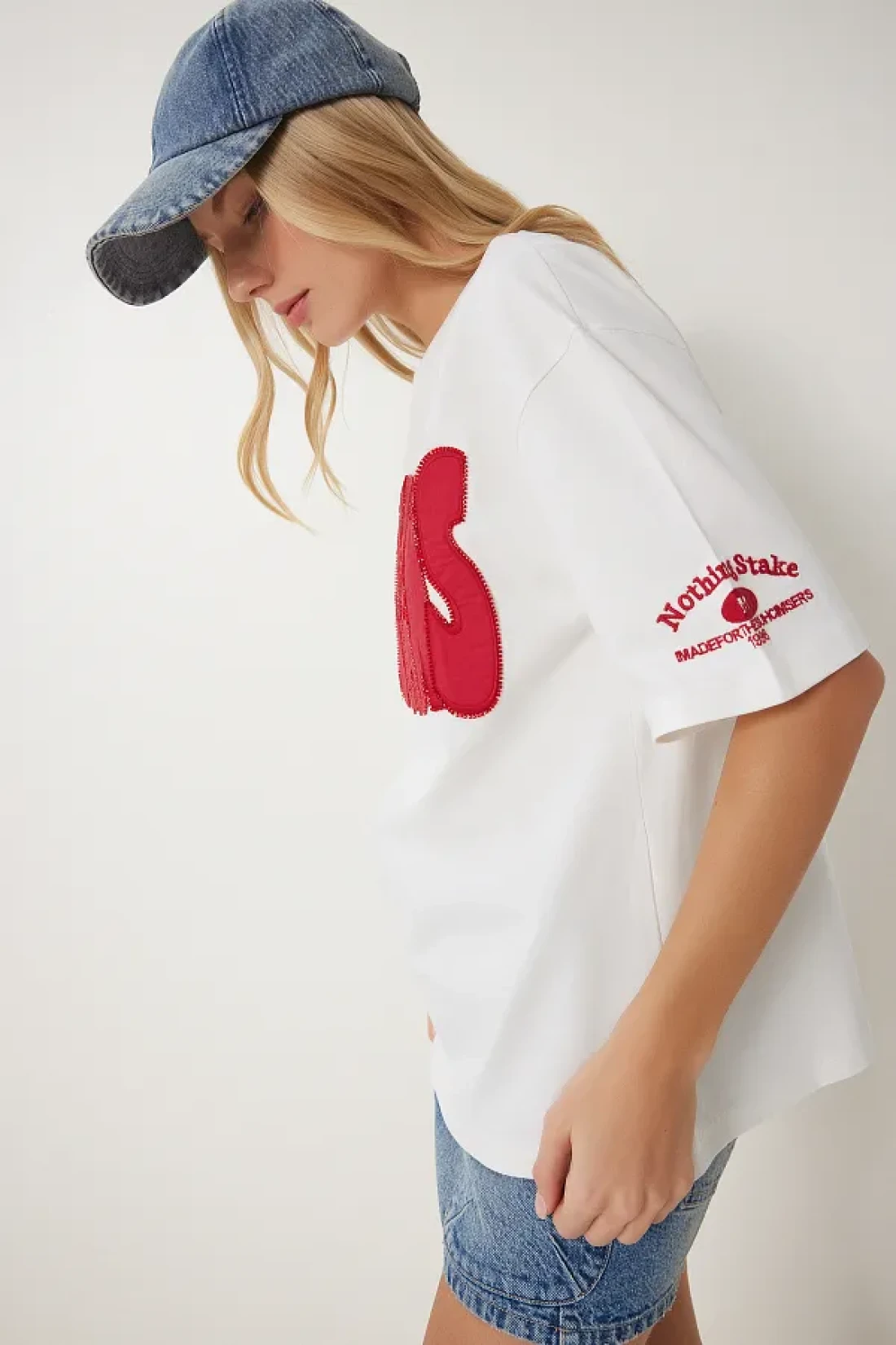 Happiness İstanbul تي شيرت نسائي من القطن مطرز بشعار إكرو CR00463