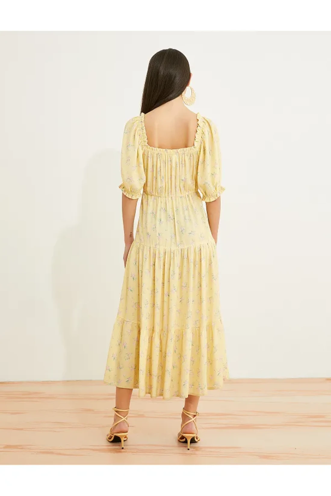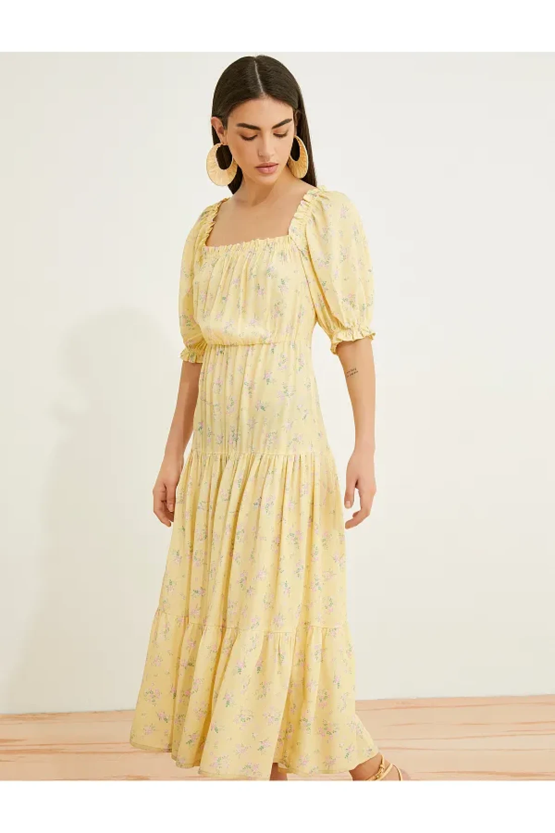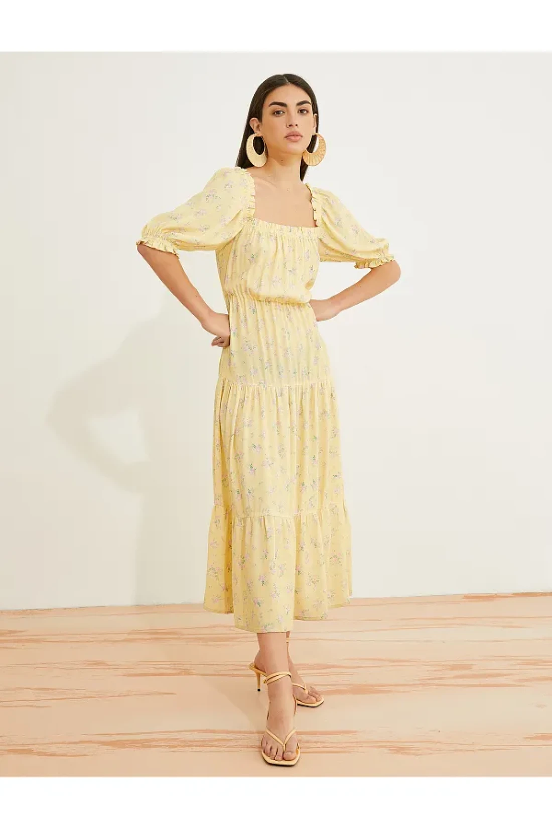 الفساتين الأنيقة والملونة رائجة جدًا هذا الموسم! ستجعلك الأكمام القصيرة من البالون، والياقة المربعة، والفستان المتوسط الطول، والزهري، والفيسكوز تبرز بمظهرك الأنيق.
