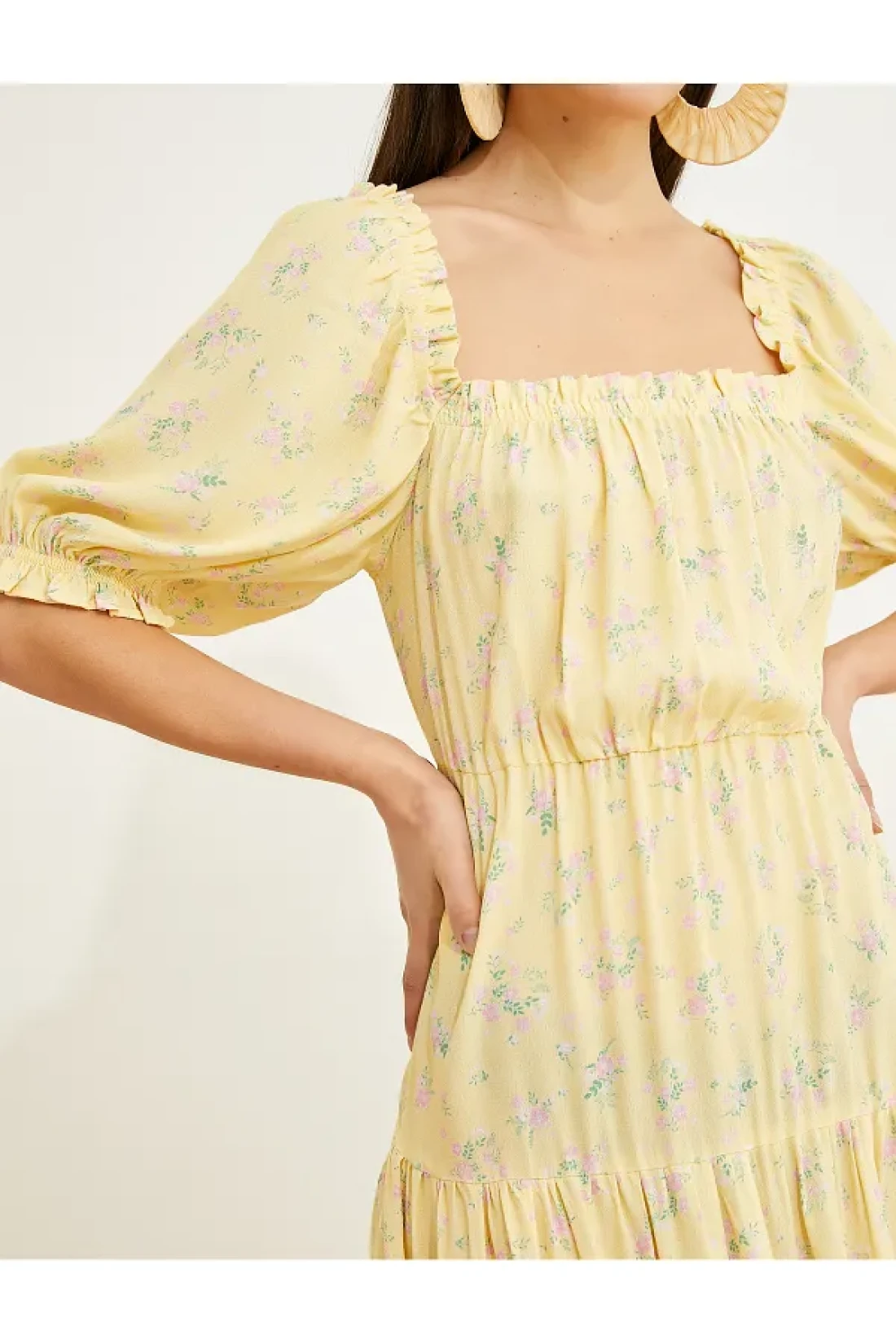 Koton فستان متوسط الطول من الفيسكوز بياقة مربعة وأكمام قصيرة بالون