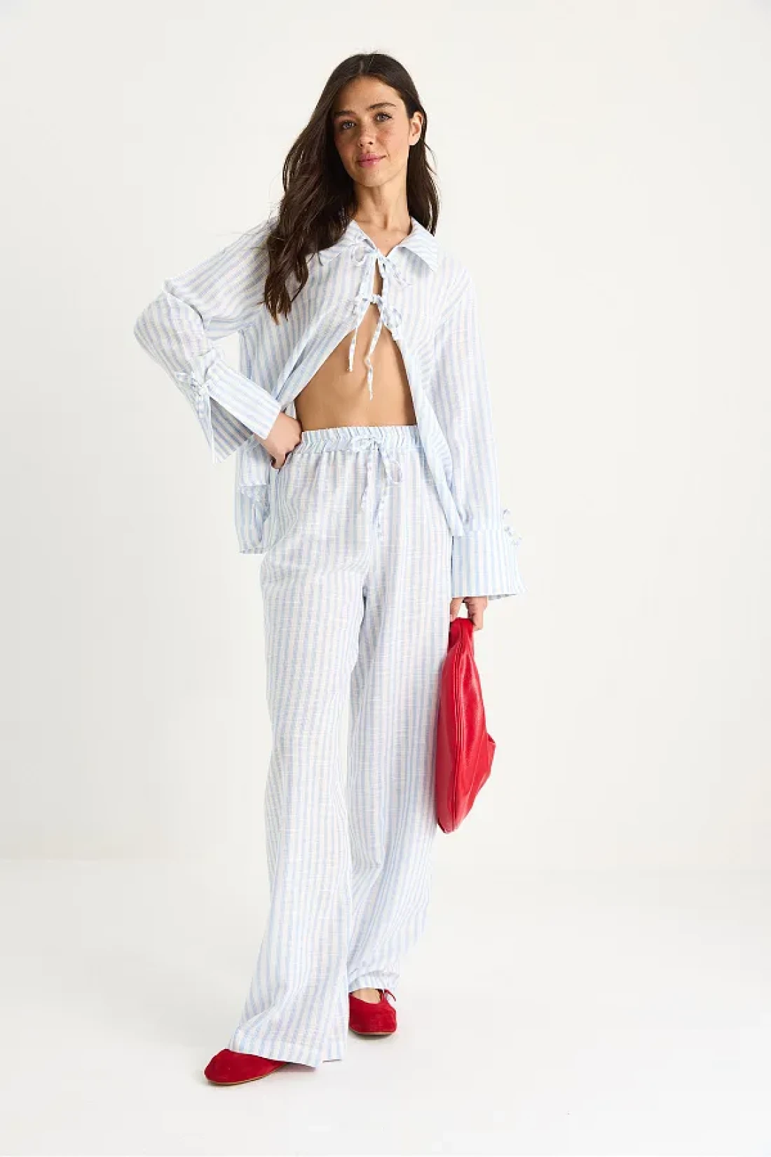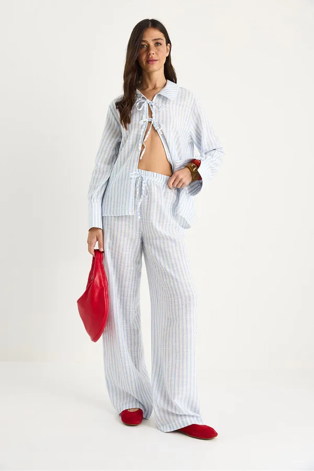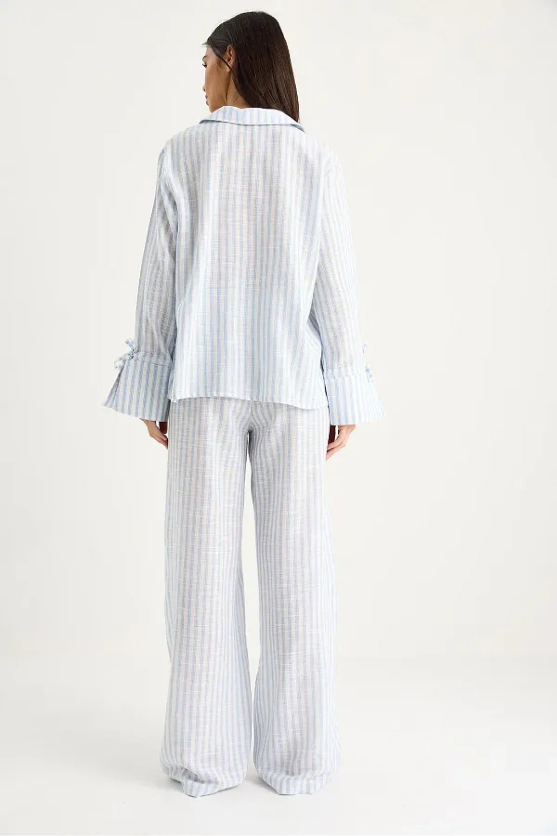 Bianco Lucci بدلة نسائية صيفية مخططة ذات أساور كبيرة ومفصلة من القطن 36471 60283357