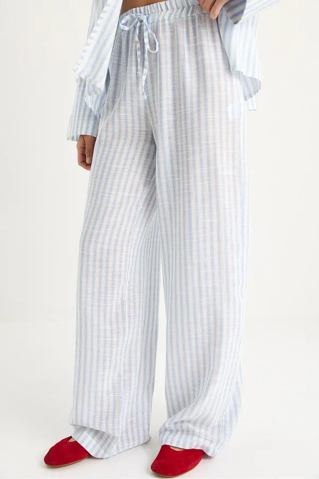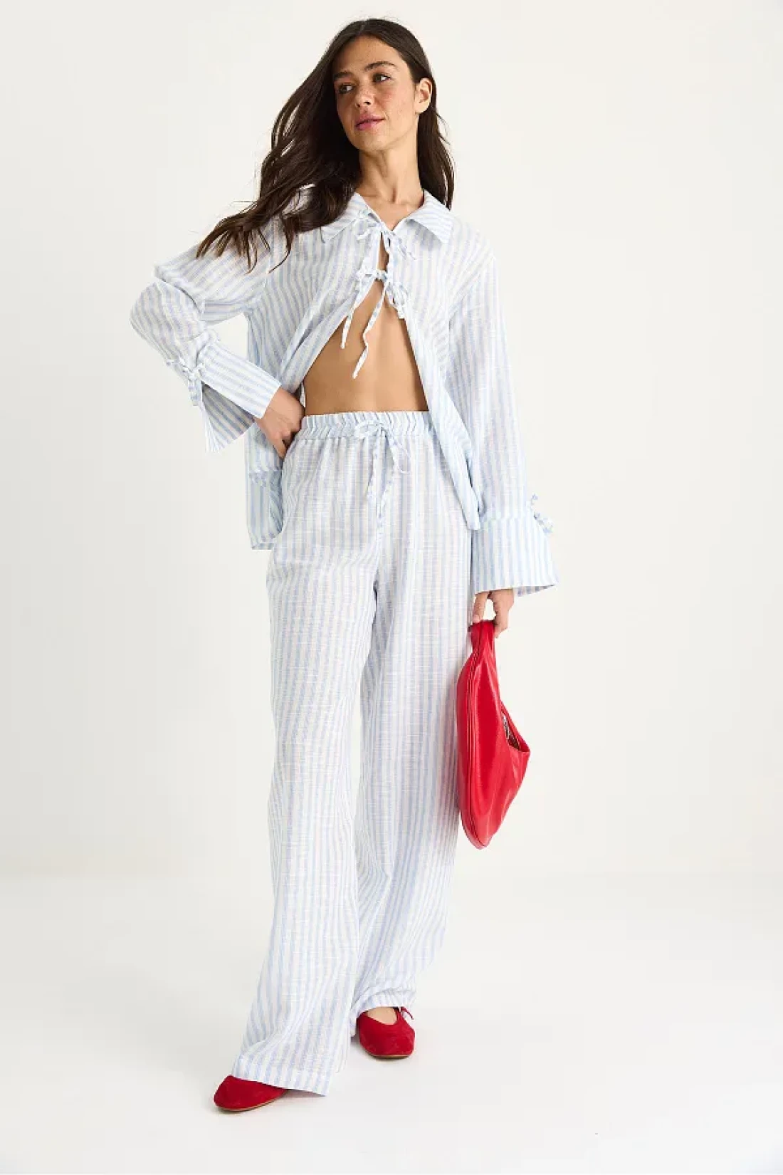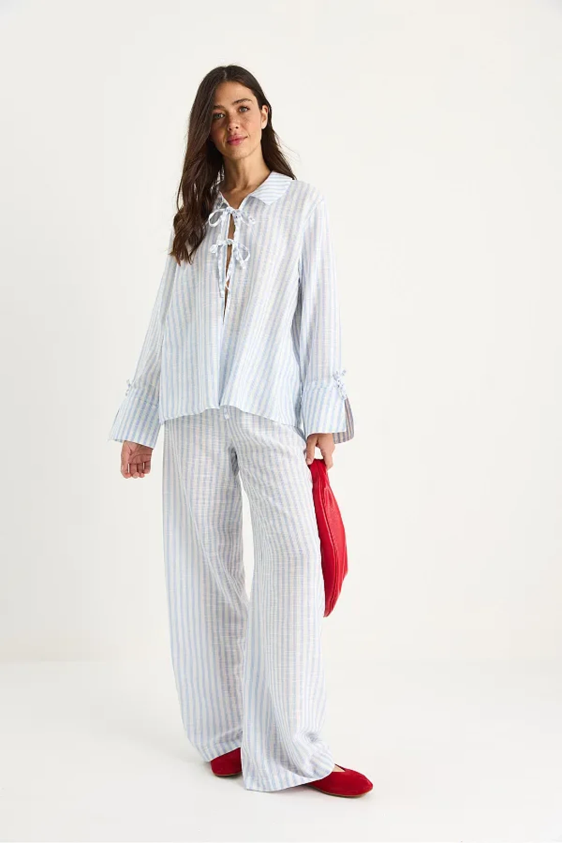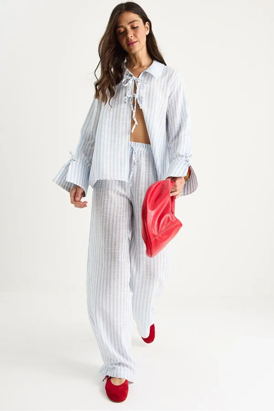 Bianco Lucci بدلة نسائية صيفية مخططة ذات أساور كبيرة ومفصلة من القطن 36471 60283357