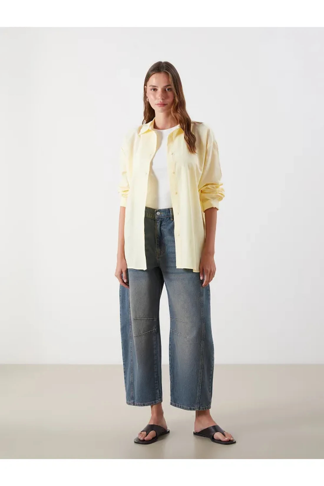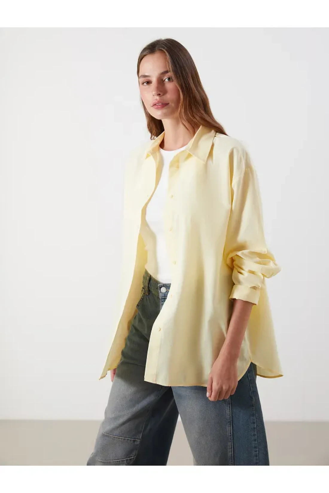 وصف المنتج: قميص بأكمام طويلة، قصة فضفاضة قميص. أزرار في الأمام. مصنوع من قماش القطن 100% معلومات الموديل: الصدر: 84 سم، الخصر: 62 سم، الأرداف: 87 سم، الارتفاع: 173 سم، الموديل يرتدي مقاس المنتج.