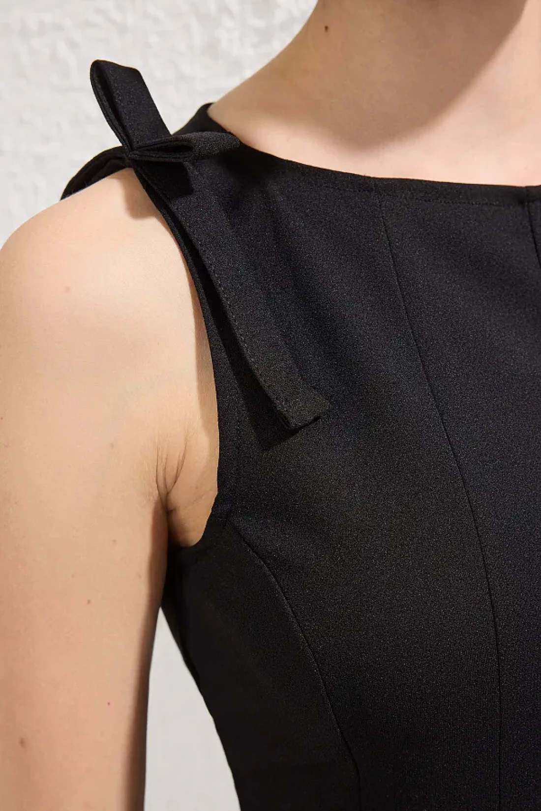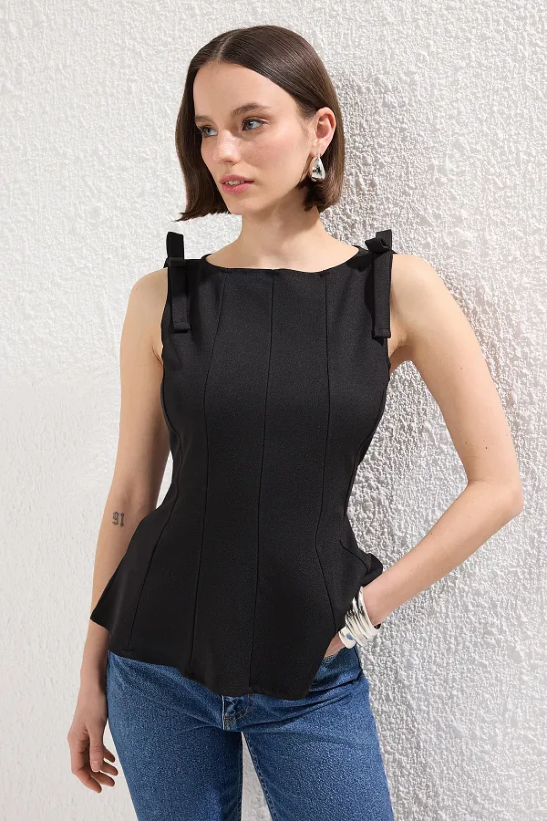 Collection بلوزة سوداء بأكمام بيبلوم وخصر صفر - محبوكة بفيونكة - TWOSS25BZ00482