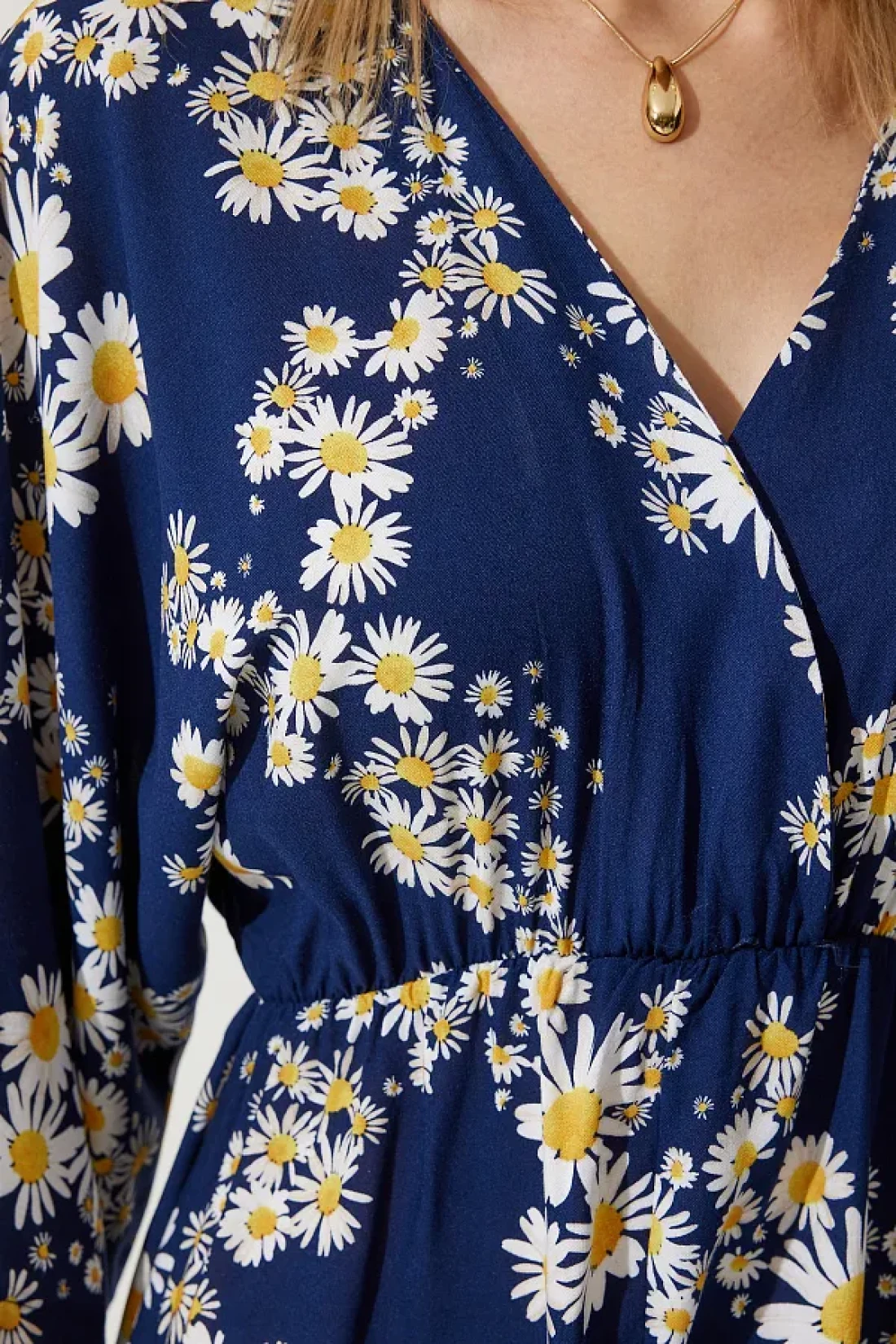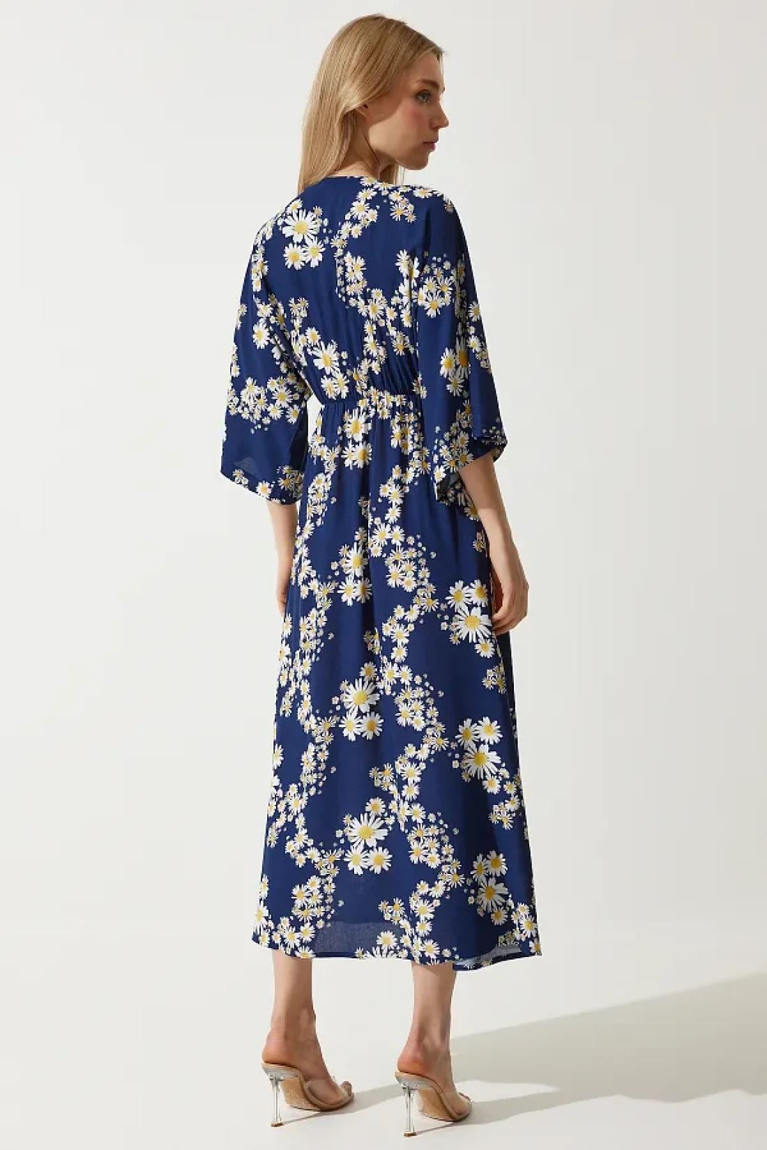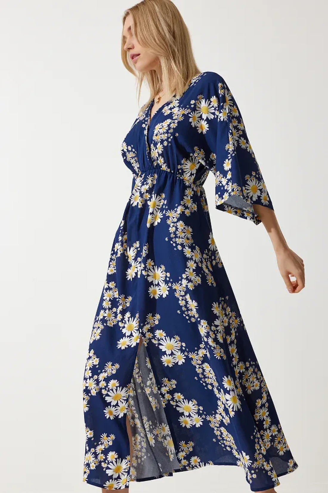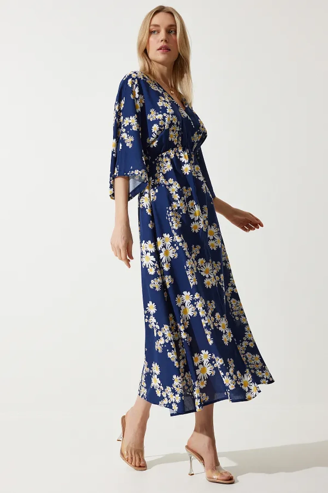 Happiness İstanbul فستان نسائي صيفي من الفسكوز بياقة ملفوفة باللون الأزرق الداكن والأصفر DK00166