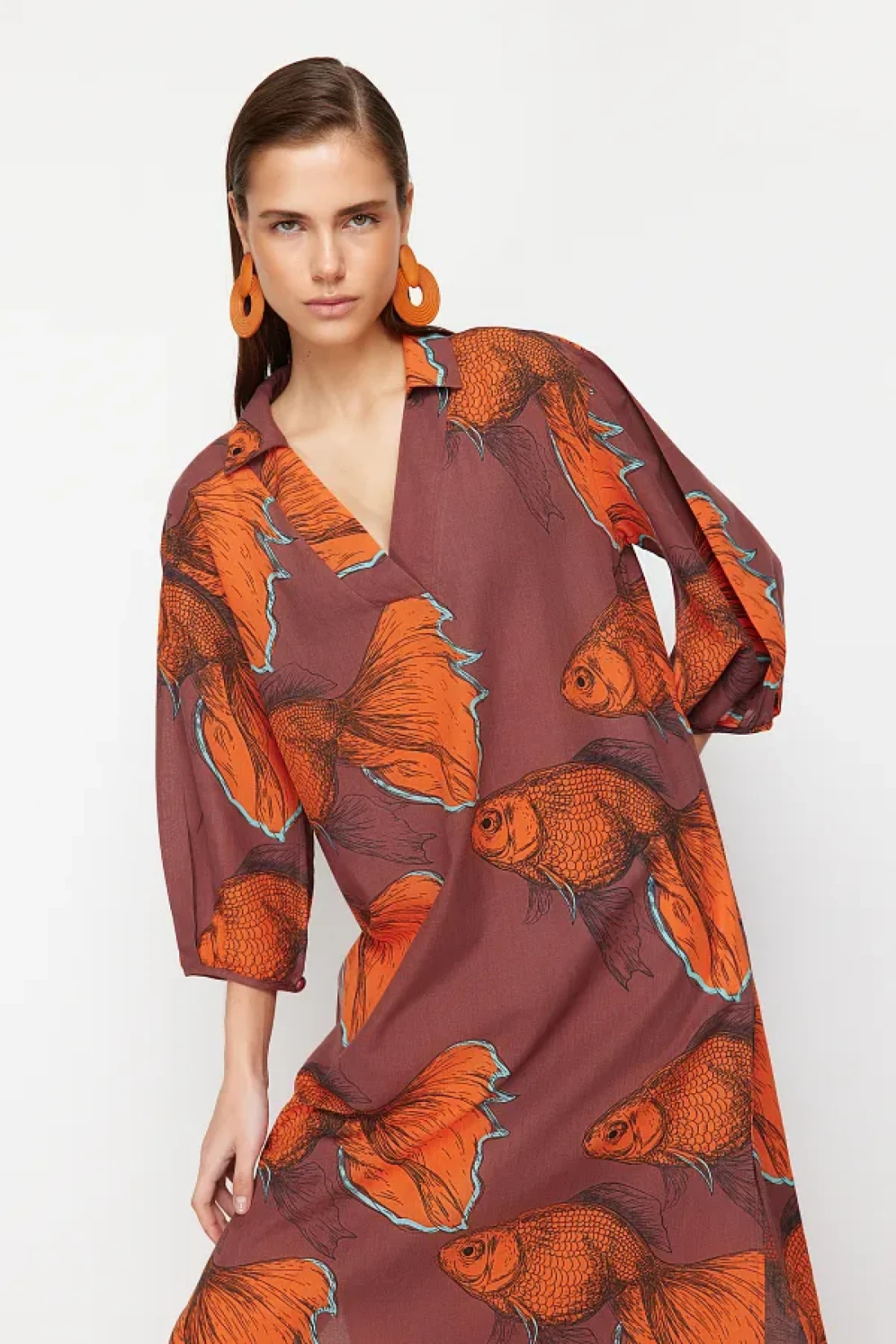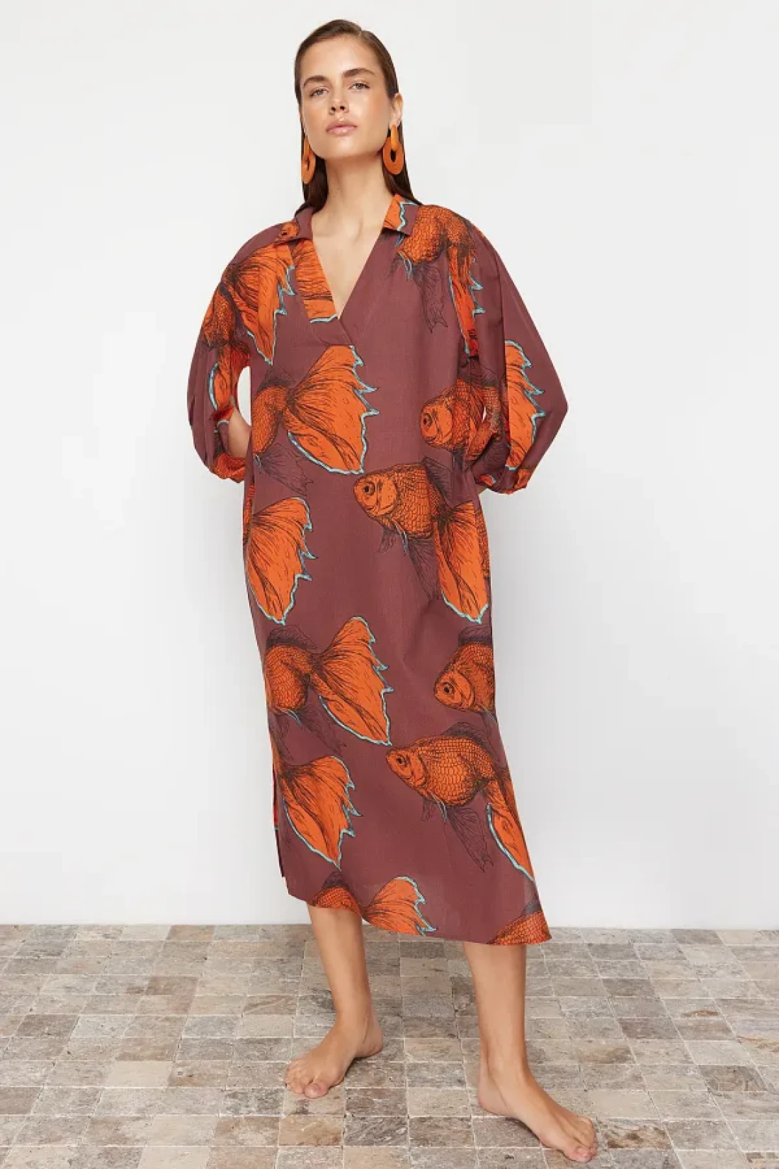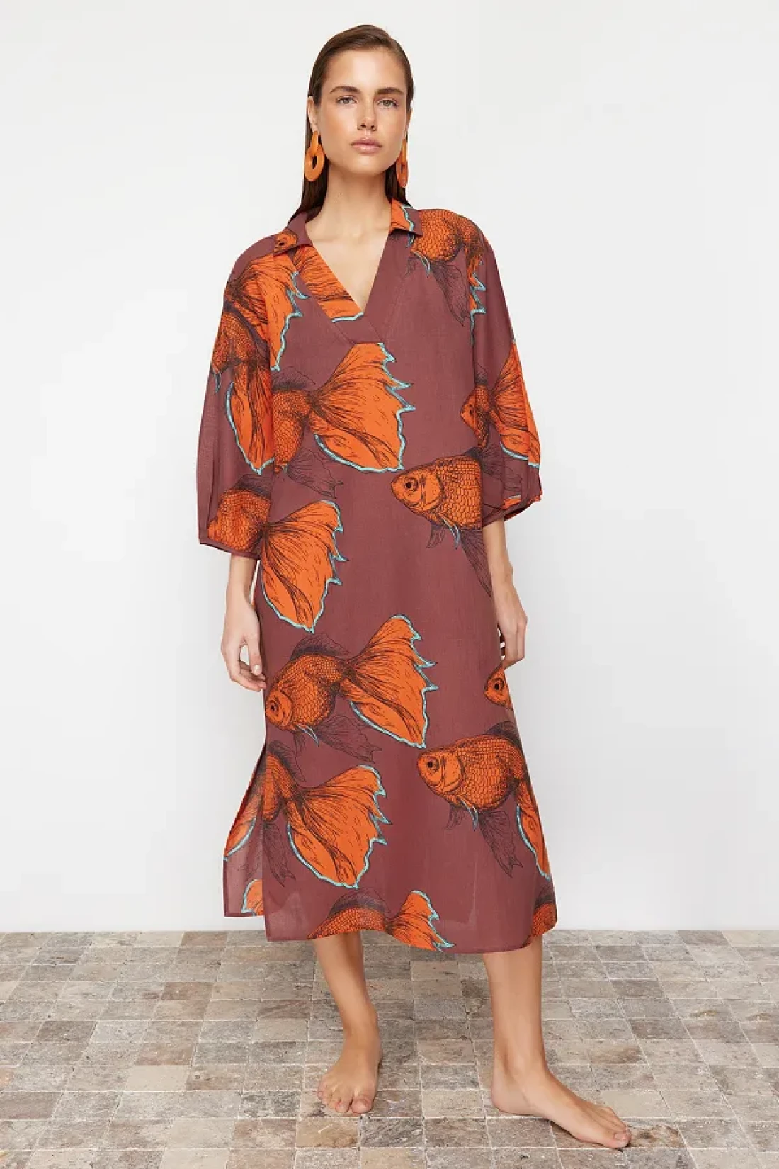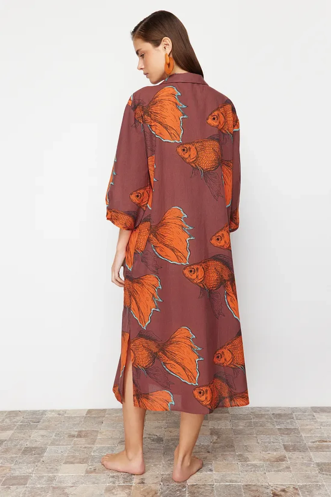 Collection فستان شاطئ متوسط الطول مصنوع من القطن بنسبة 100% بنمط سمكة TBESS22EL0009