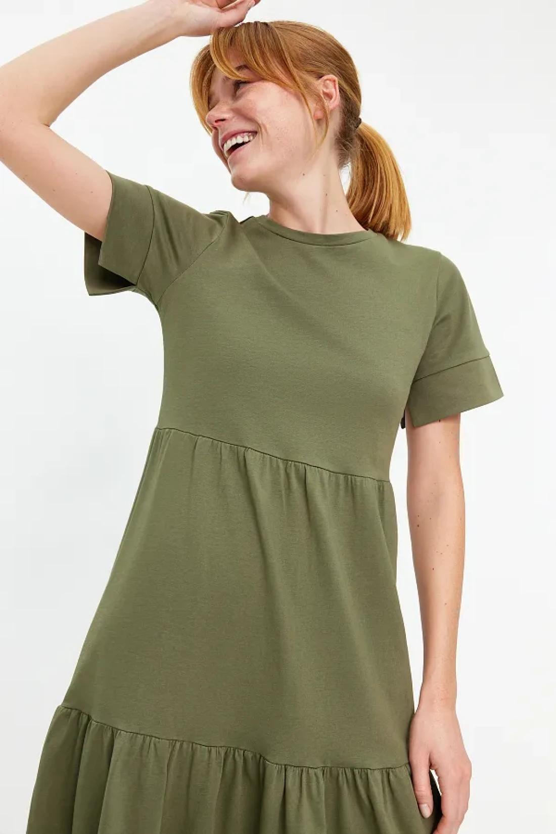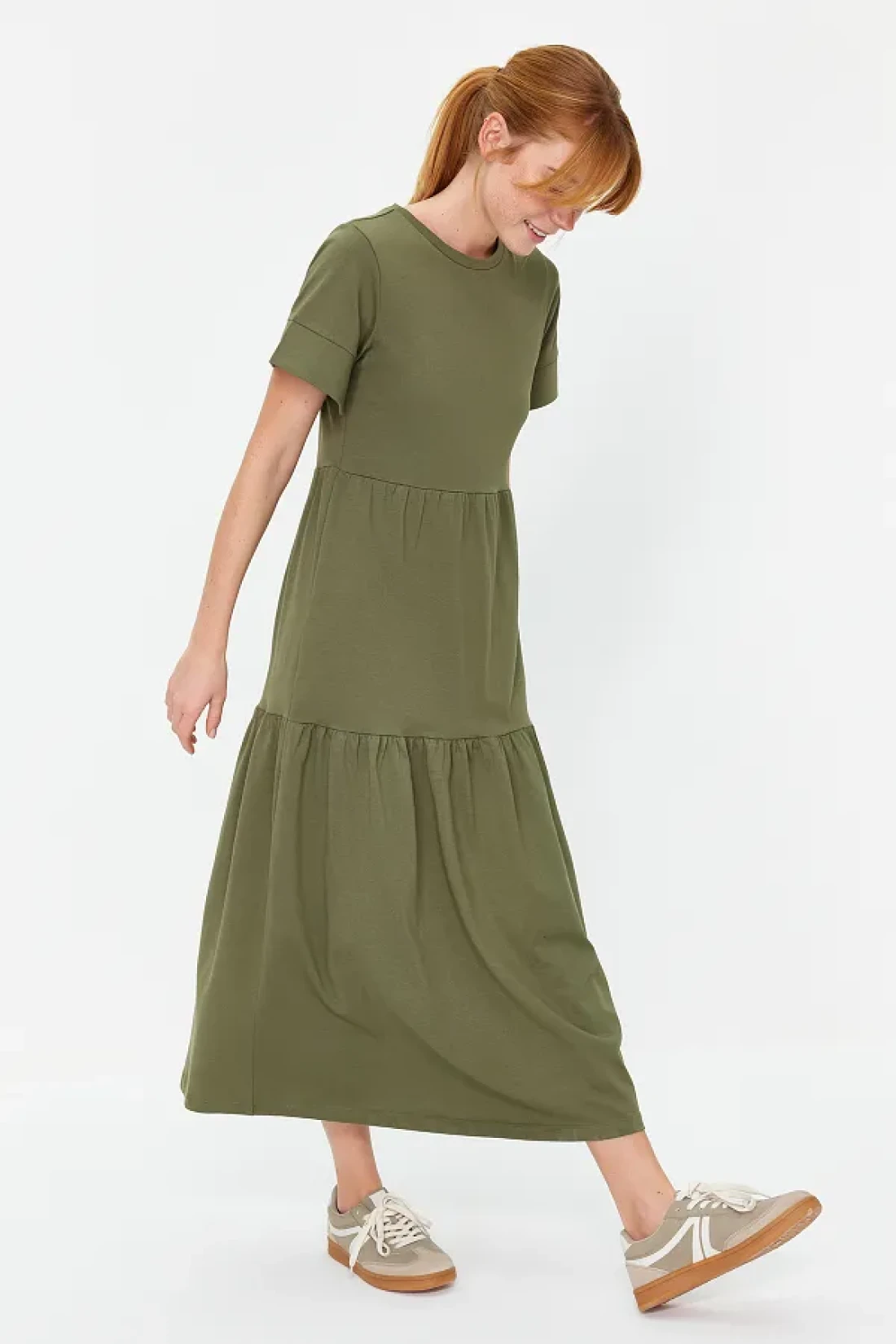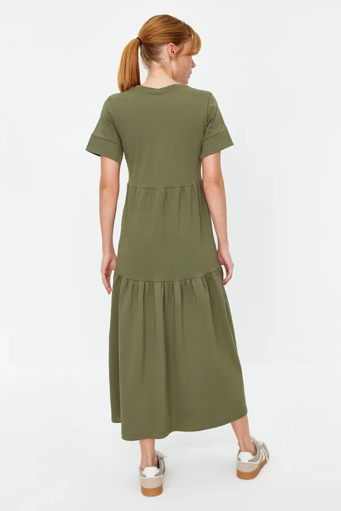 Collection فستان تي شيرت طويل محبوك بأكمام قصيرة كاكي TWOSS24EL00132