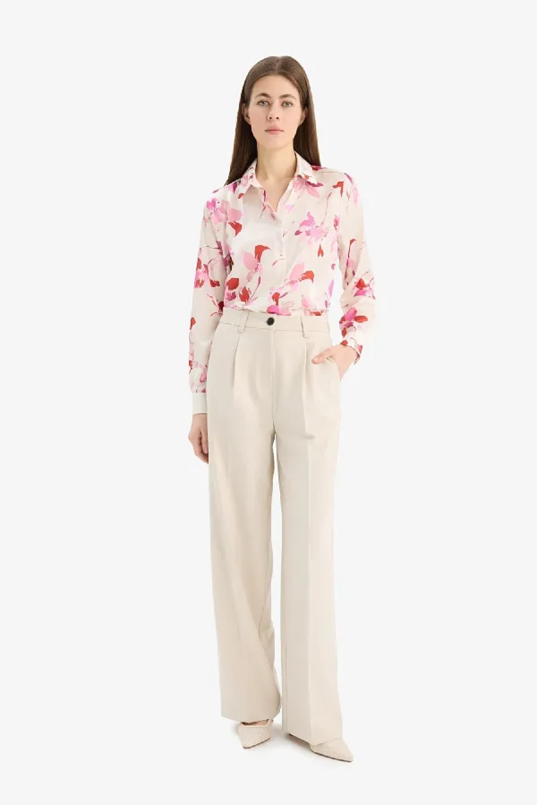 Defacto قميص طويل الأكمام من الساتان منقوش بقصة واسعة مقاس كبير T6892AZ25SP