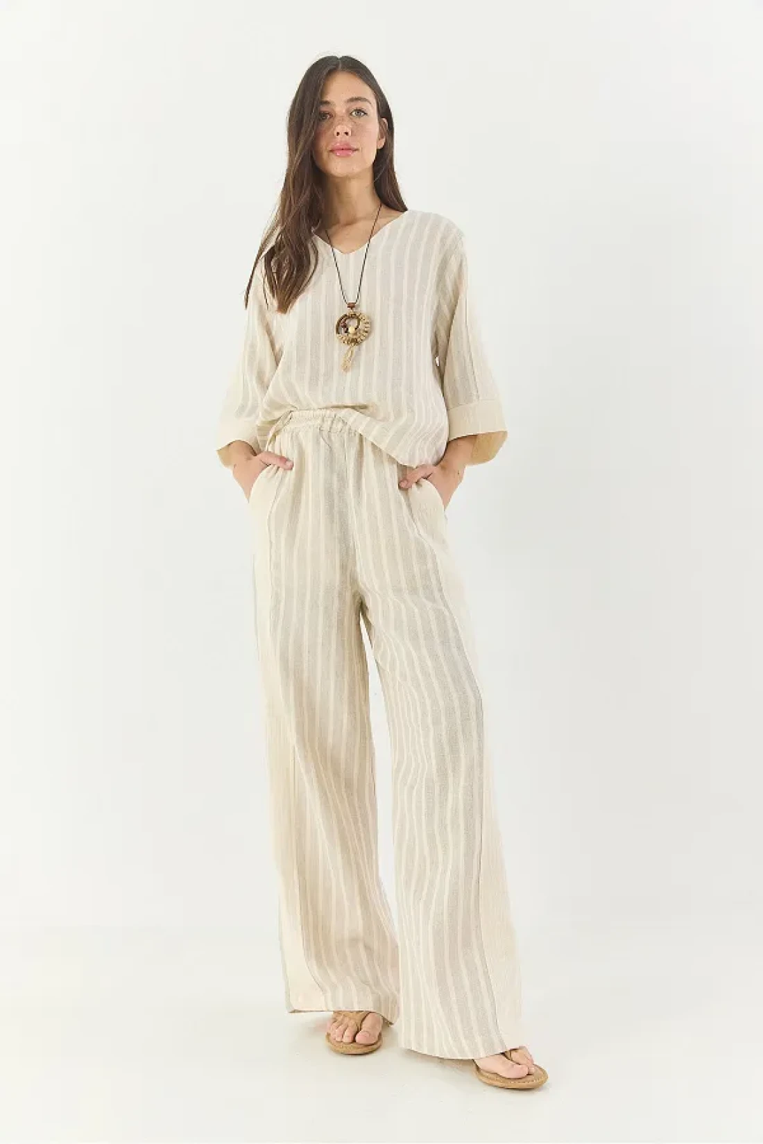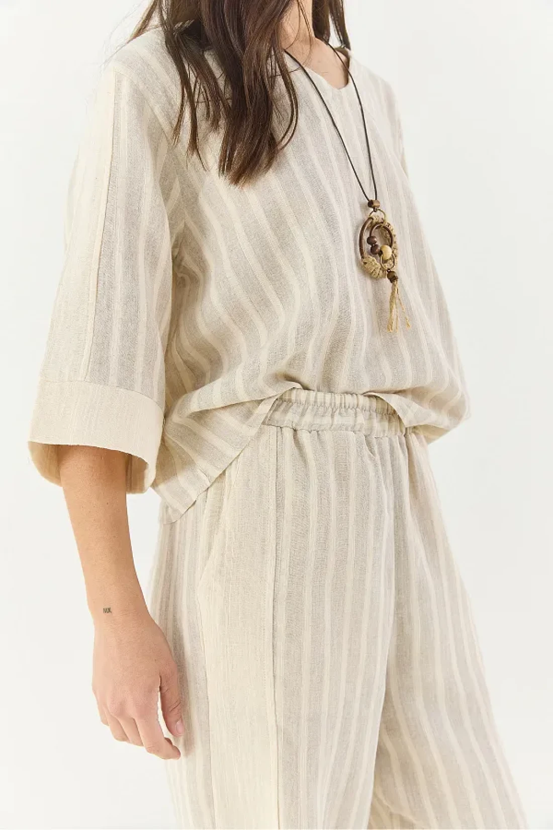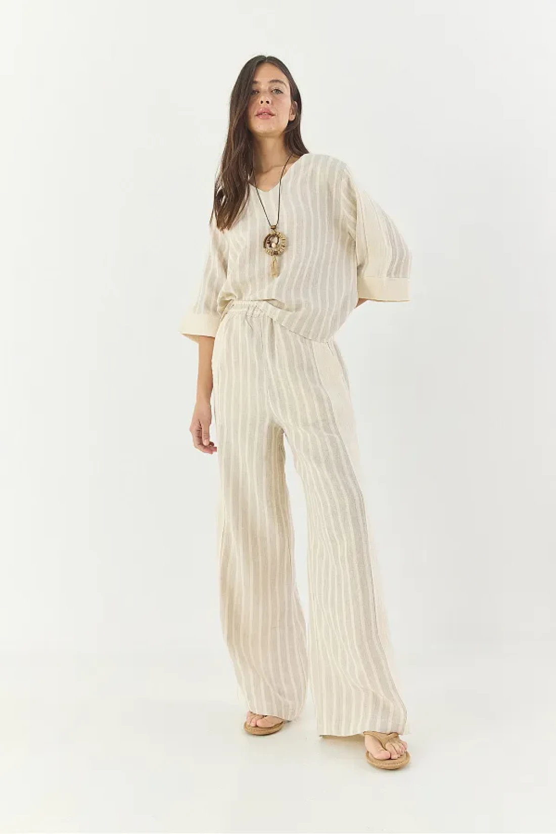 Bianco Lucci طقم قلادة نسائية مخططة برقبة على شكل حرف V من الكتان من الأسفل إلى الأعلى 25106 60283319