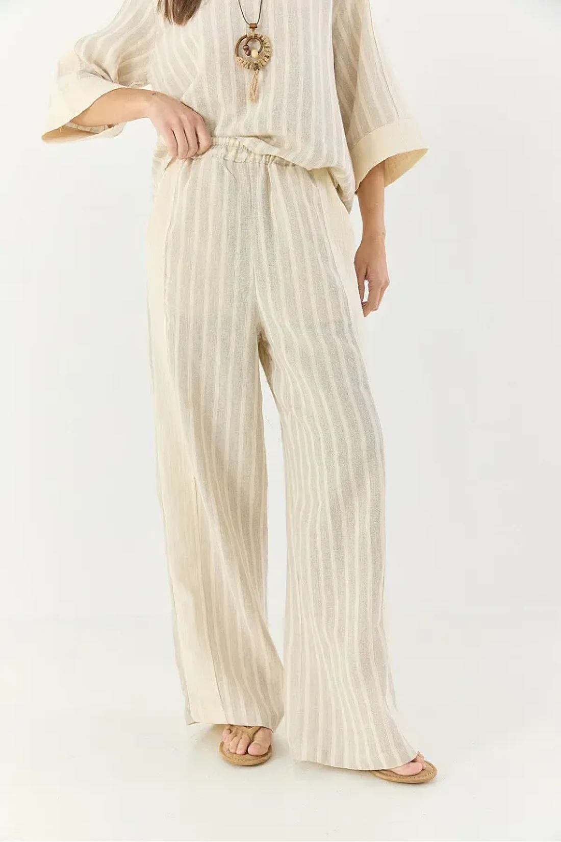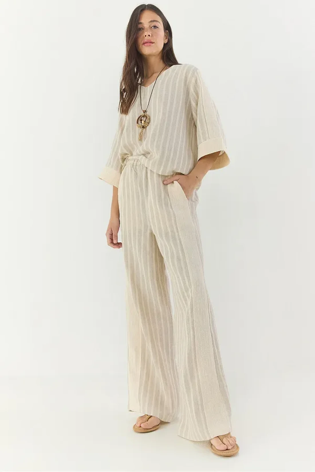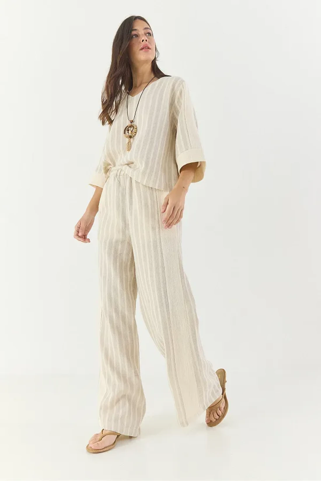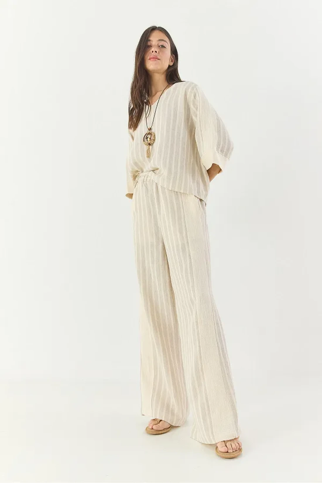 Bianco Lucci طقم قلادة نسائية مخططة برقبة على شكل حرف V من الكتان من الأسفل إلى الأعلى 25106 60283319