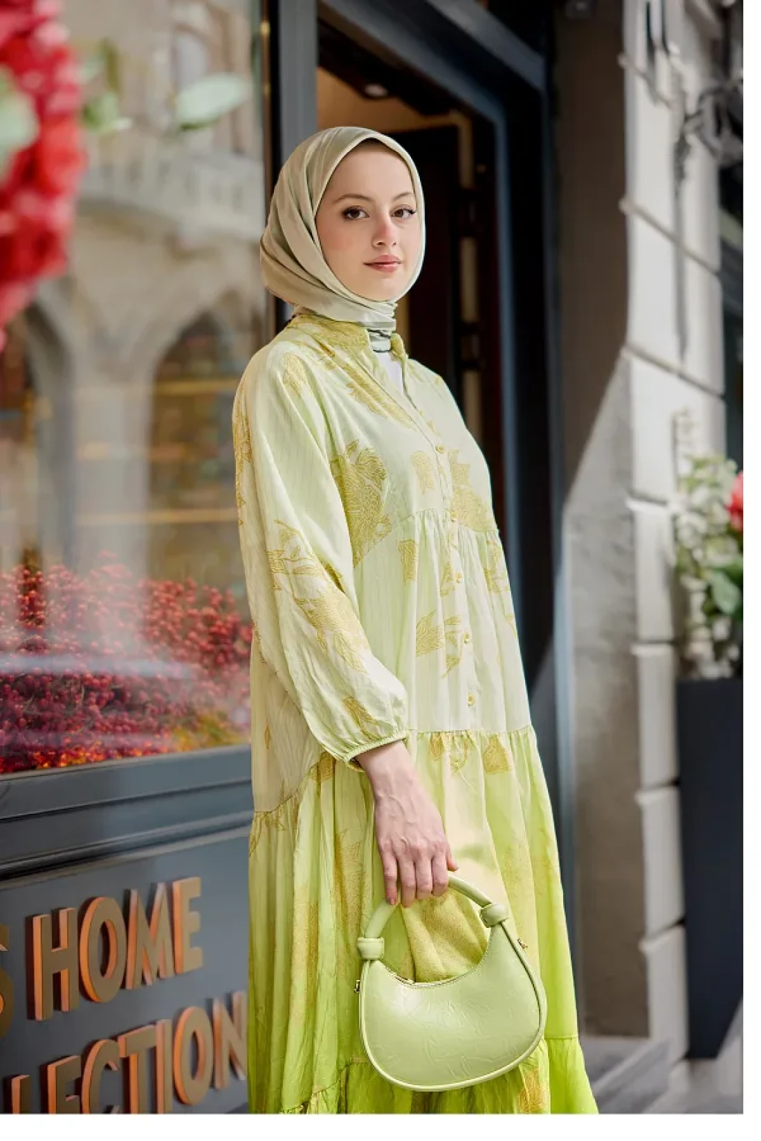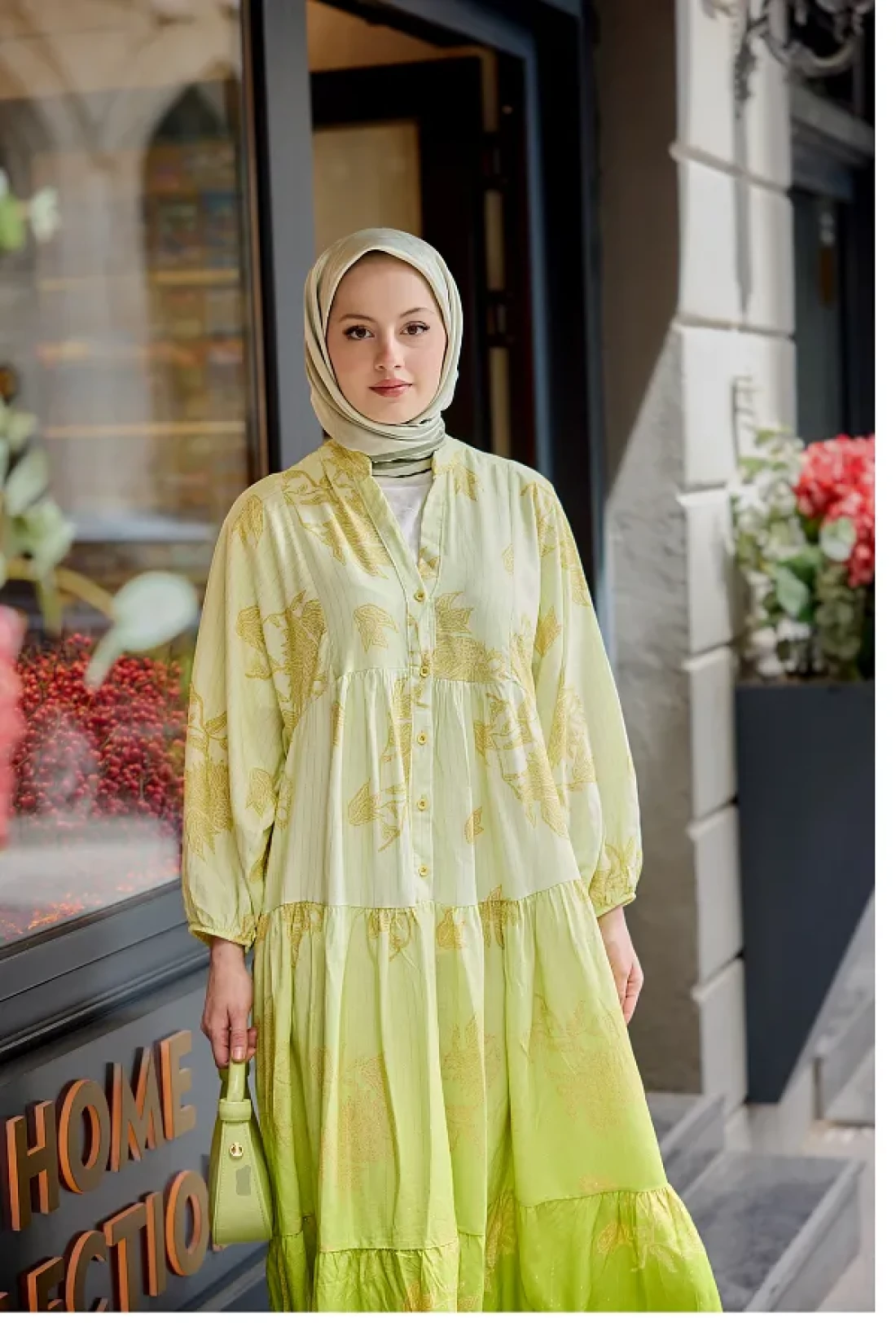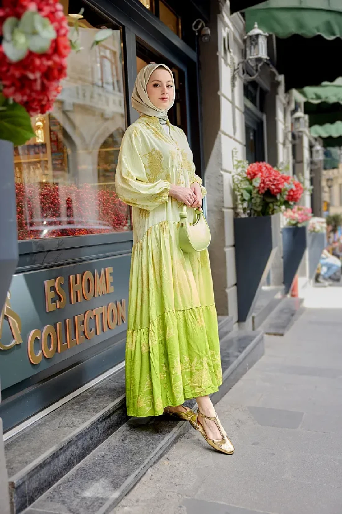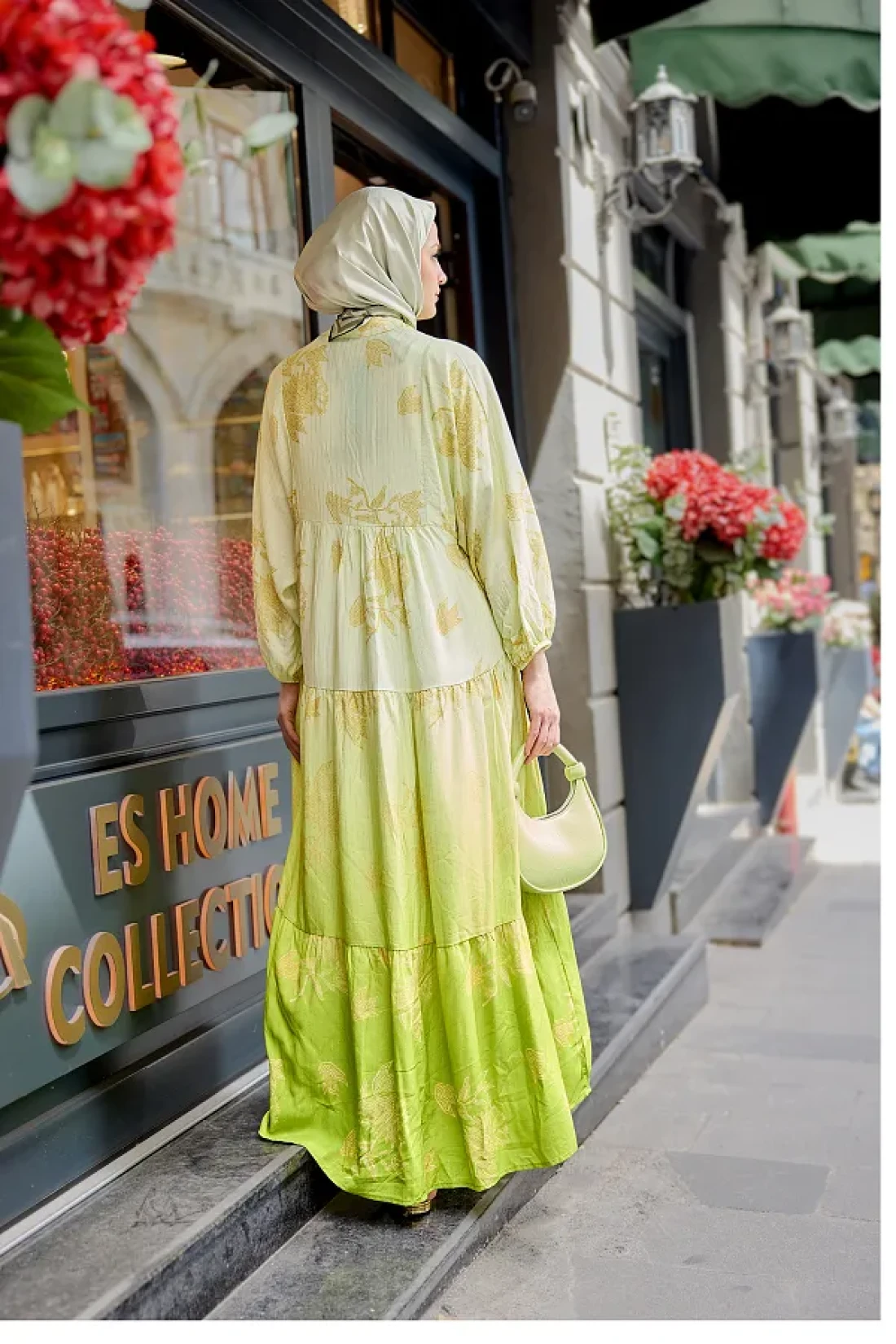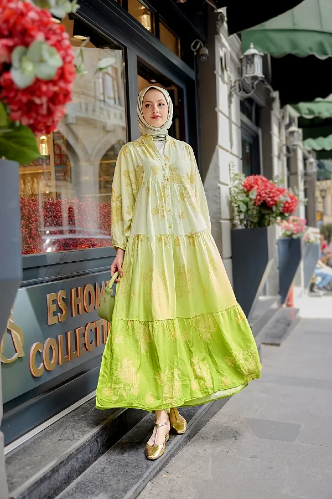 LOCCO فستان نسائي منقوش بأوراق التذهيب باللون الأخضر الفستقي