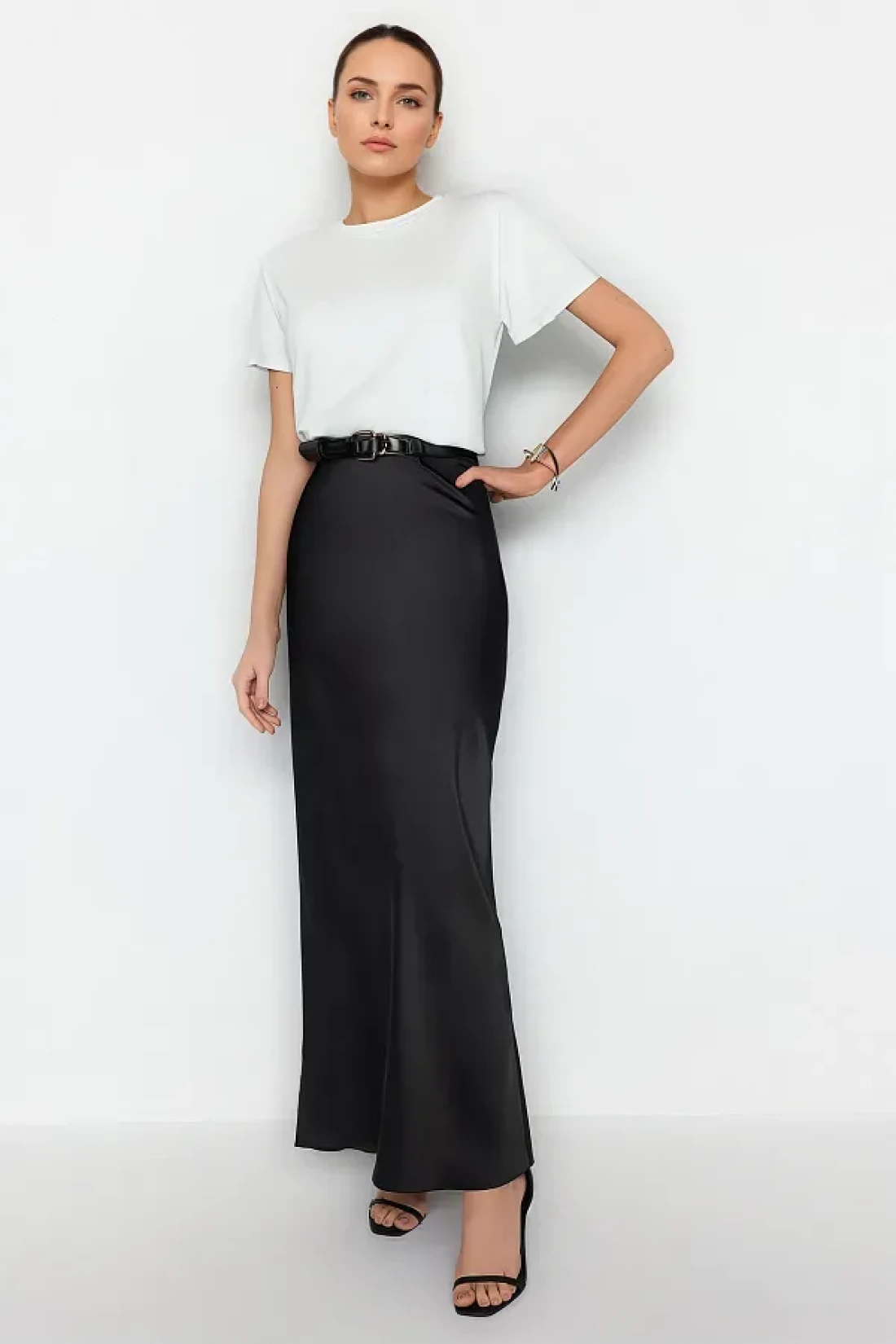 تنورة من الساتان المنسوج باللون الأسود تجذب الانتباه بتصميمها الأنيق والعصري، وتوفر مظهرًا ساحرًا في أي مناسبة ليلية خاصة؛ بفضل نمطه المجهز، فإنه يناسب خطوط جسمك بشكل مثالي ويخلق صورة ظلية أنثوية. توفر المادة، التي تتكون من خليط من 98% بوليستر و2% إيلاستين، استخدامًا مريحًا من خلال توفير المرونة والمتانة معًا. تخلق الصورة الظلية للقلم رأسًا على الكعب أسلوبًا عصريًا ومتطورًا، بينما تبرز تفاصيل الحزام خصرك بأناقة؛ هذه التنورة، التي يمكن تفضيلها بسهولة في كل من البيئات اليومية والرسمية بطولها الكبير، تناسب جميع الفئات العمرية. يمنح ملمس الساتان ملمسًا ناعمًا، بينما يعزز القماش المنسوج المتانة، مما يسمح بالاستخدام طويل الأمد؛