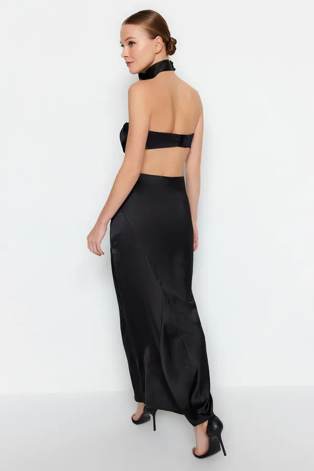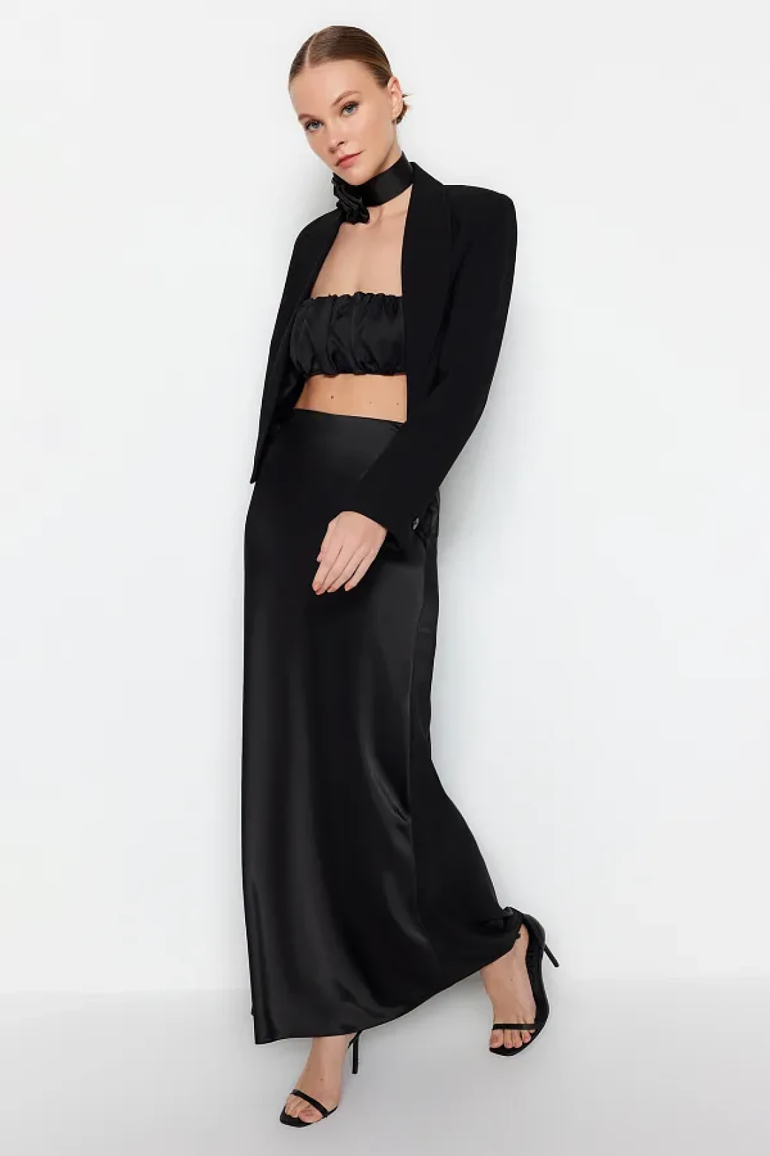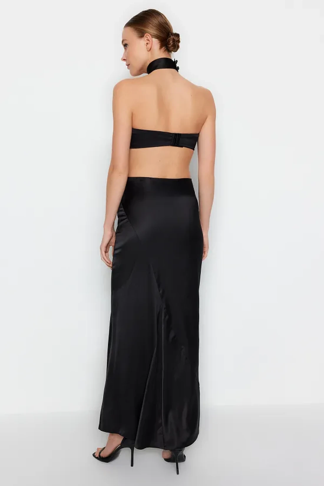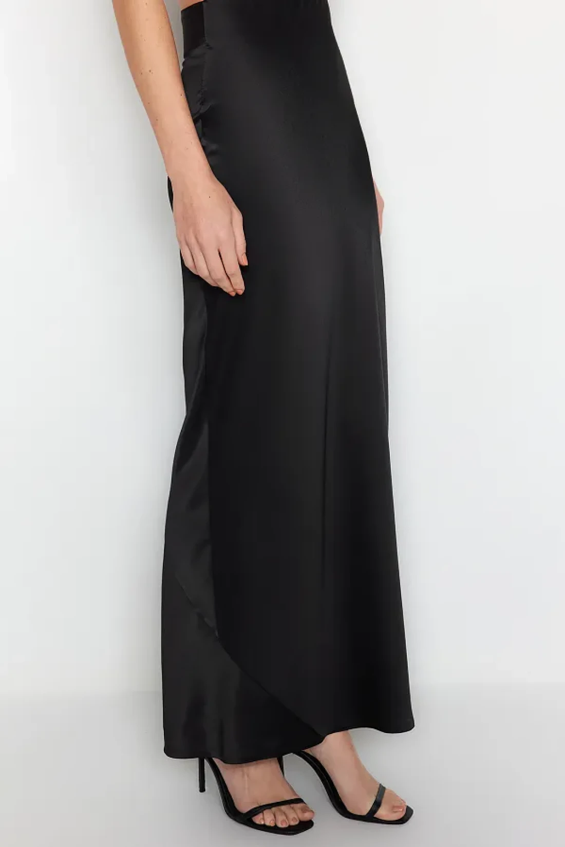 Collection تنورة طويلة سوداء منسوجة من الساتان - TPRAW24ET00040