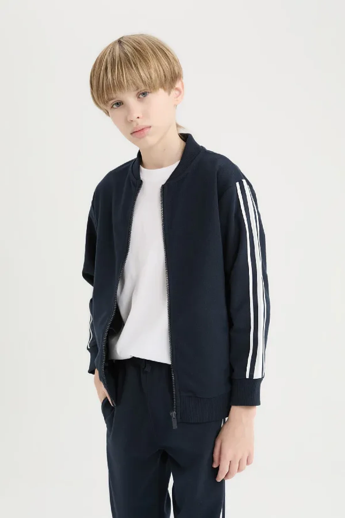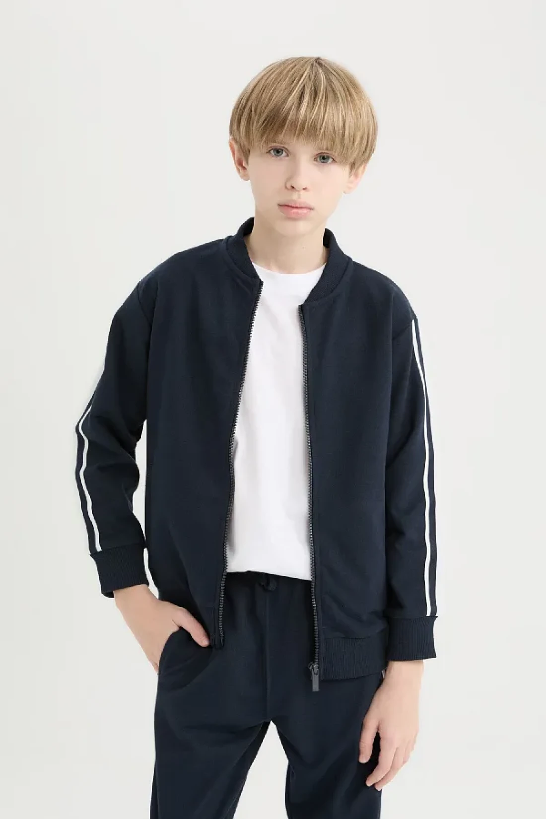 خيار أنيق ومريح للأولاد: طقم مكون من قطعتين يتكون من سترة بومبر بسحاب بياقة كليج وبنطلون رياضي بخصر مطاطي.