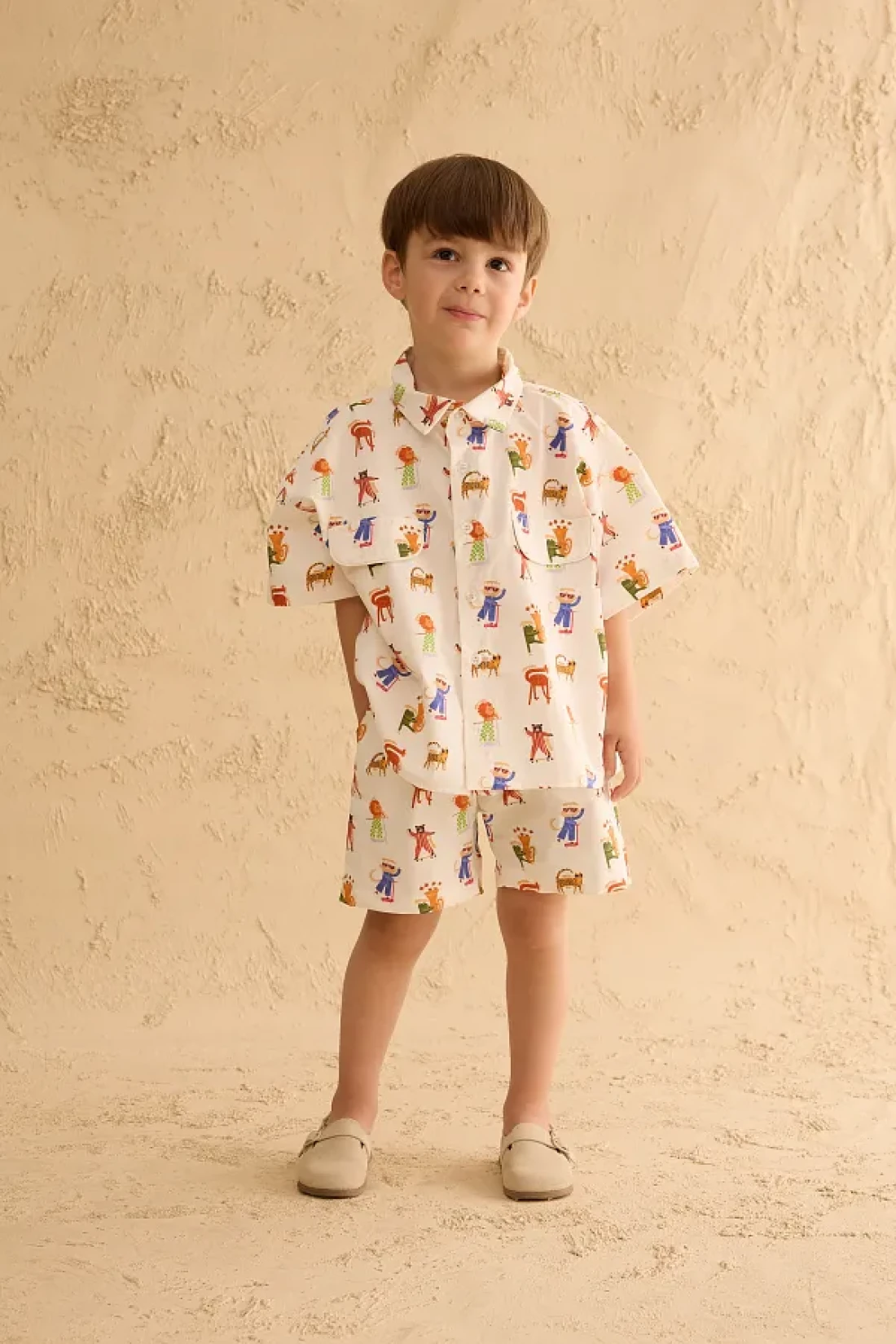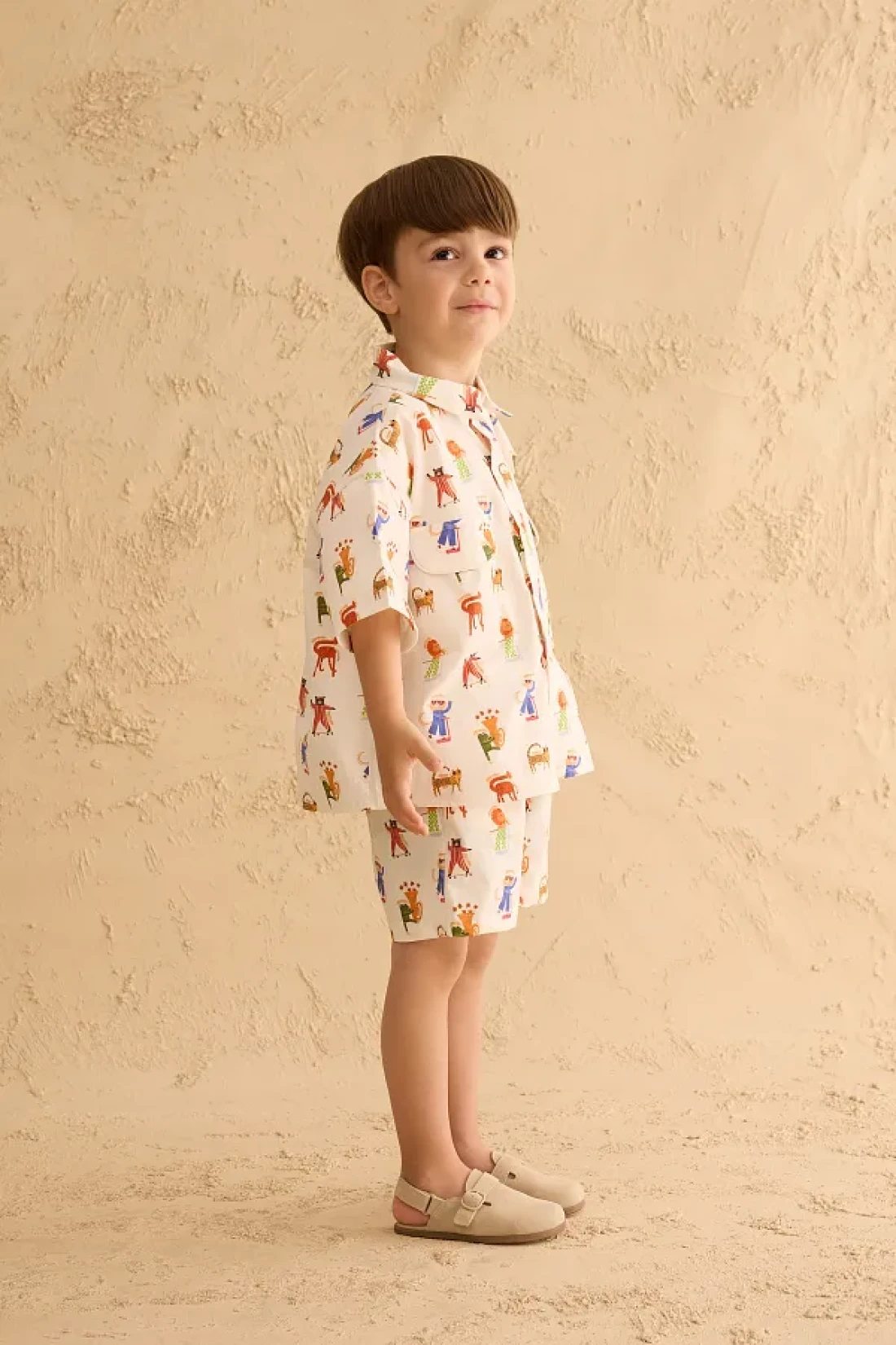 مجموعة من القميص القصير والأكمام القصيرة مع جيب مريح، مصنوعة من قماش منسوج من القطن بنسبة 100%، مطبوعة بصبغة عضوية، ياقة قميص، إغلاق بزر أمامي، وحزام خصر مطاطي.