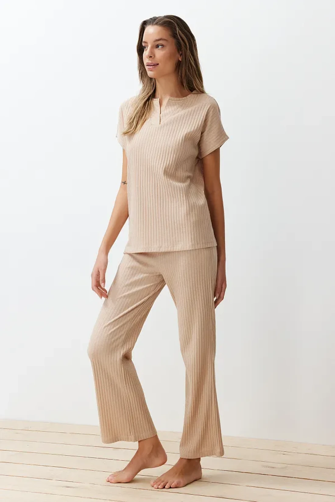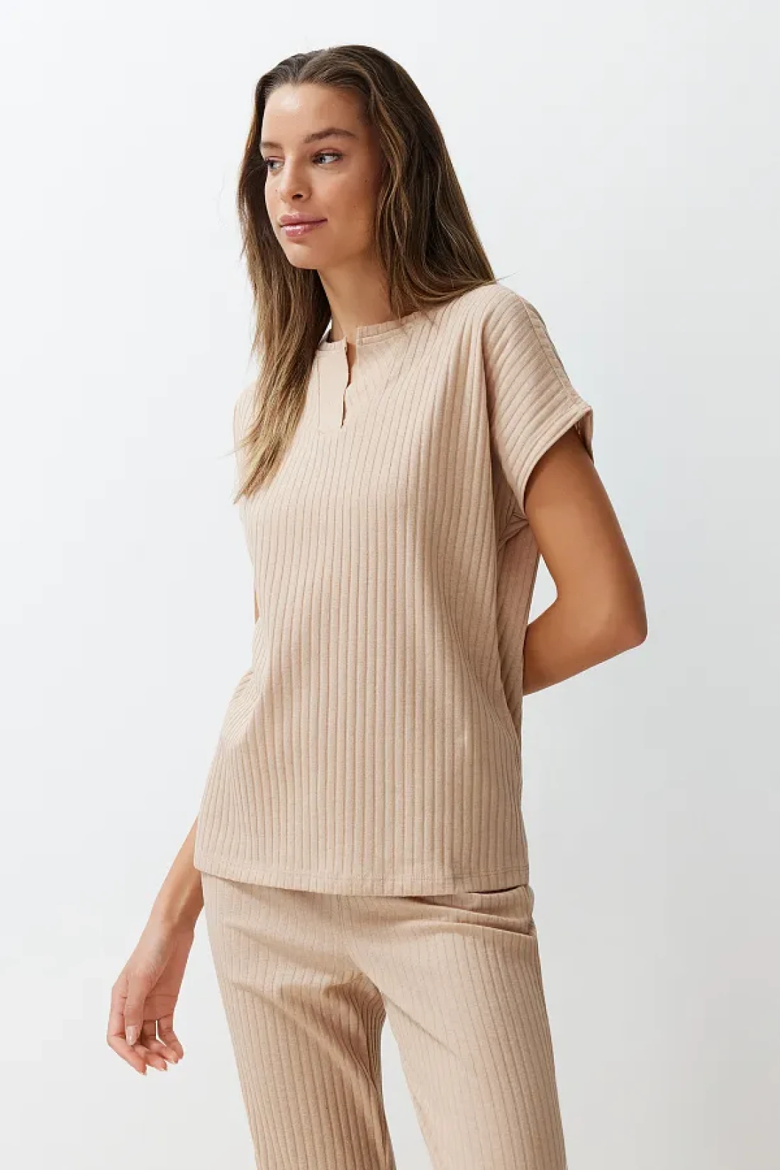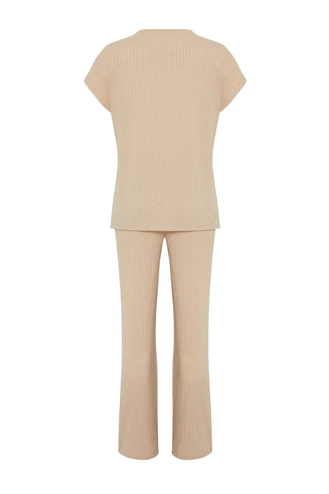 Collection طقم بيجامة محبوكة بياقة مضلعة باللون البيج THMSS24PT00234