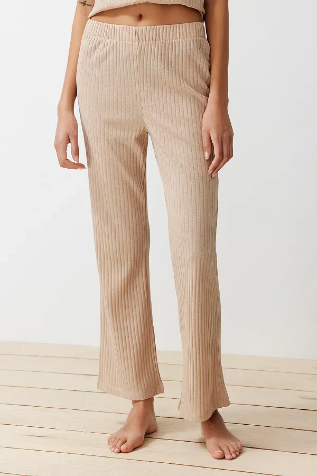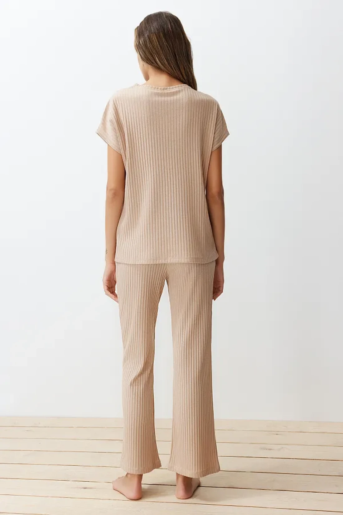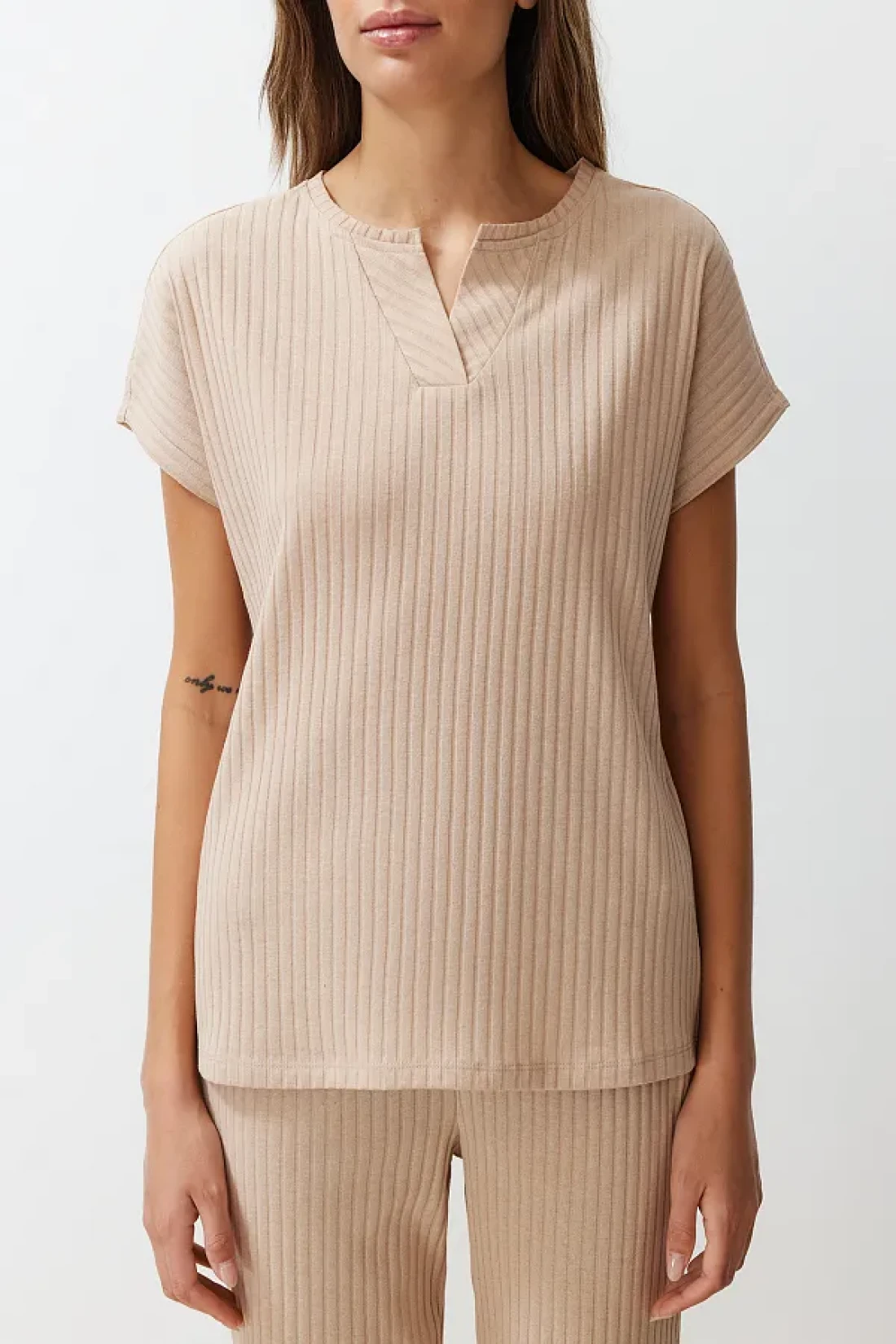 Collection طقم بيجامة محبوكة بياقة مضلعة باللون البيج THMSS24PT00234