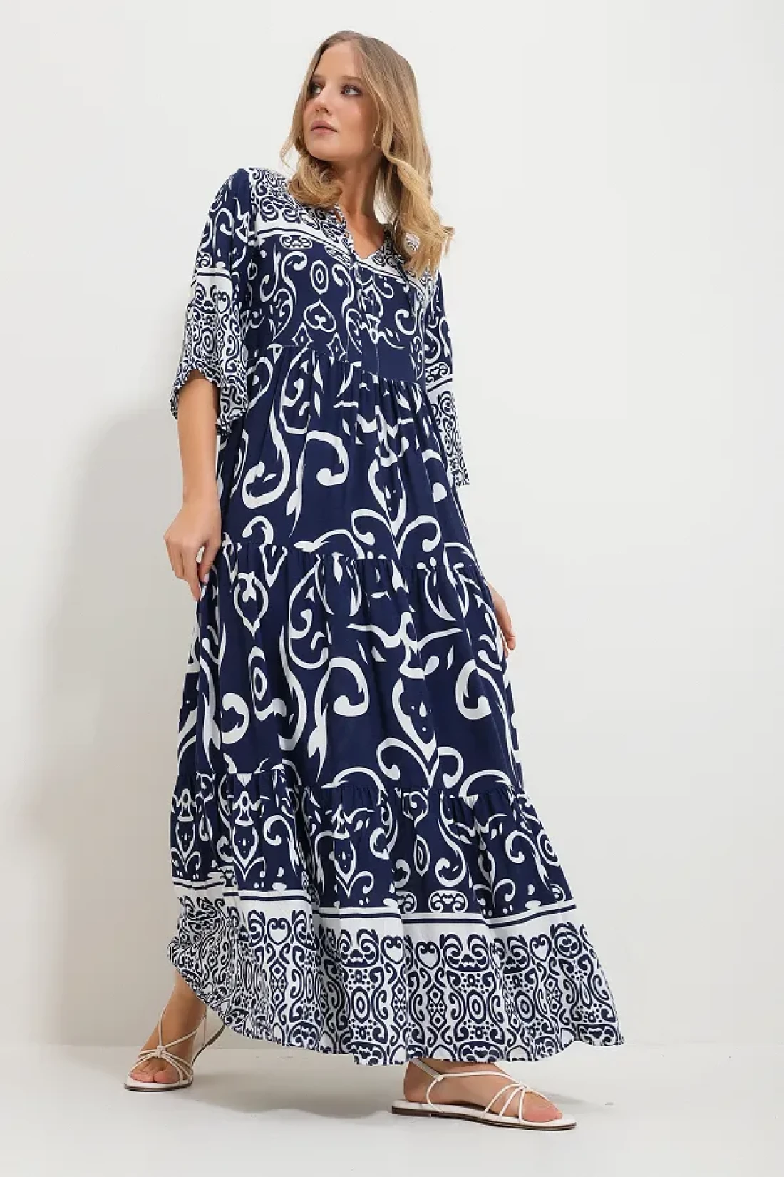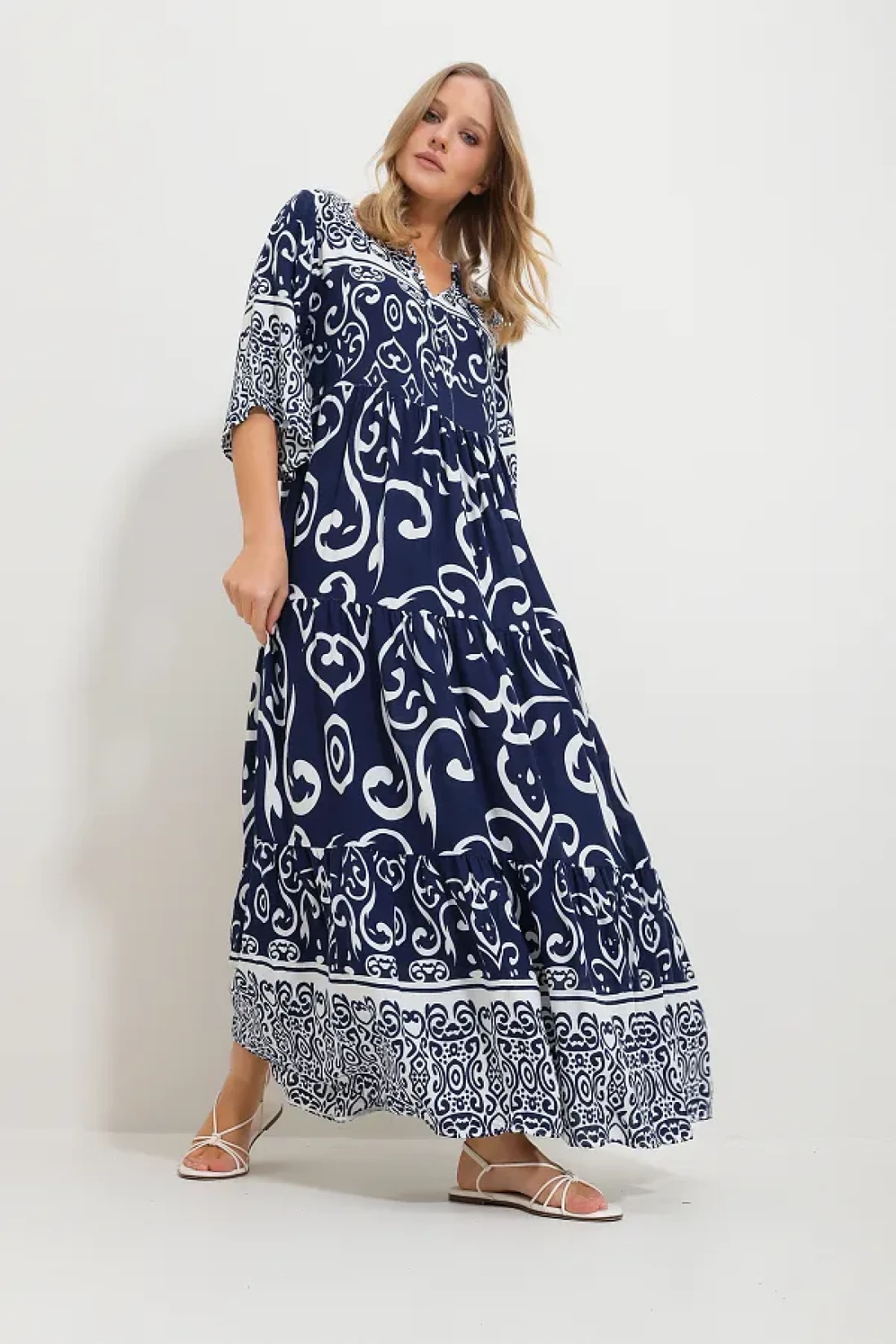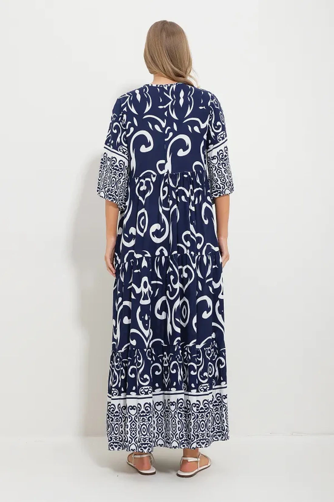 Trend Alaçatı Stili فستان فيسكوز منقوش برباط أمامي باللون الأزرق الداكن للنساء Alc-X11595