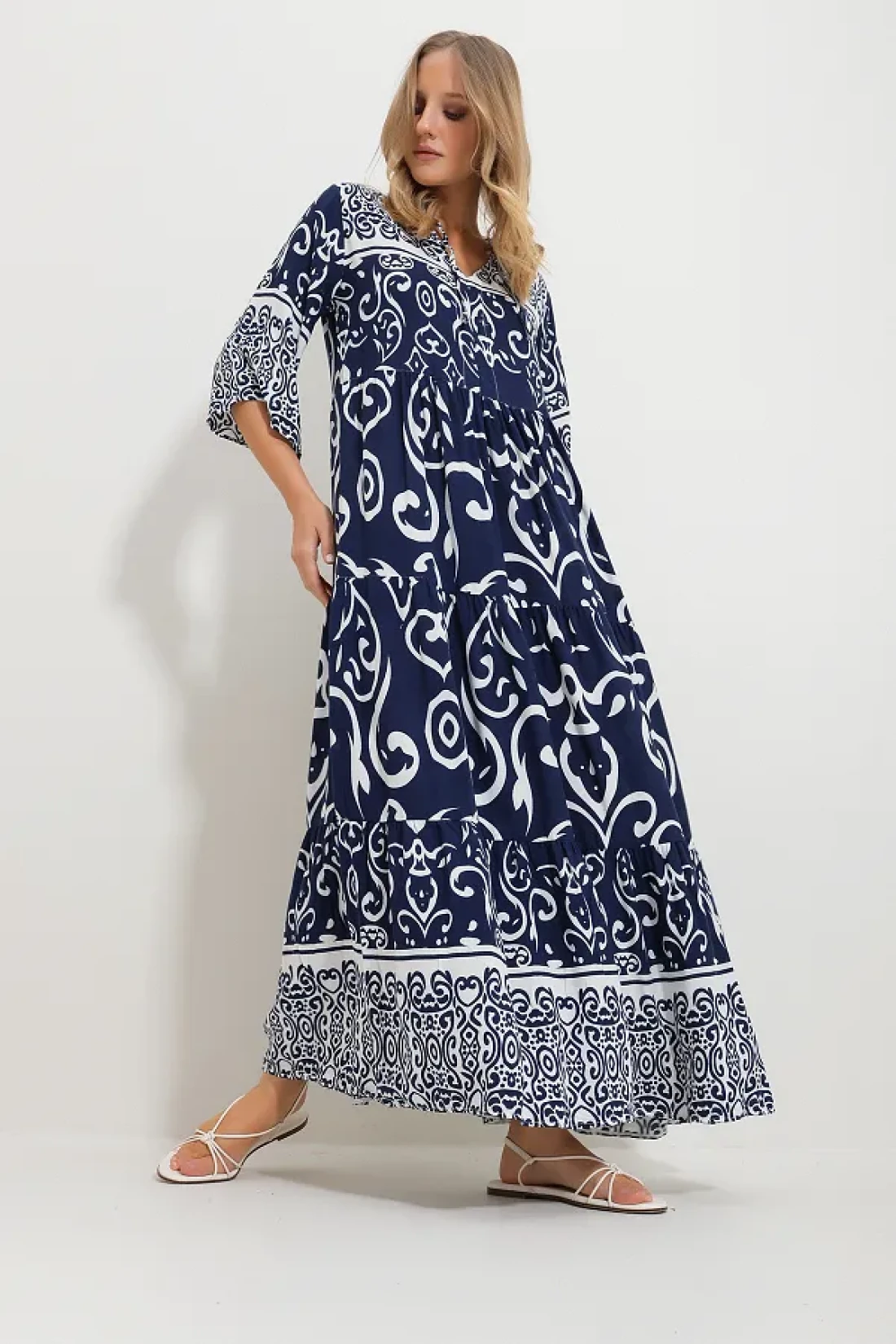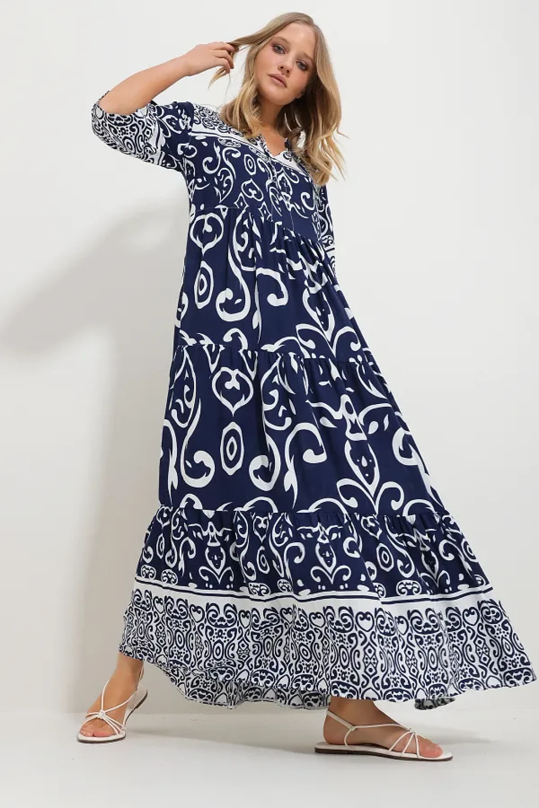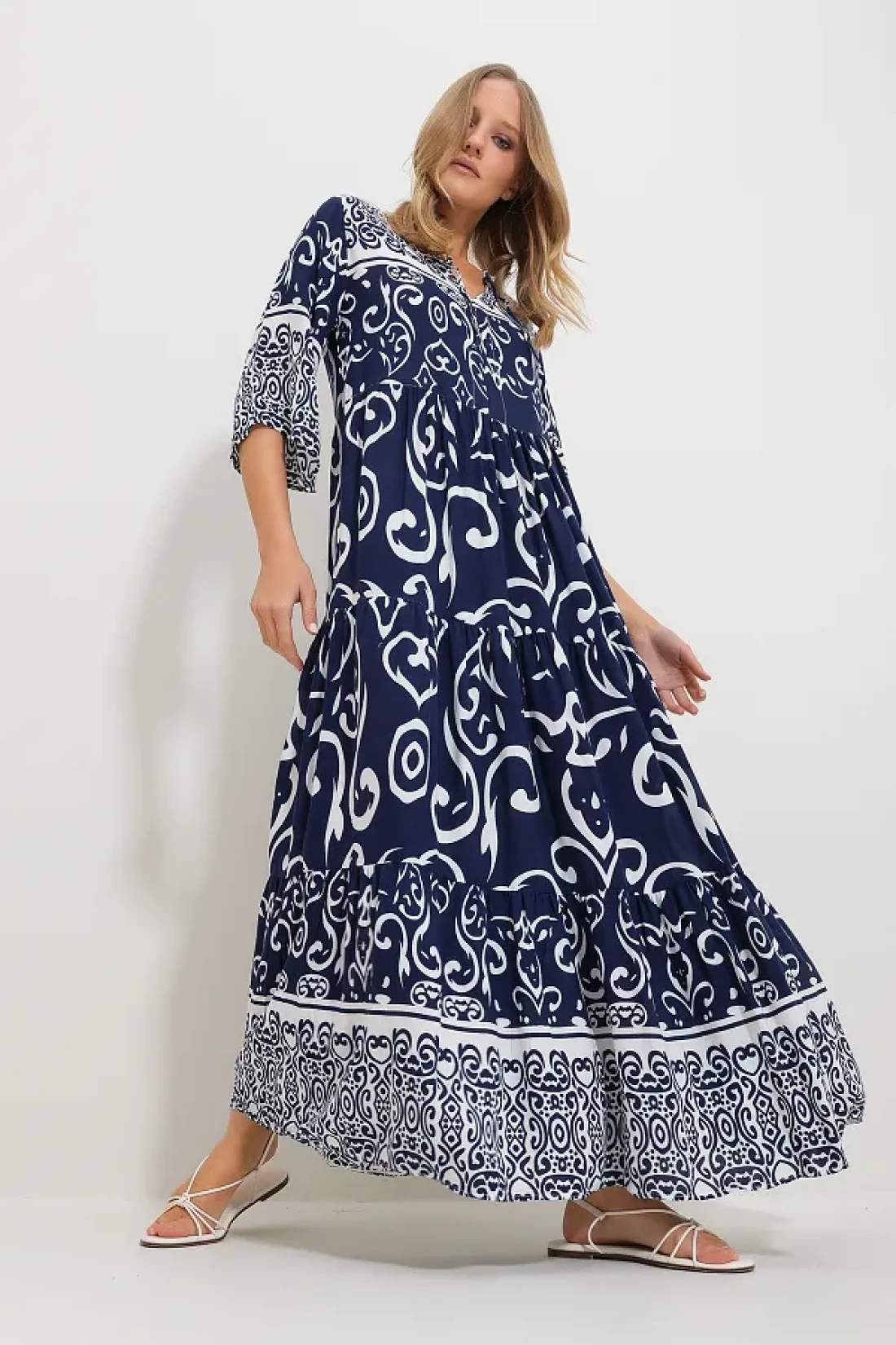 Trend Alaçatı Stili فستان فيسكوز منقوش برباط أمامي باللون الأزرق الداكن للنساء Alc-X11595