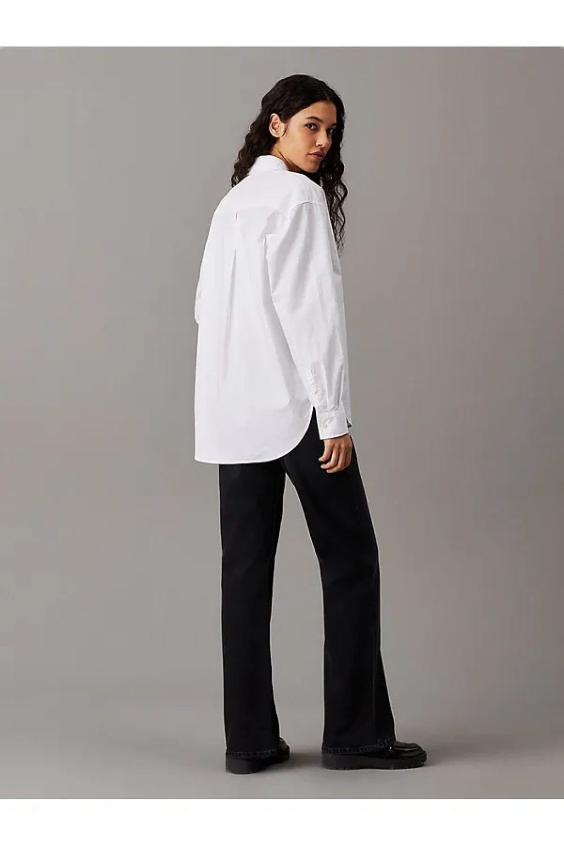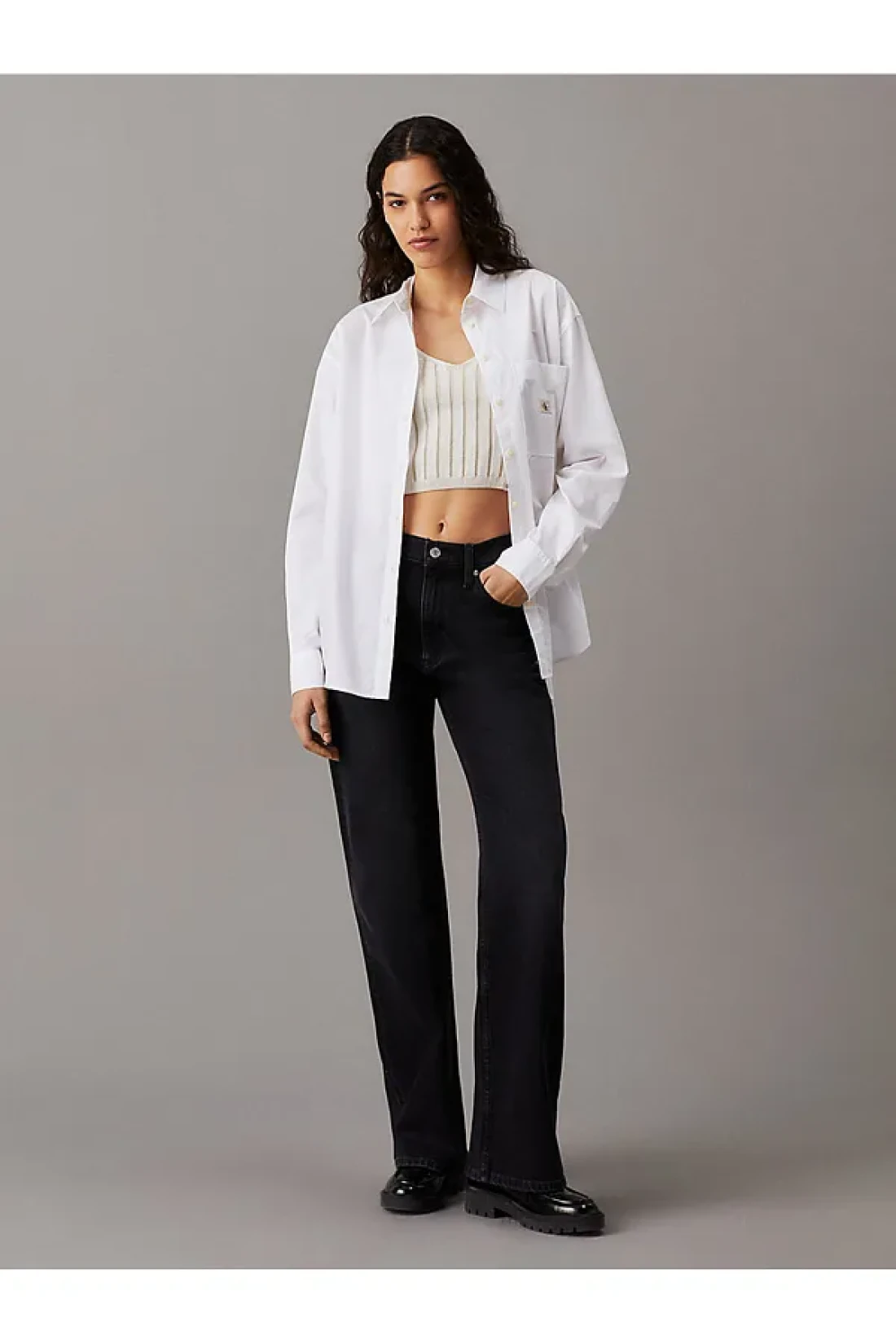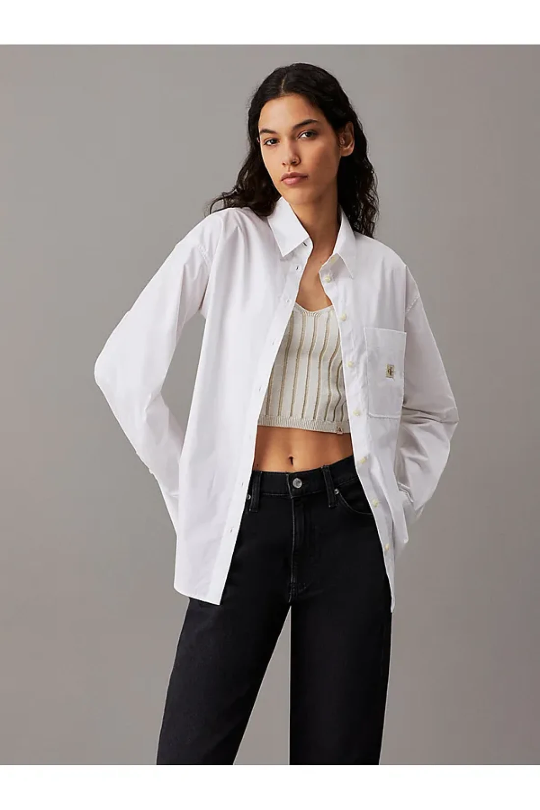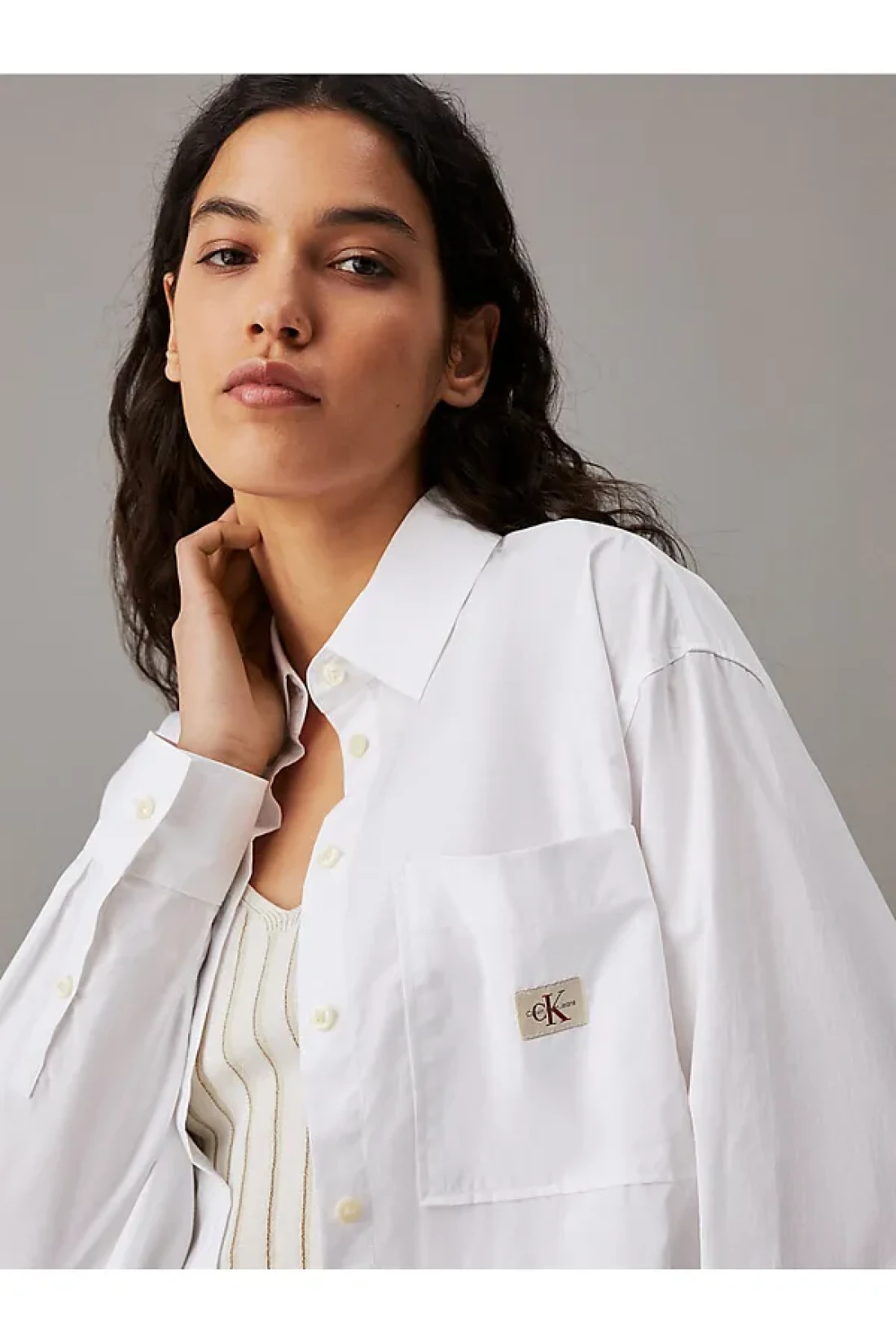 Calvin Klein قميص جينز قياسي بياقة مطرزة باللون الأبيض للنساء، قميص WOVEN LABEL المريح