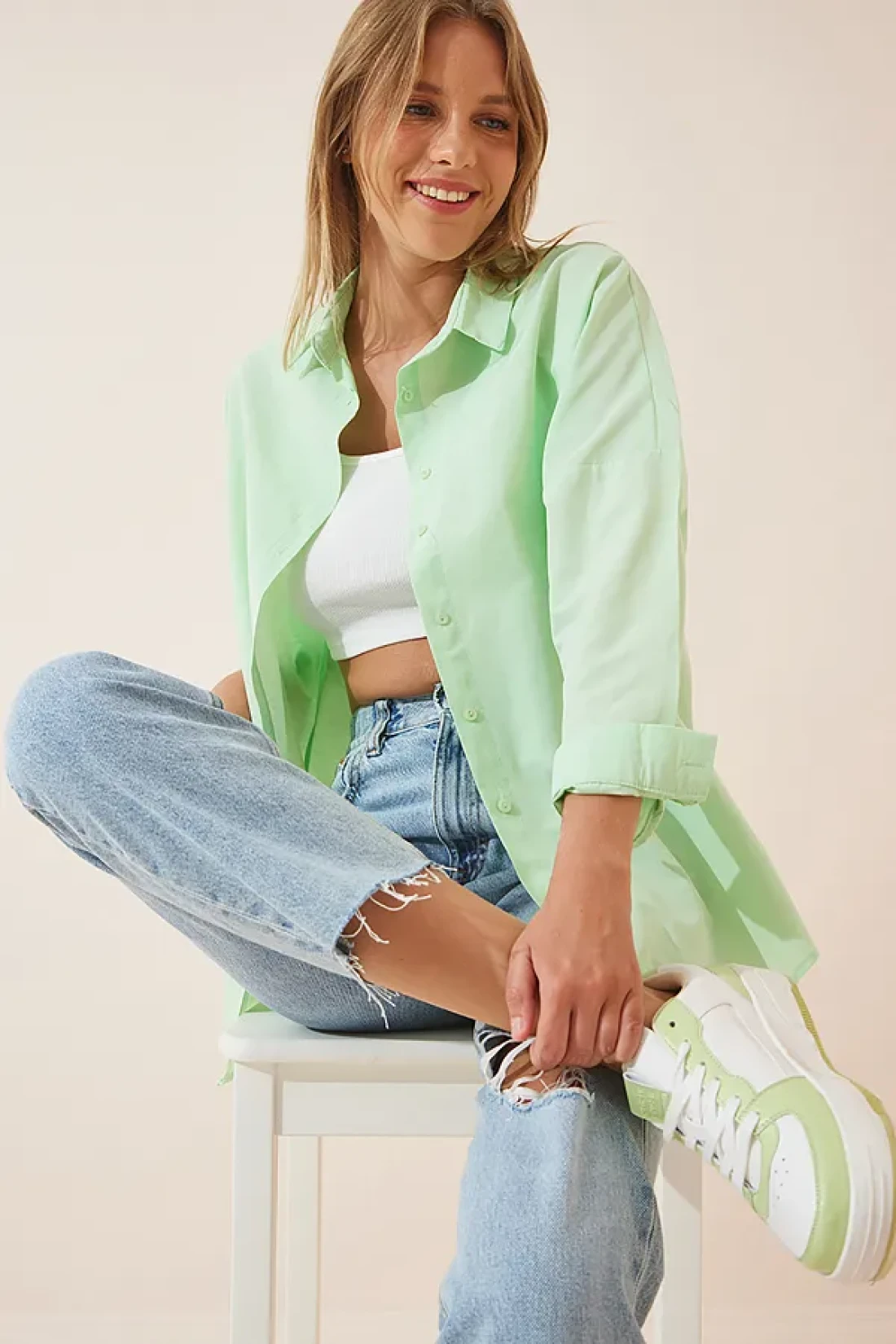 Happiness İstanbul قميص أساسي طويل كبير الحجم باللون الأخضر الفاتح للسيدات DD00842