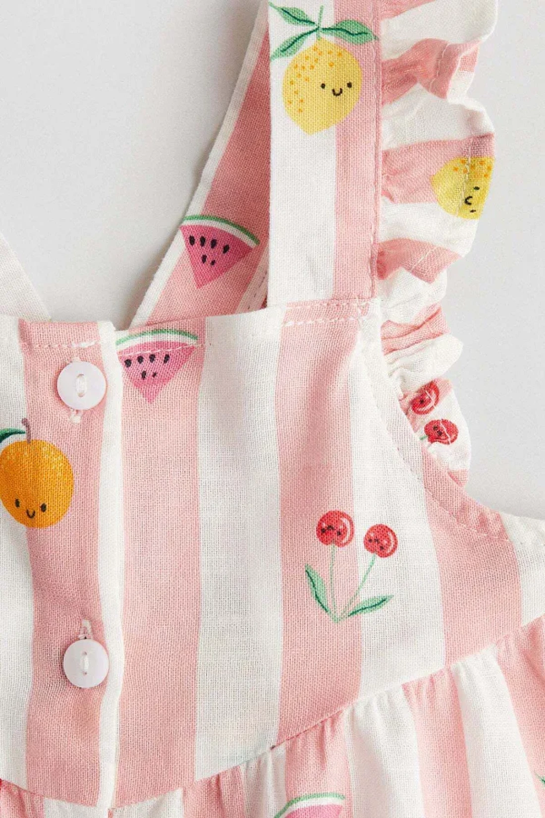 فستان بدون أكمام بطول الركبة مصنوع من قطن جيد التهوية مع حمالات كتف مزينة بالكشكشة وفتحة رقبة مربعة مع مطاط مغطى في الخلف. أزرار بمظهر خشبي على طول الجزء الأمامي ودرزة مجمعة عند الخصر. غير مبطن.