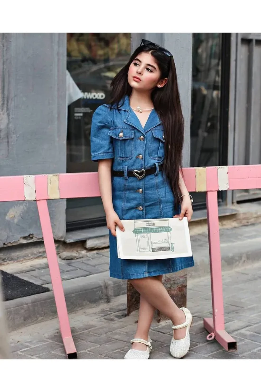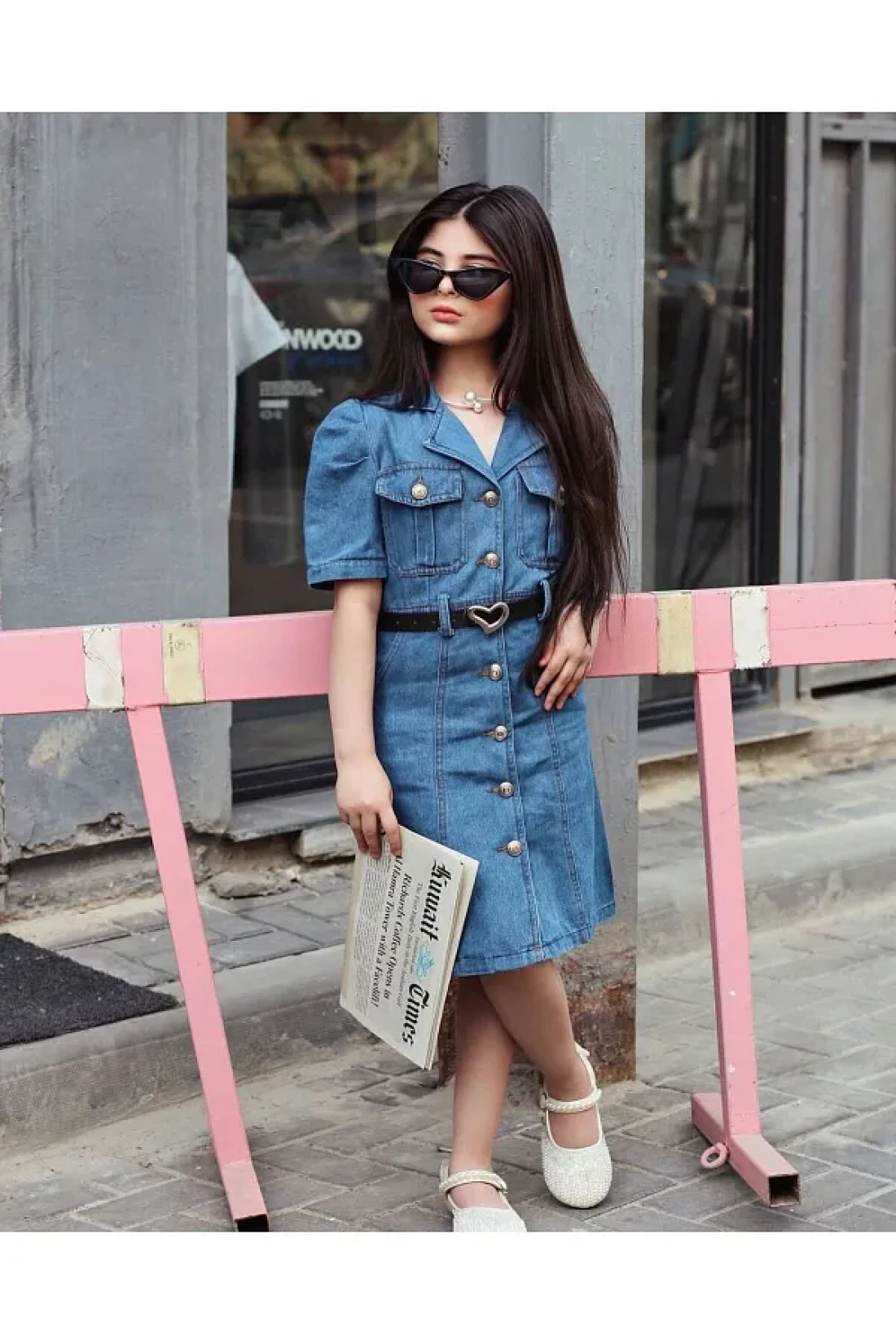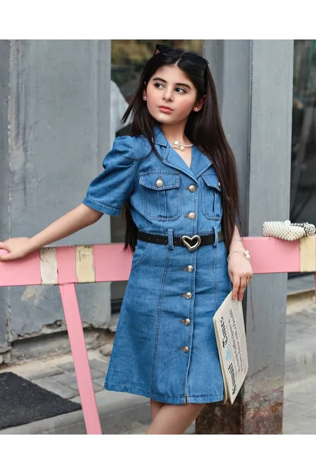 Ribbon kids فستان بناتي من الدنيم بأزرار على شكل قلب وحزام
