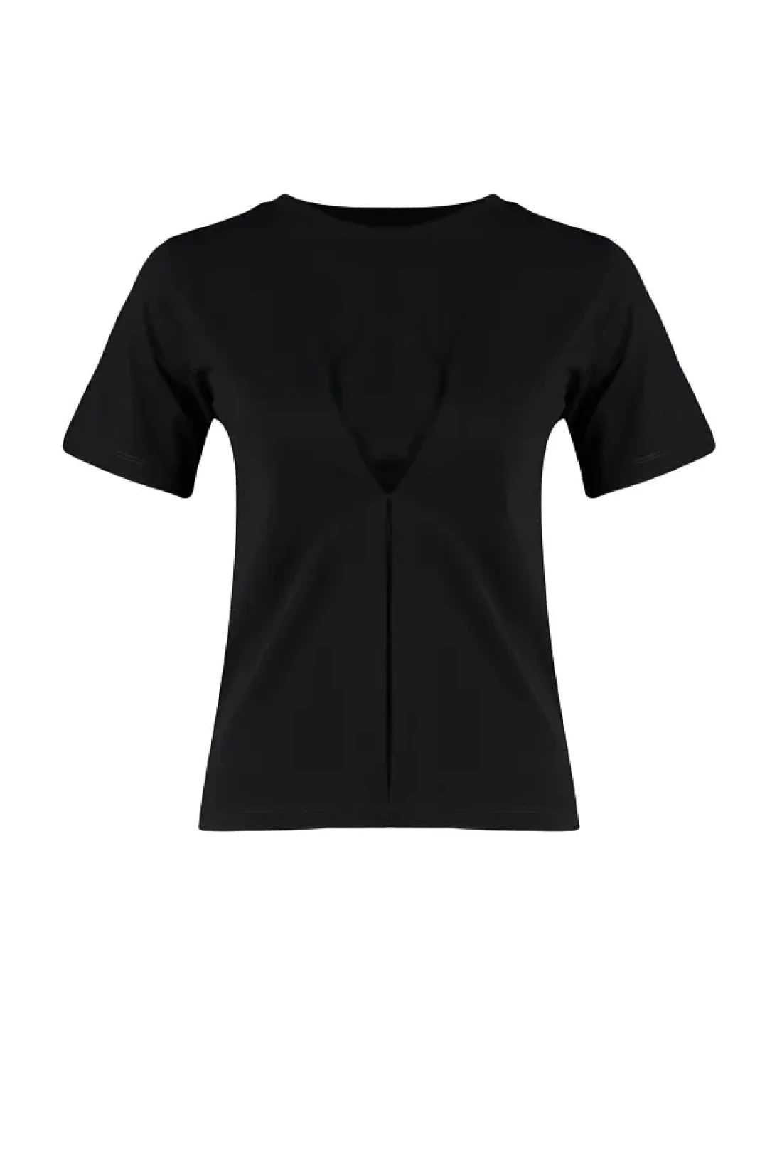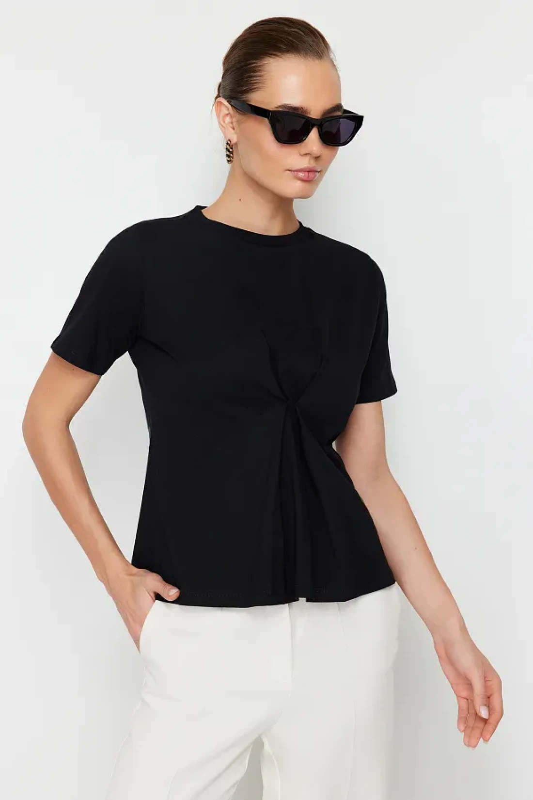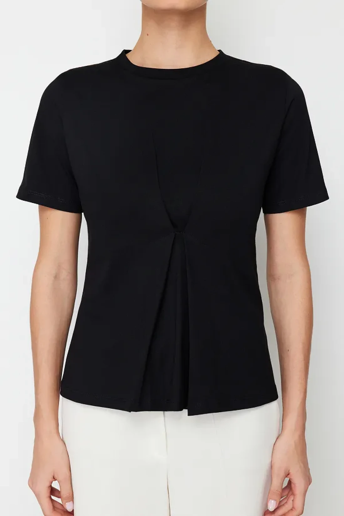 Collection بلوزة محبوكة ذات ثنيات أمامية سوداء بقصة عادية/عادية ورقبة دائرية TWOSS24BZ00302