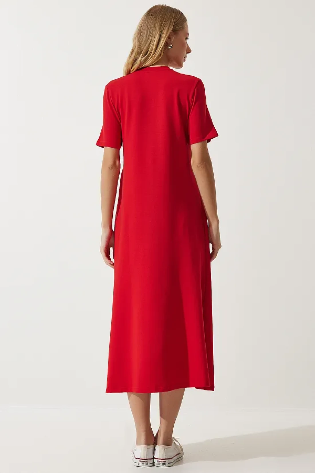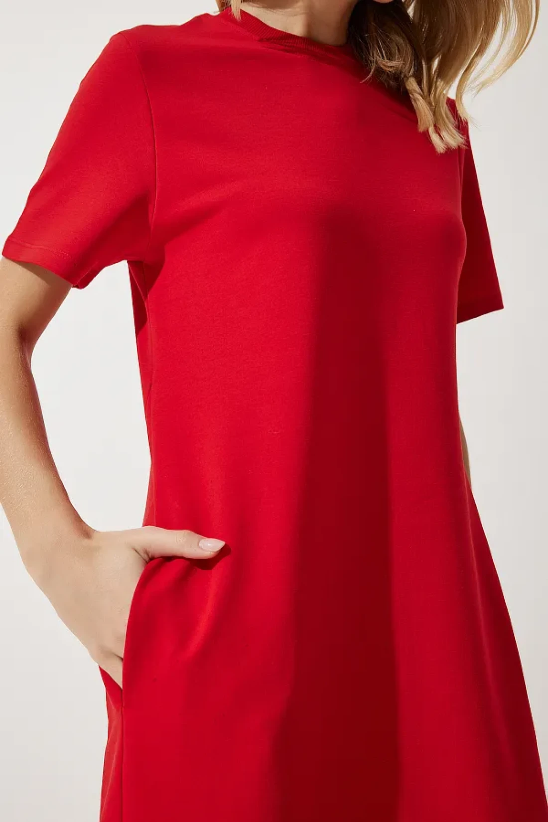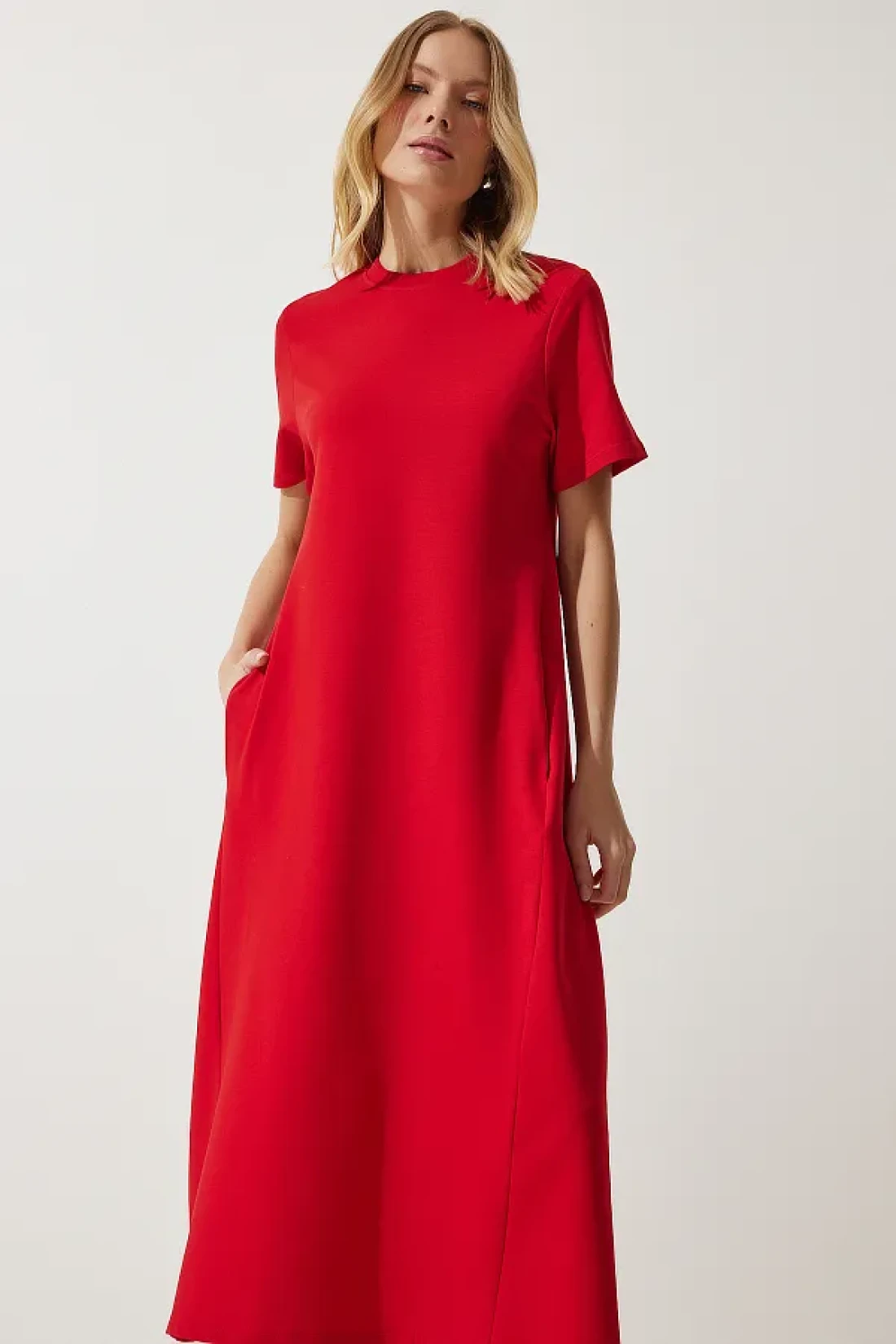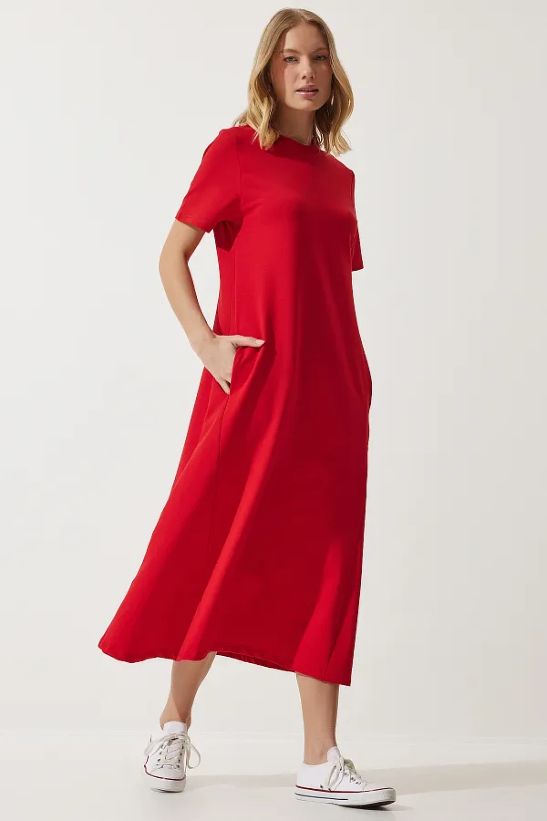 Happiness İstanbul فستان نسائي صيفي أحمر على شكل حرف A من القطن الممشط UB00060