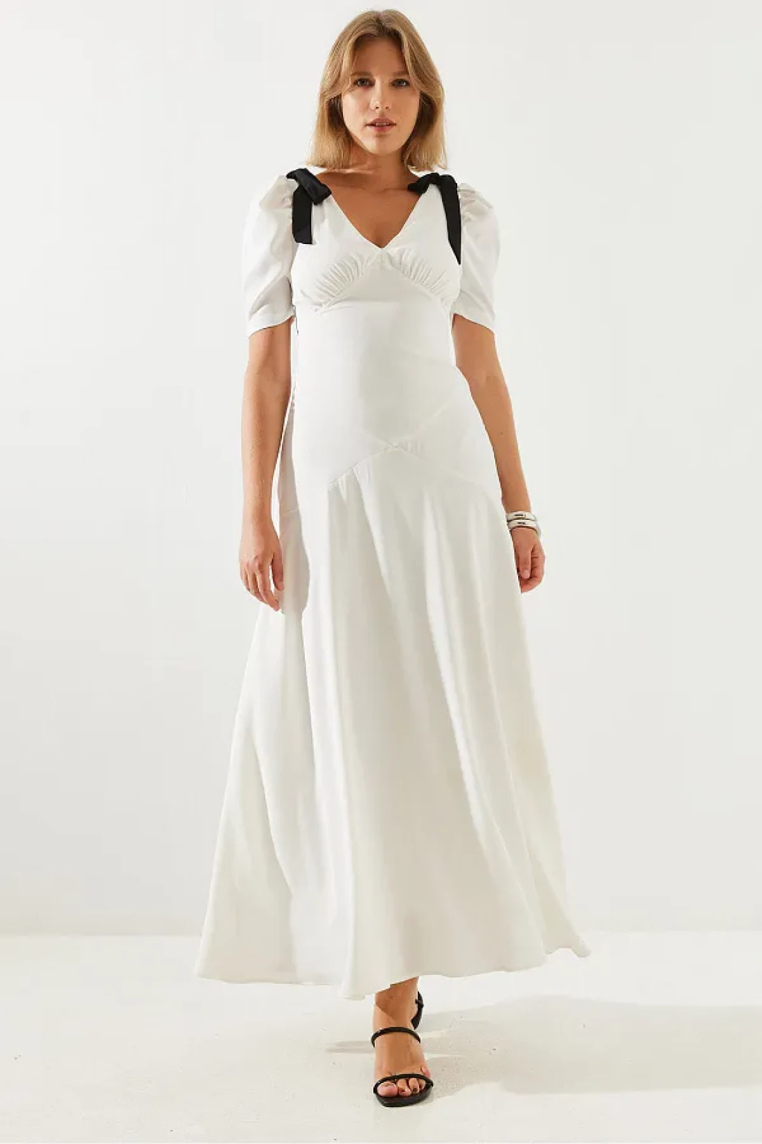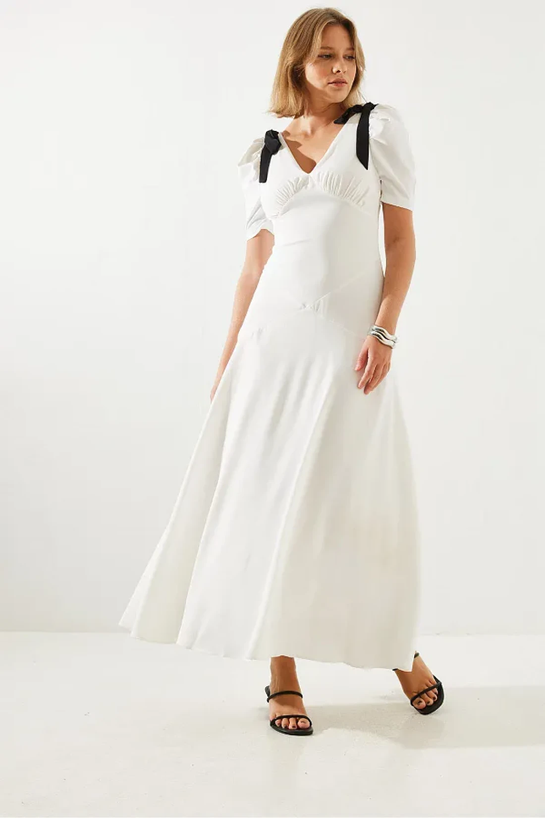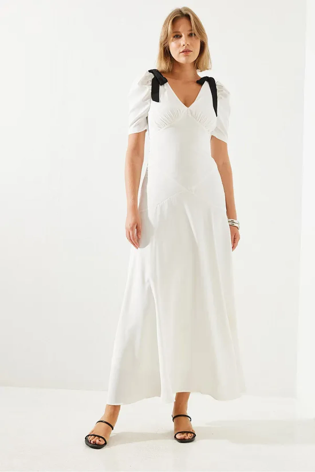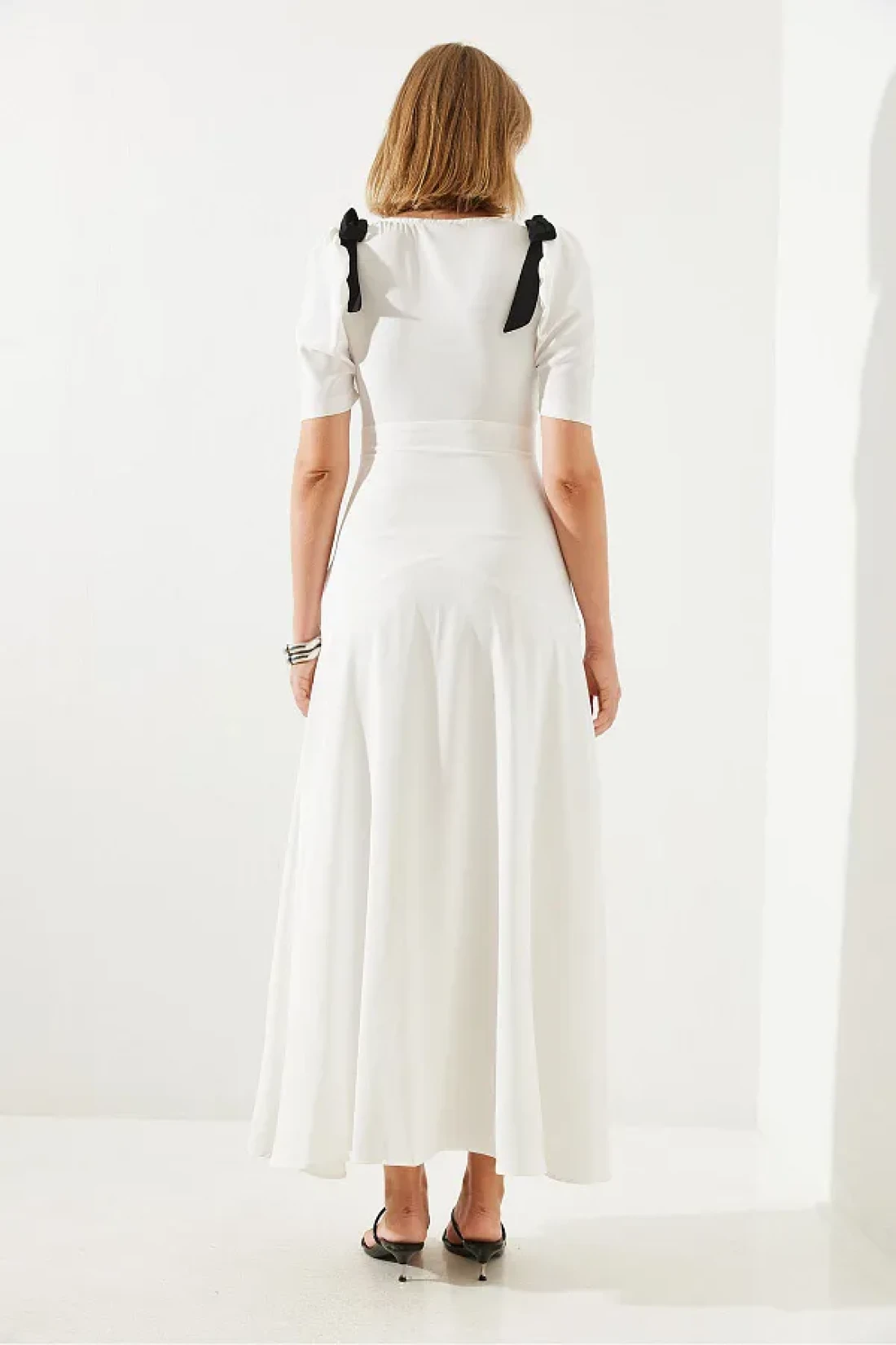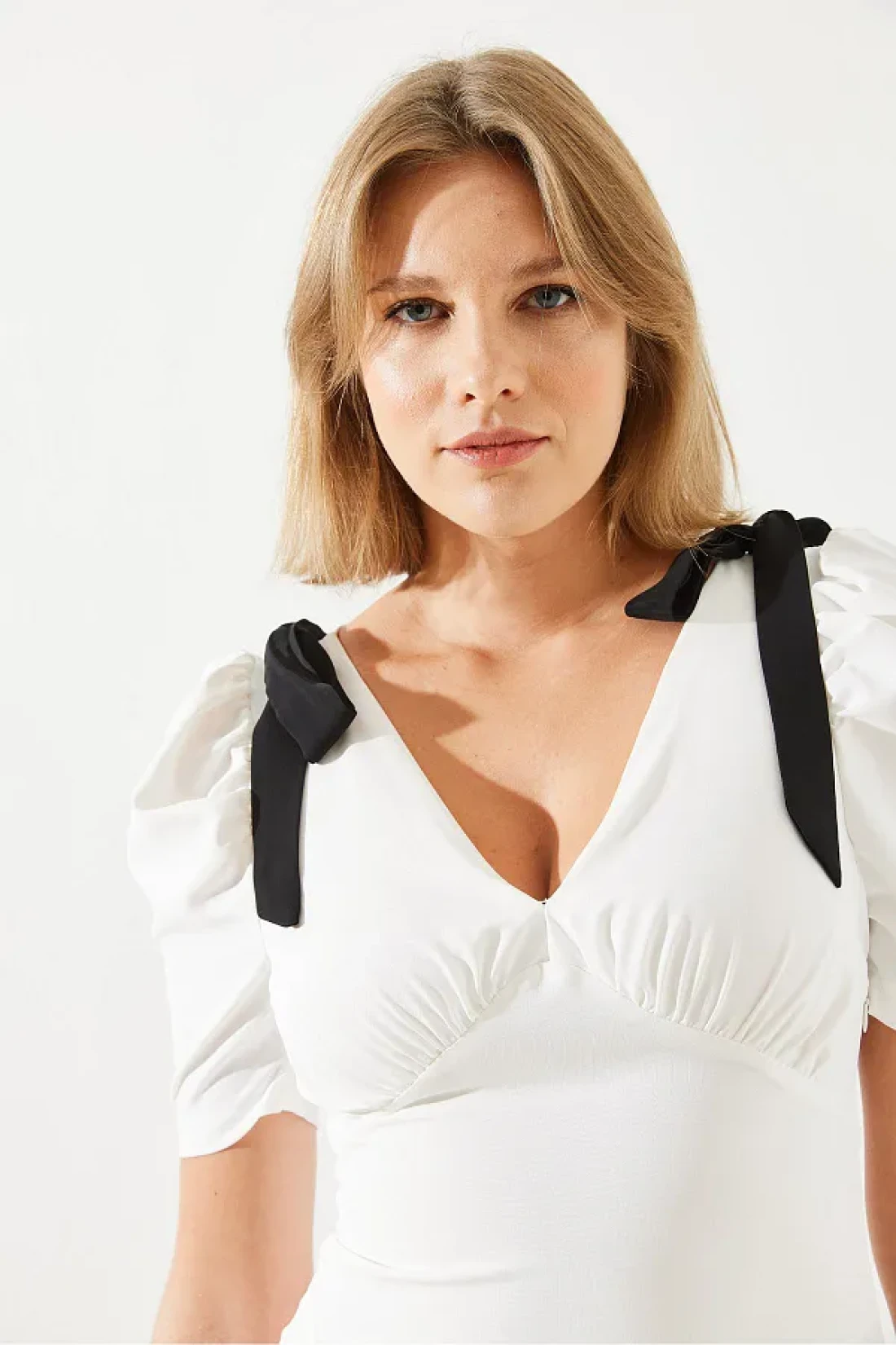 Bianco Lucci فستان نسائي متوسط الطول بياقة على شكل حرف V وأكمام قصيرة مزين بفيونكة 60251279