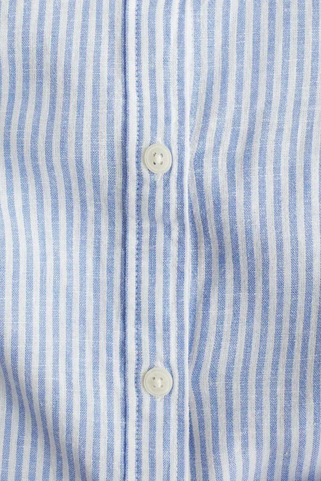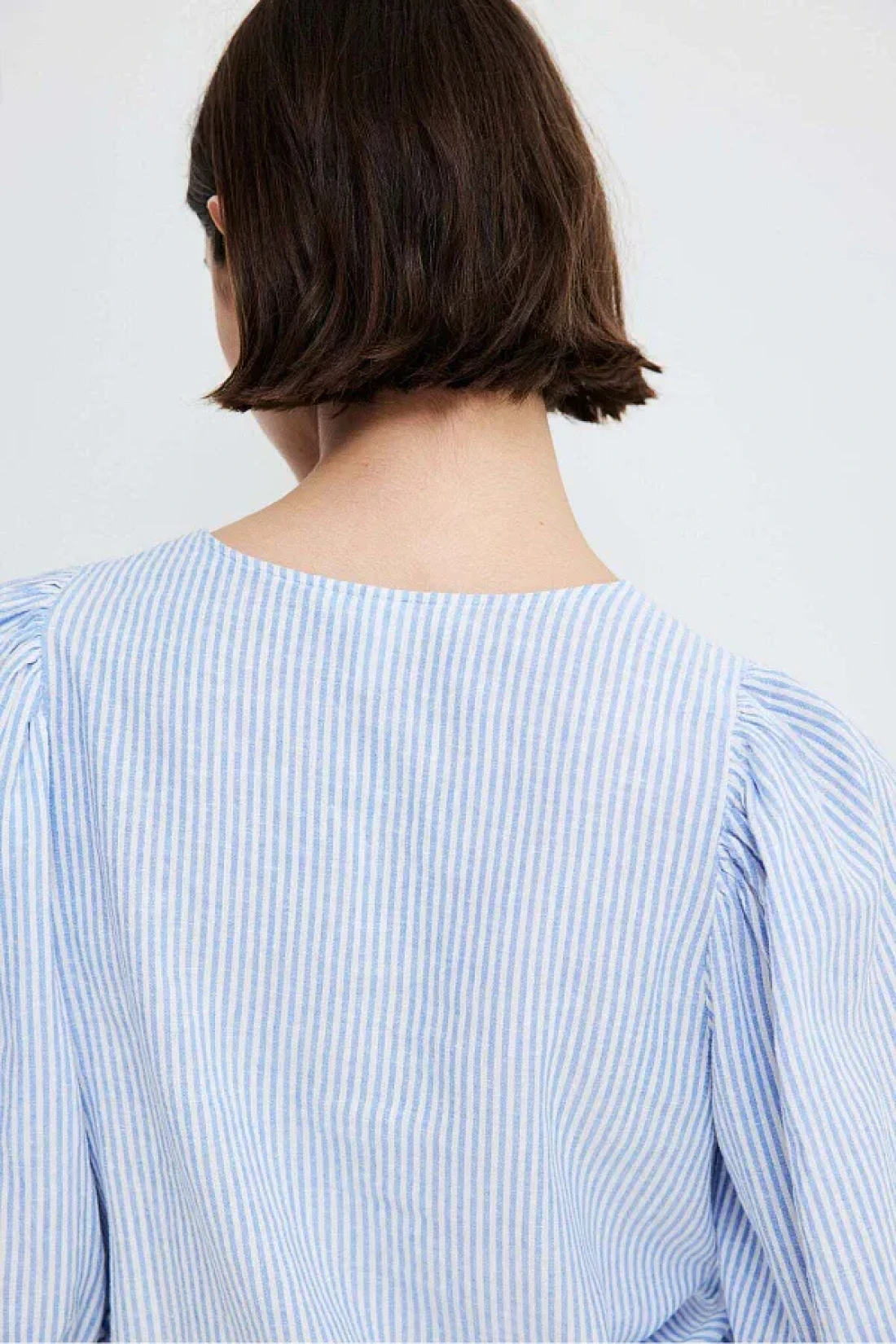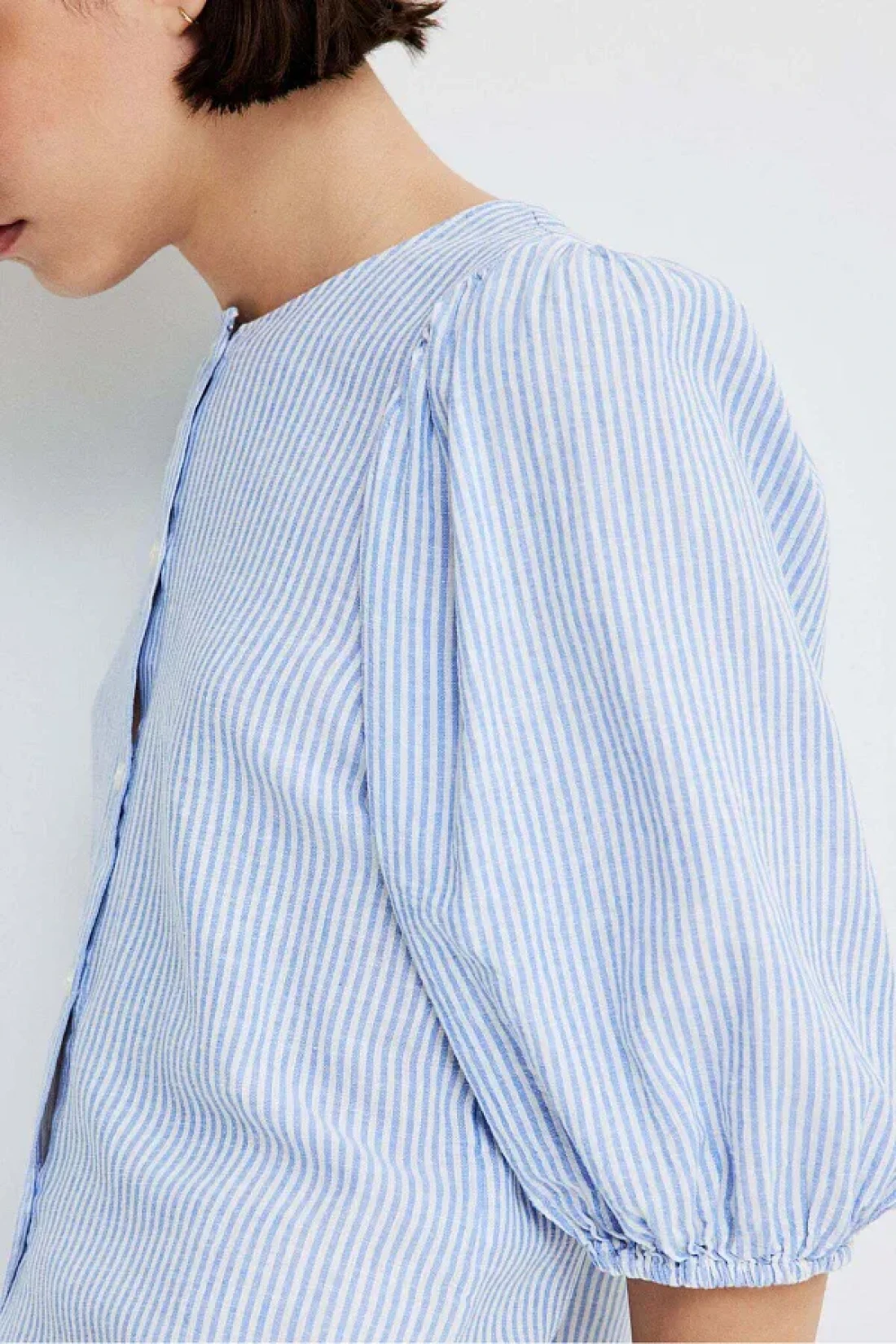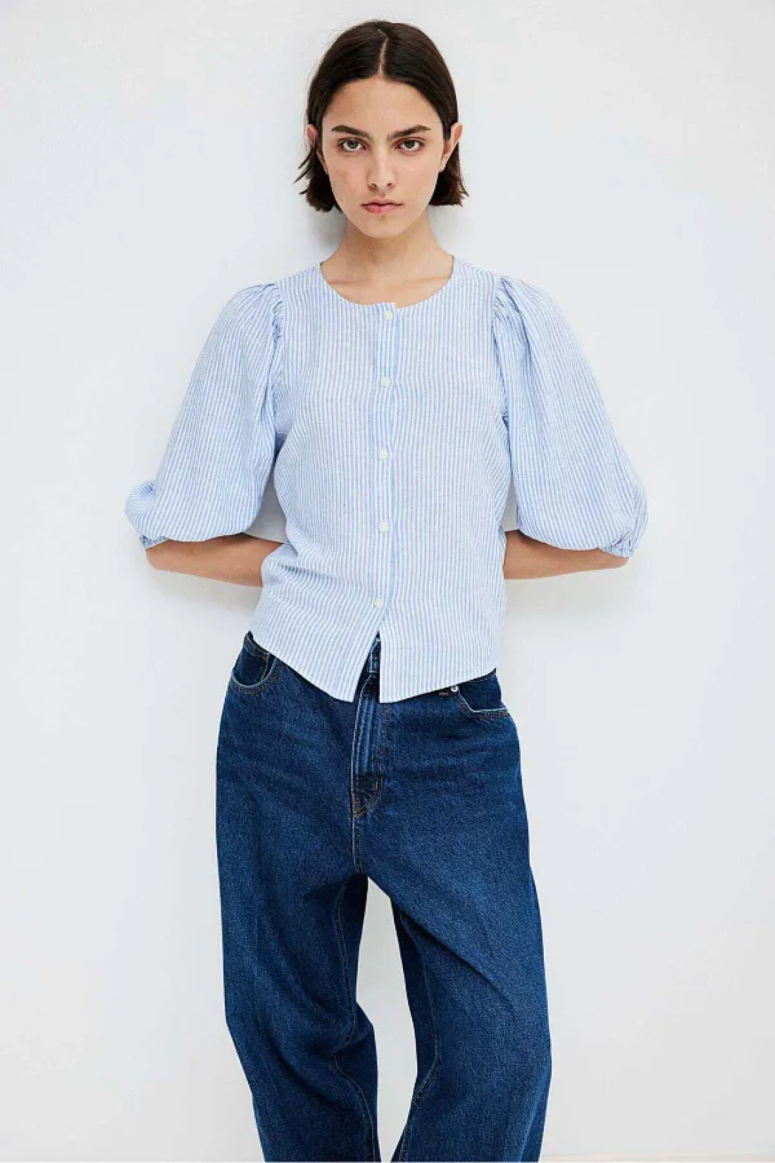 بلوزة ملائمة من نسيج خفيف مصنوع من مزيج الكتان. رقبة دائرية وأزرار على طول الجزء الأمامي وأكمام منفوخة بطول 3/4 مع أساور مرنة.