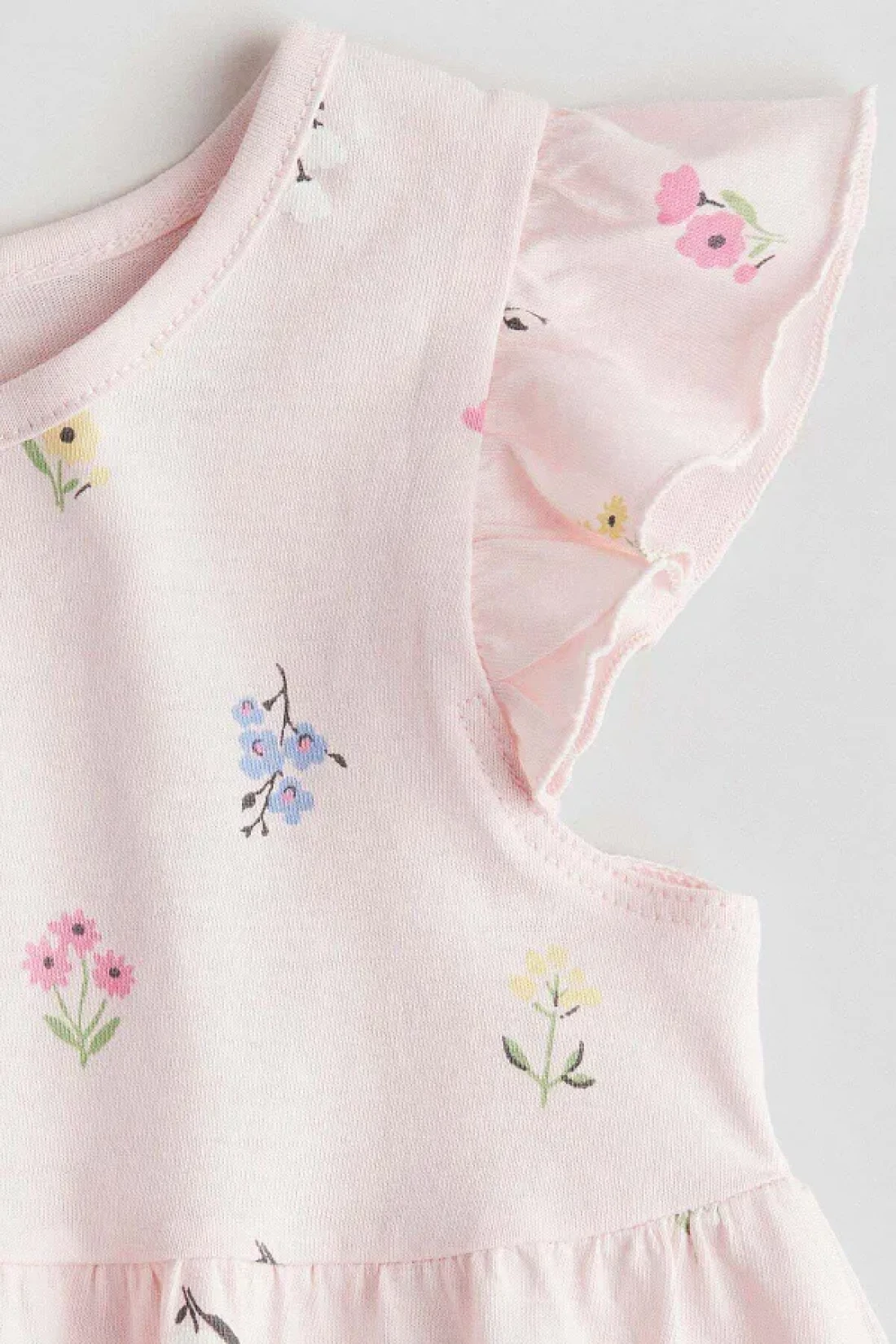 فستان من قماش الجيرسي القطني الناعم مطبوع مع رقبة دائرية وفتحة بزر في الخلف وأكمام منفوخة. يتجمع عند الخصر وتنورة واسعة.