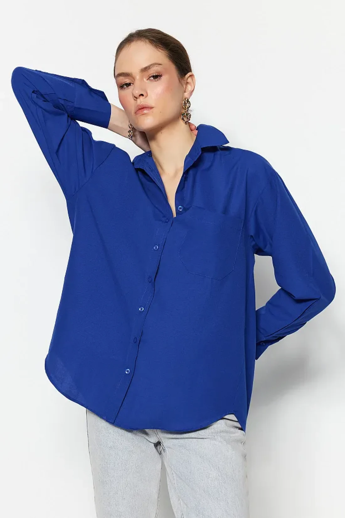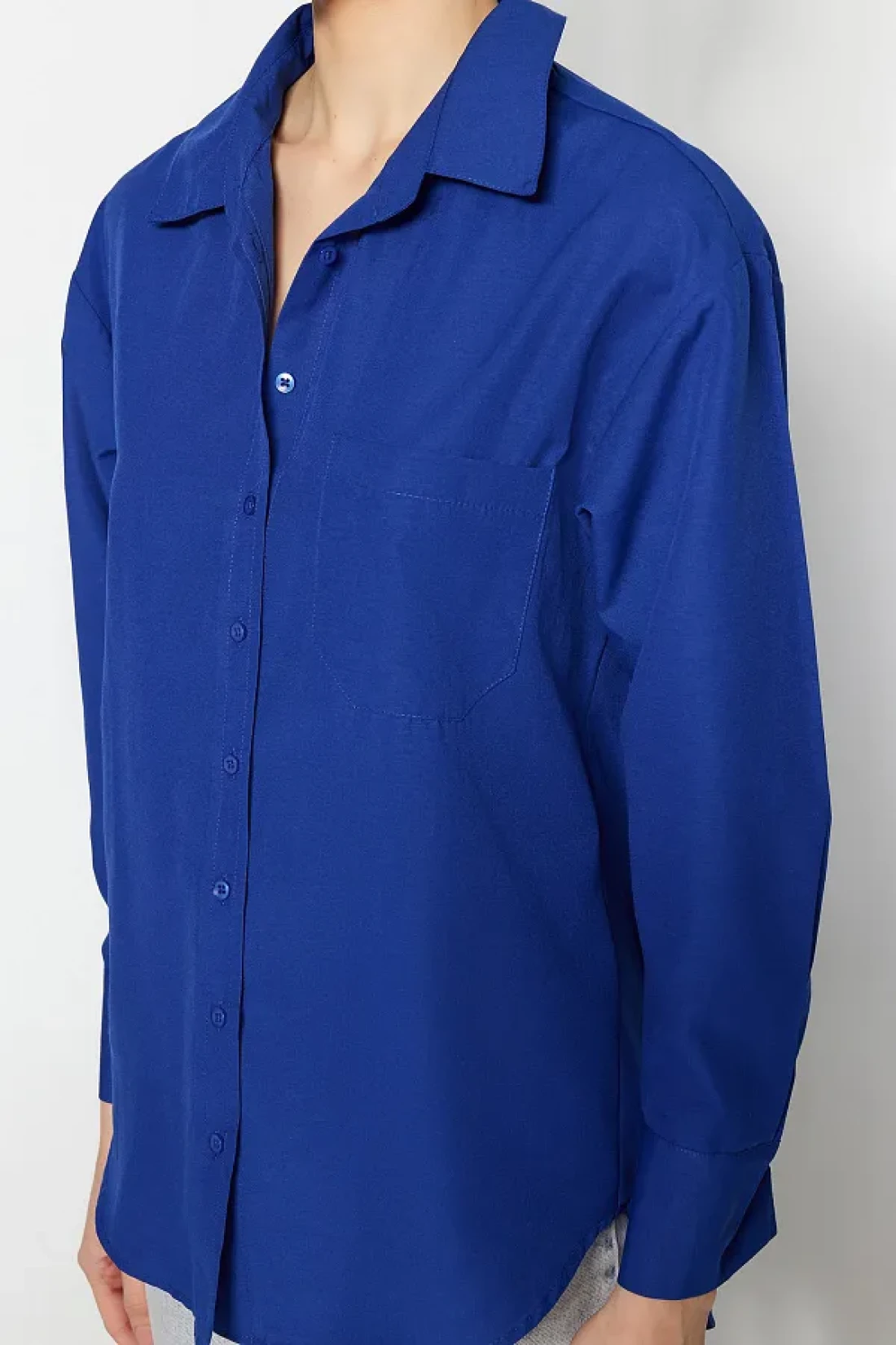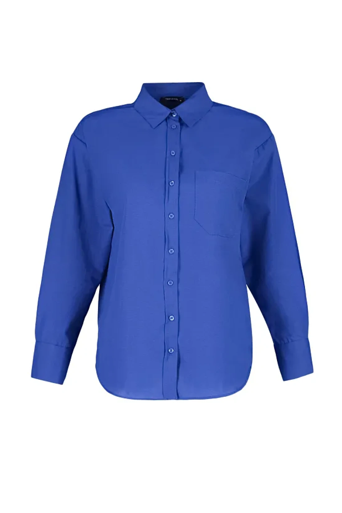 Collection قميص منسوج من القطن بجيب واحد باللون الأزرق الداكن/قميص واسع مقاس TWOAW20GO0115