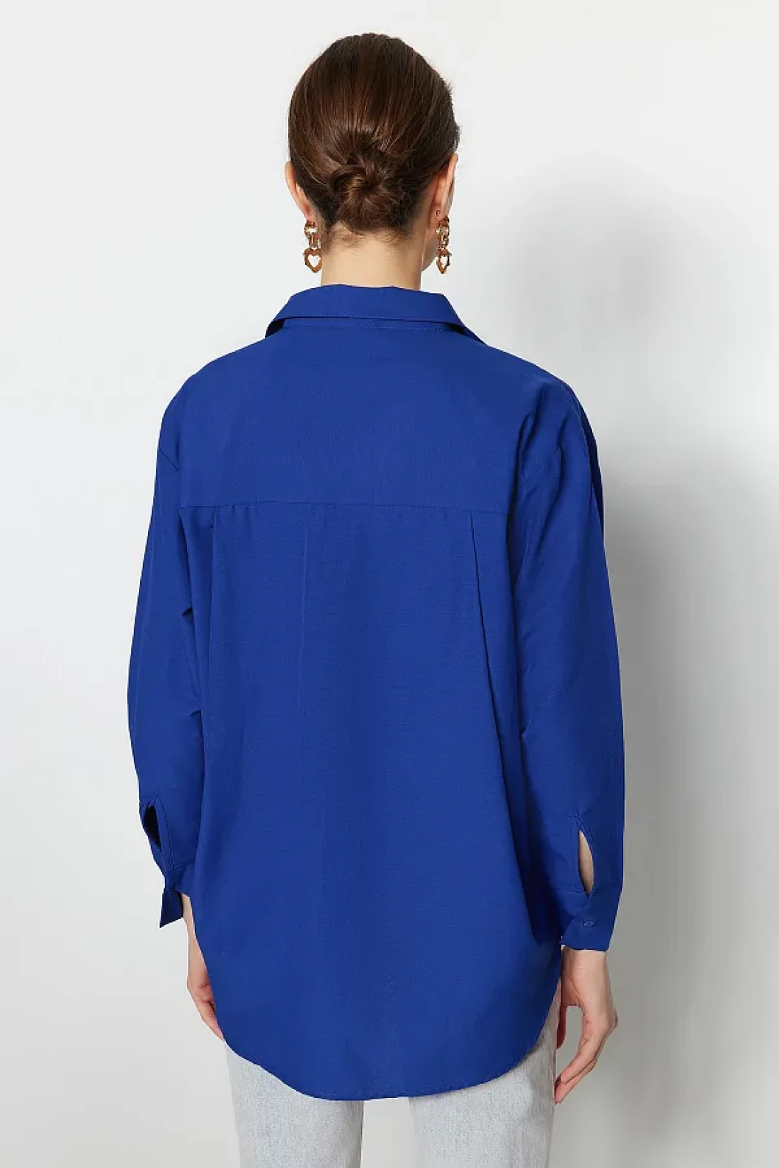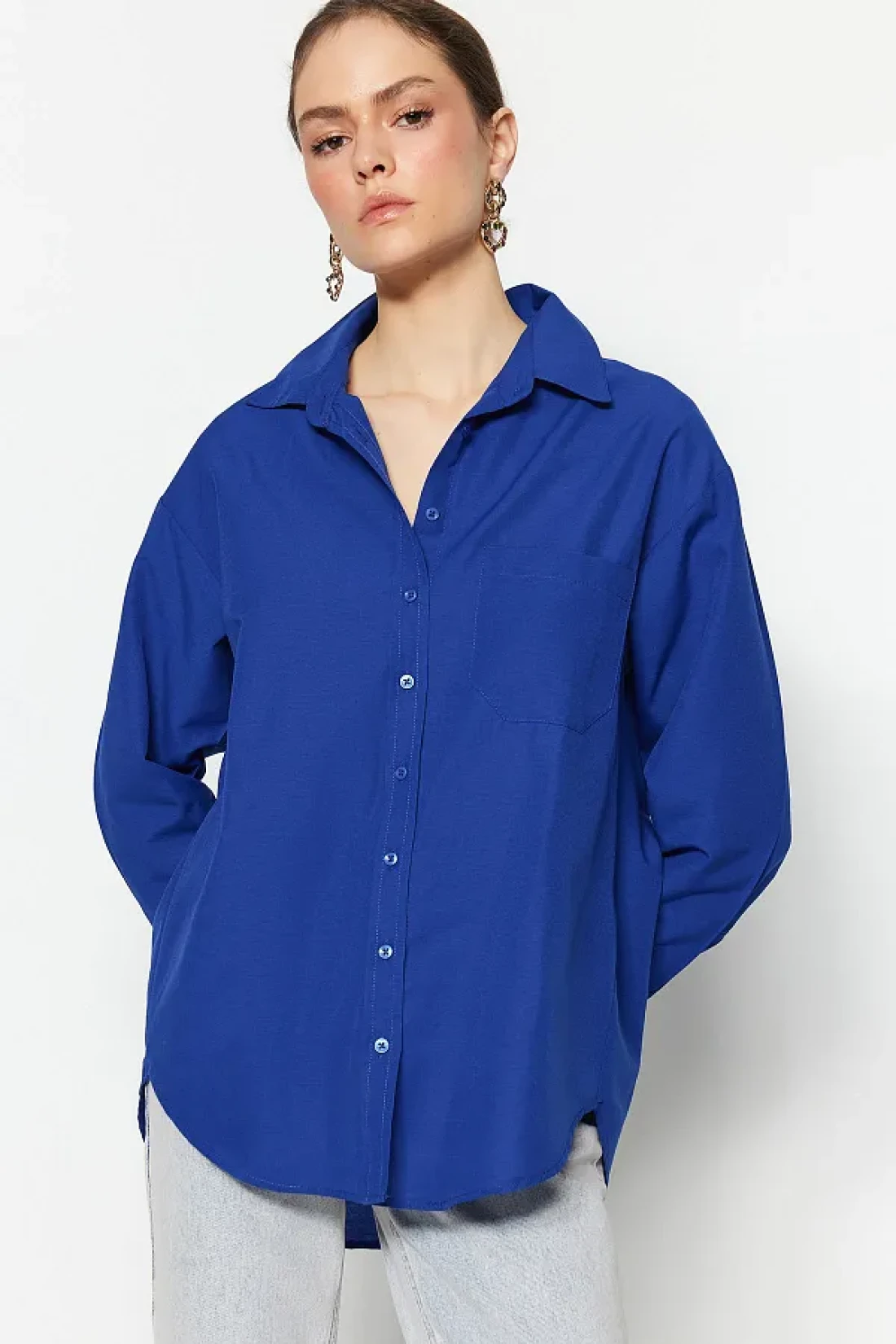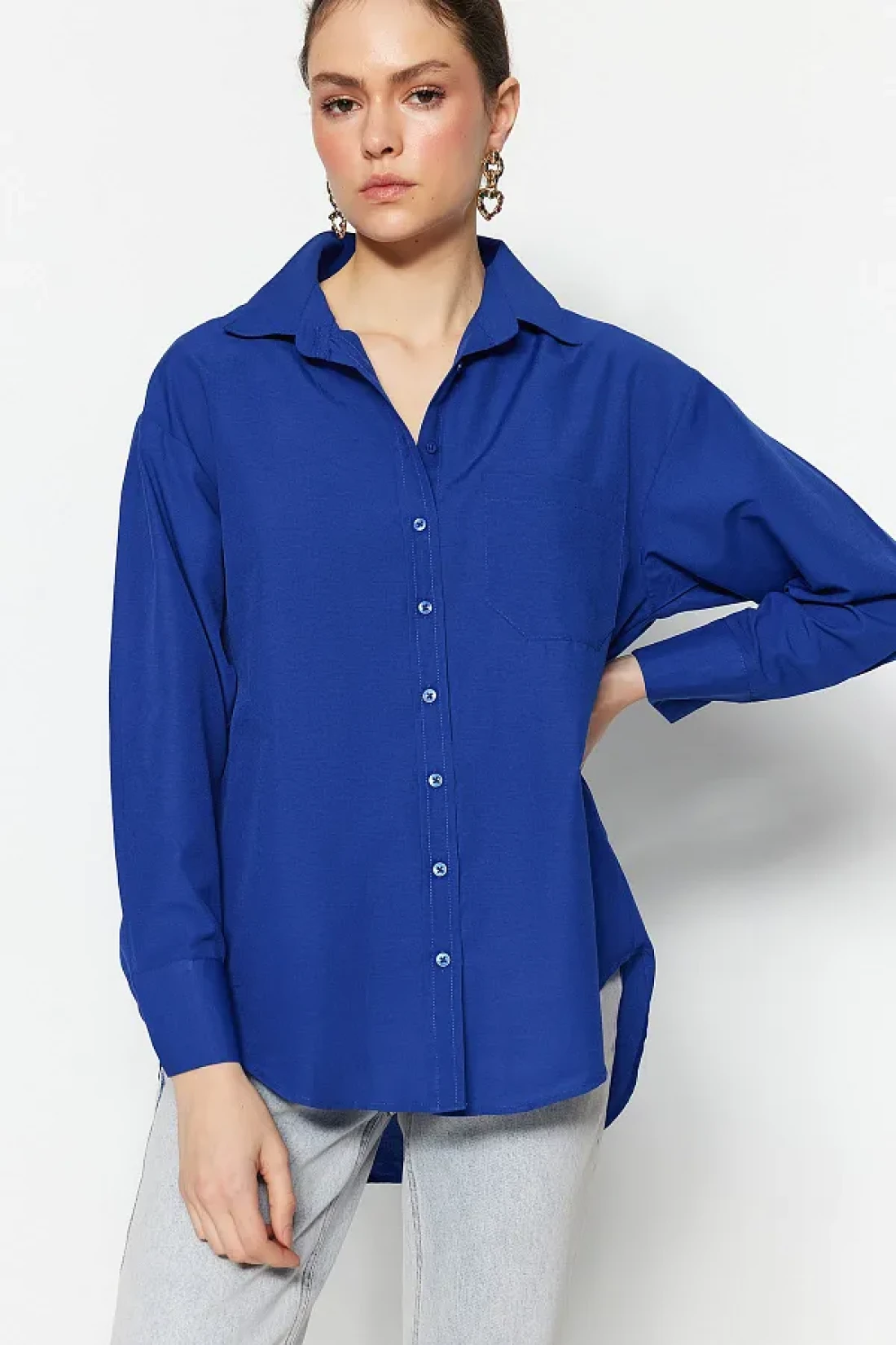 Collection قميص منسوج من القطن بجيب واحد باللون الأزرق الداكن/قميص واسع مقاس TWOAW20GO0115