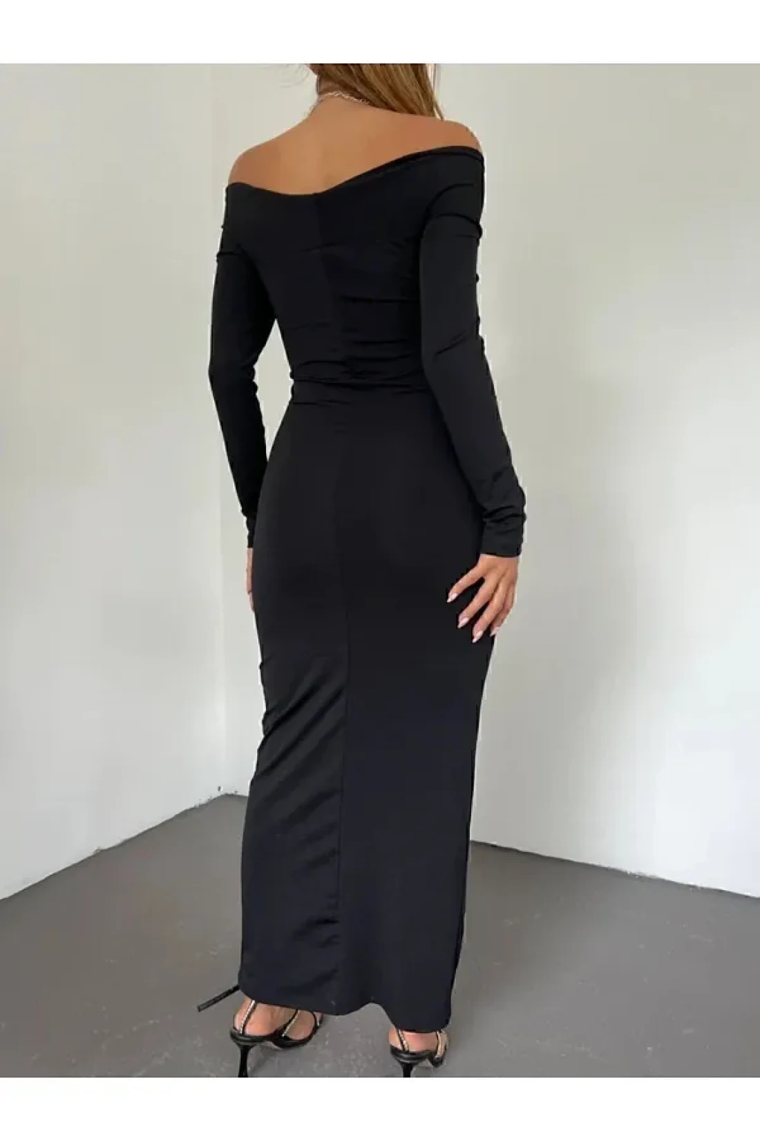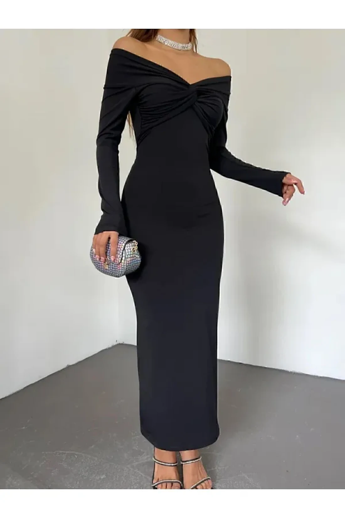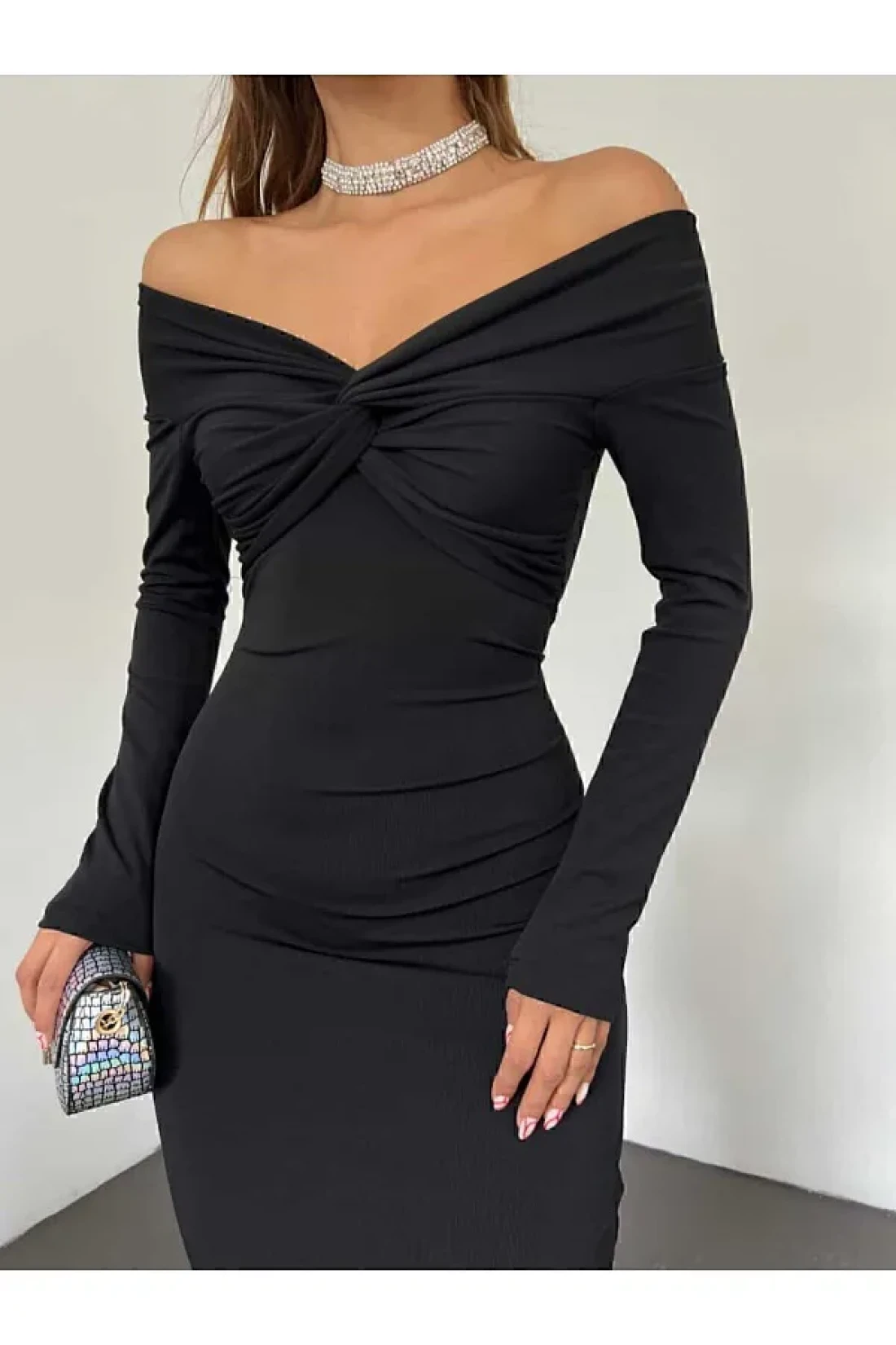 DENİKK 1018 قارب الرقبة الجبهة مزدوجة الصدر ميدي طول النسيج الناعم المرأة فستان أسود الاتجاه