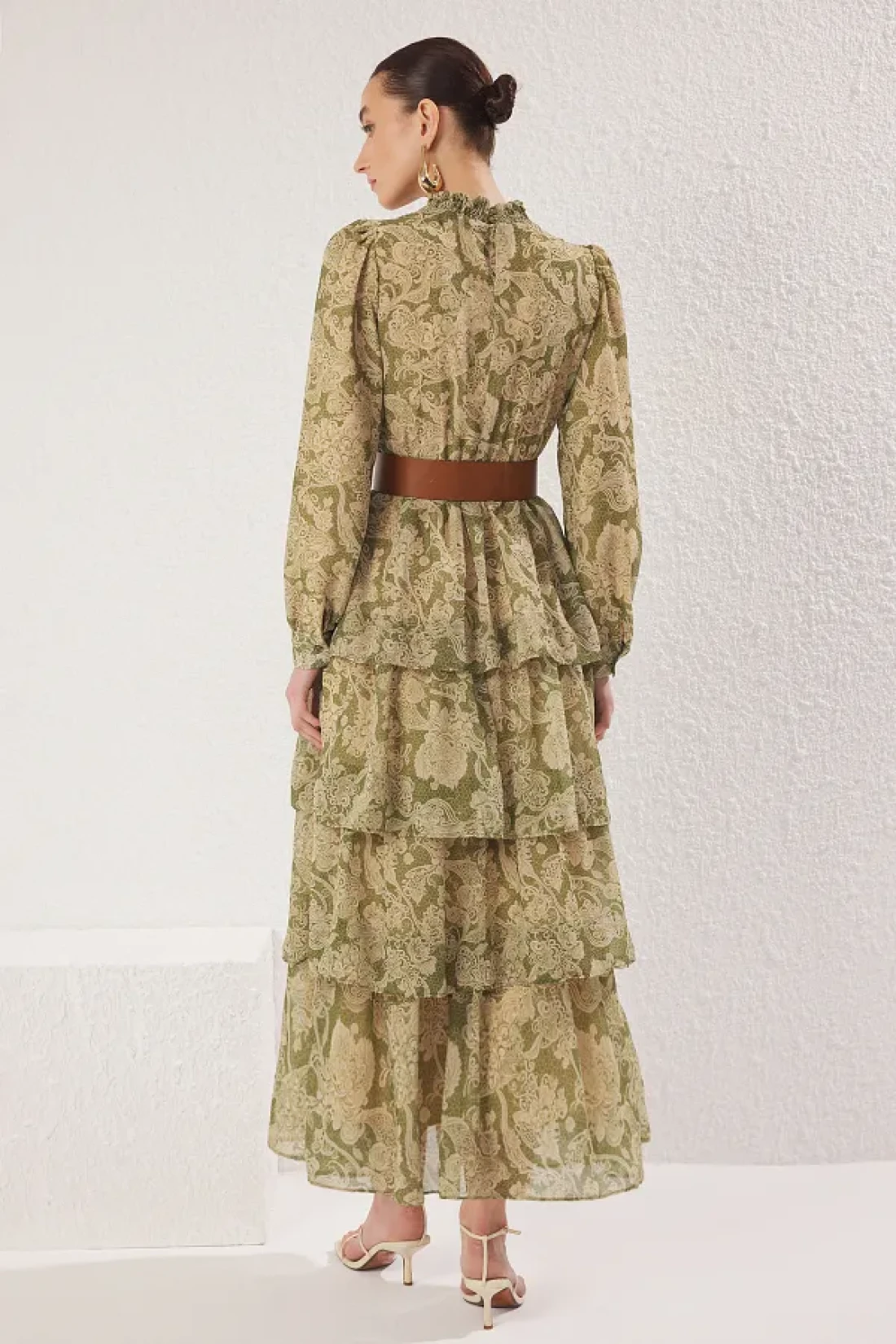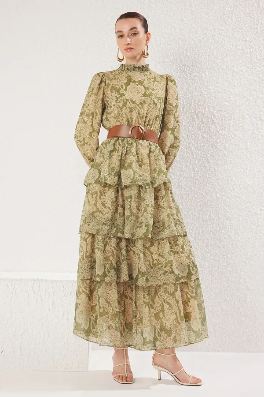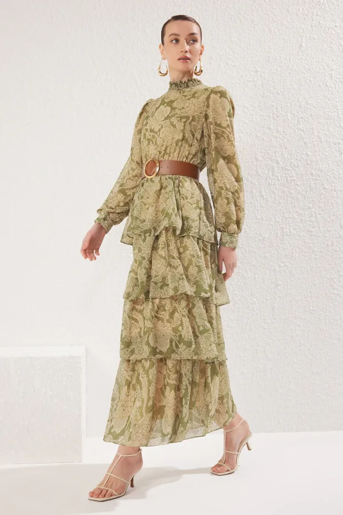 Modest فستان منسوج من الشيفون باللون الأخضر مع طية صدر السترة وحزام TCTSS25EB00062
