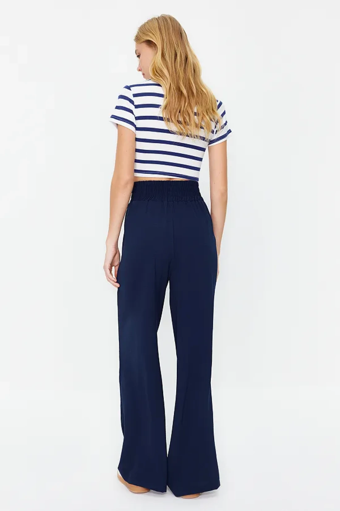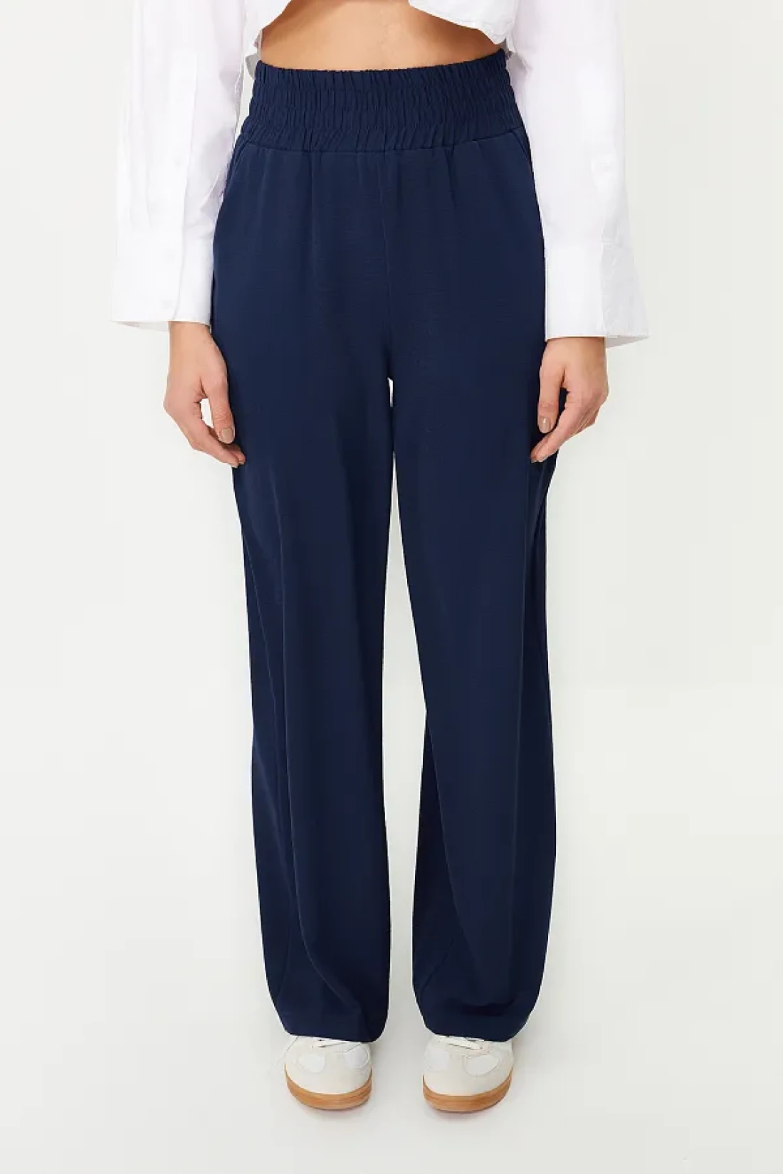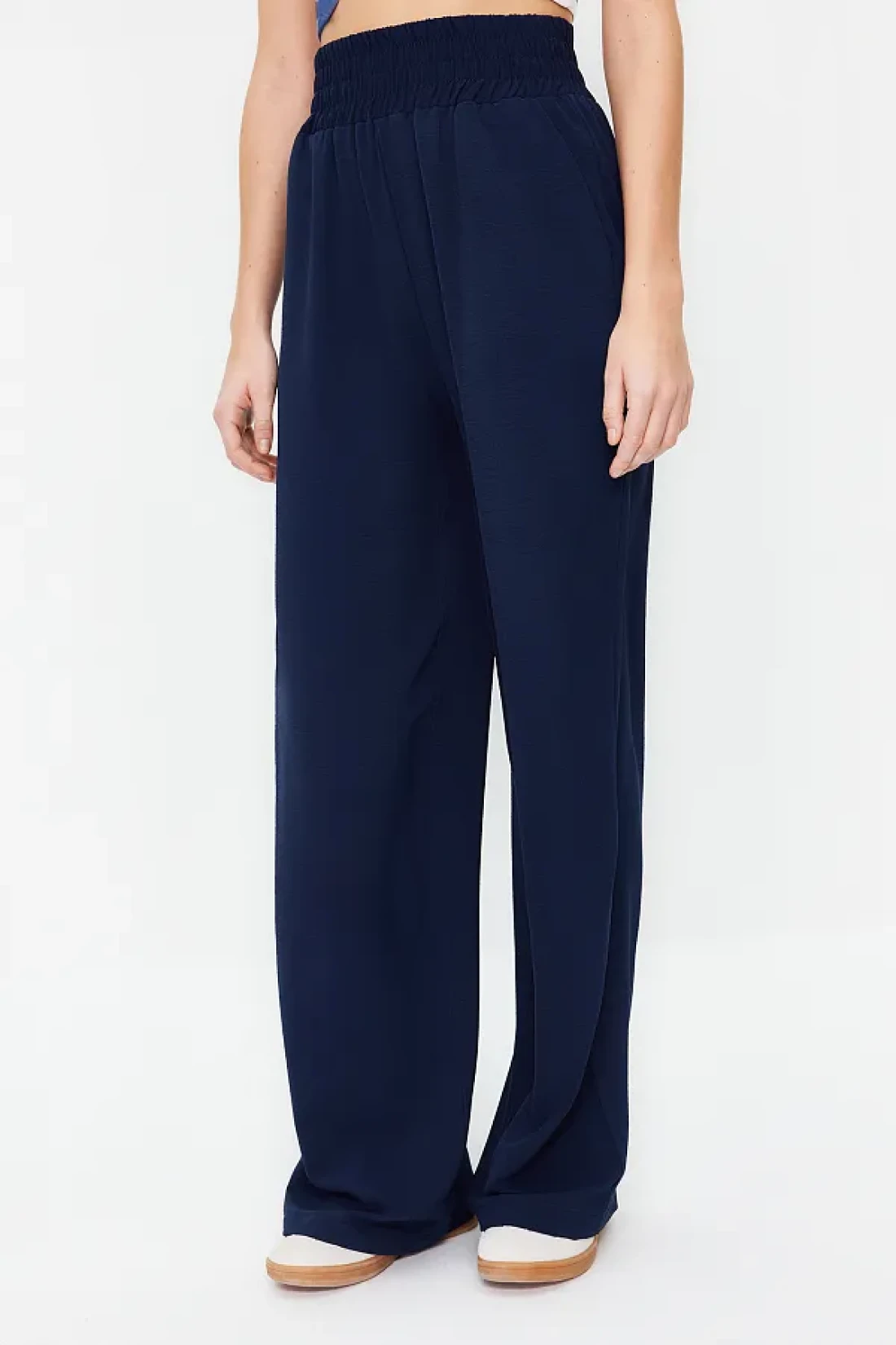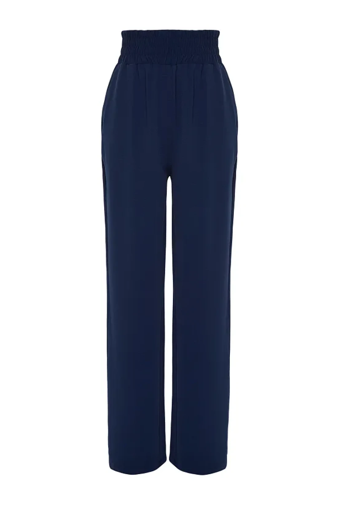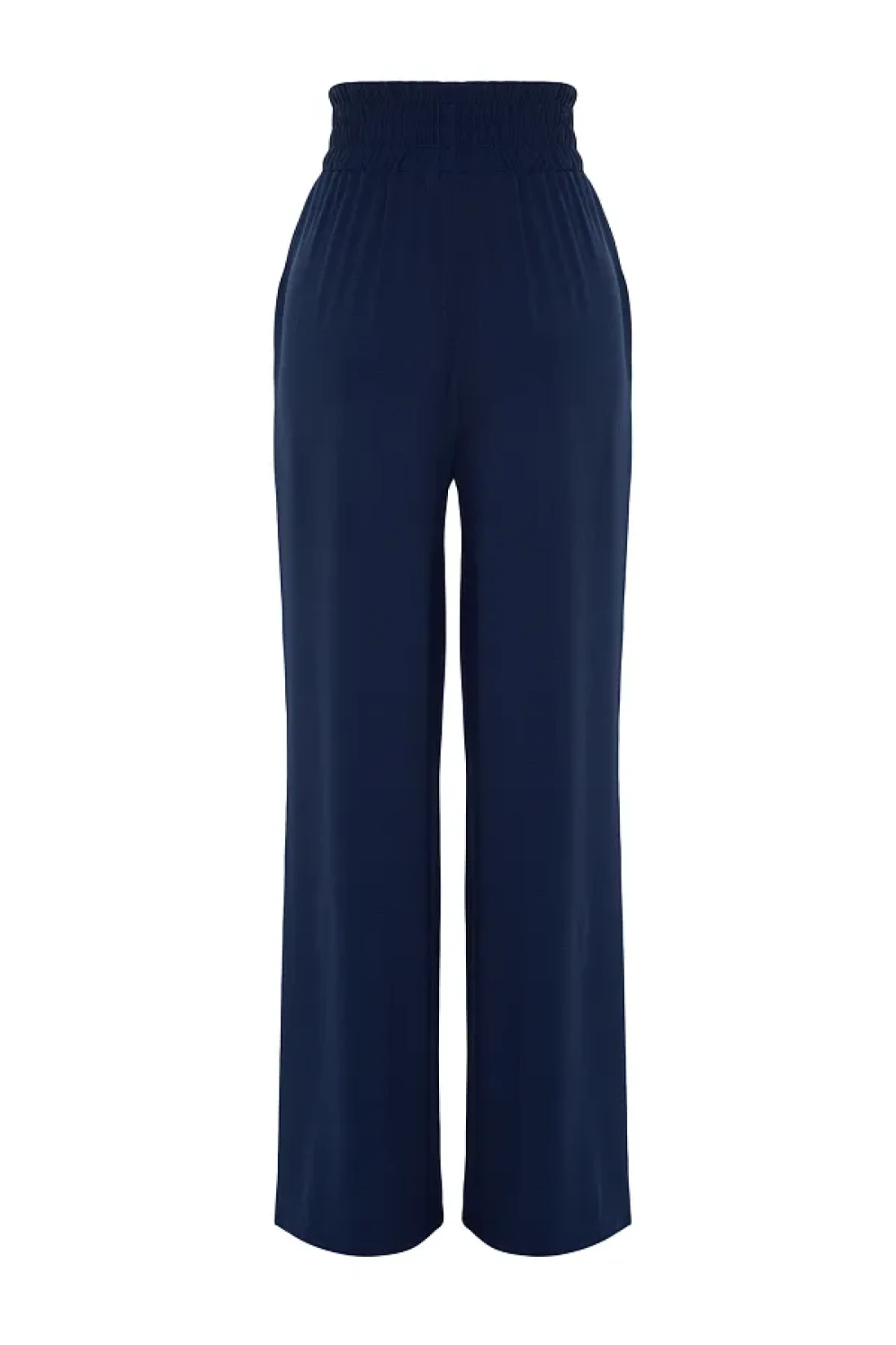 Collection بنطلون منسوج مرن باللون الأزرق الداكن بأرجل واسعة وخصر عريض للكاحل TWOSS22PL00024