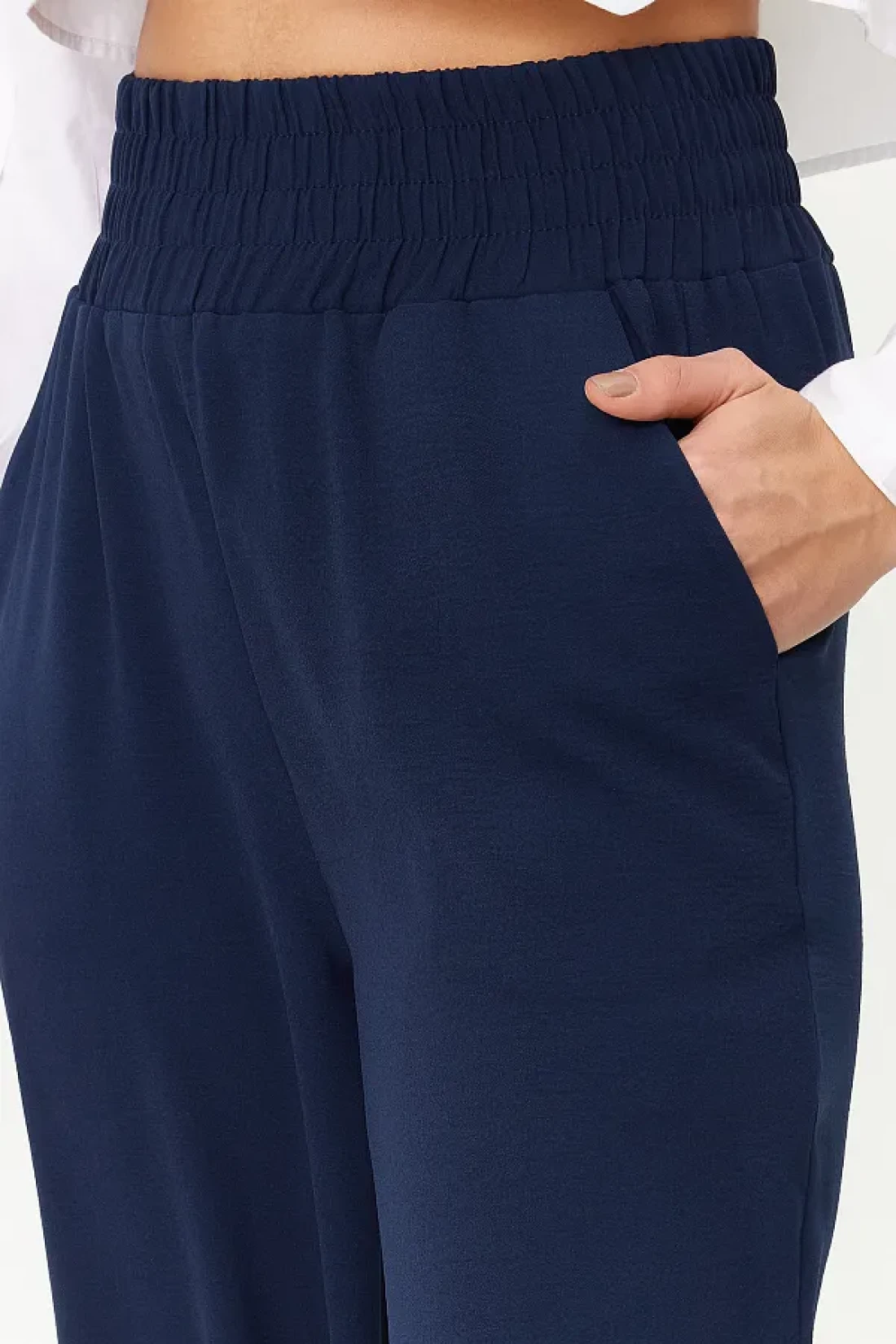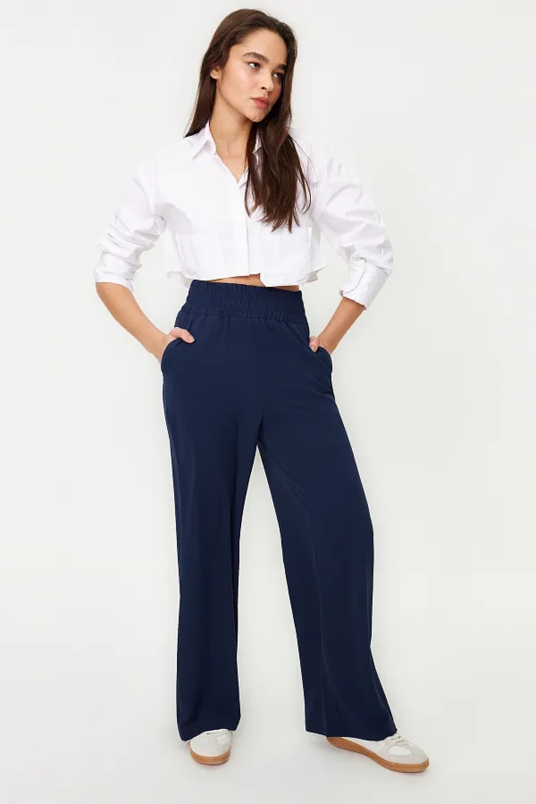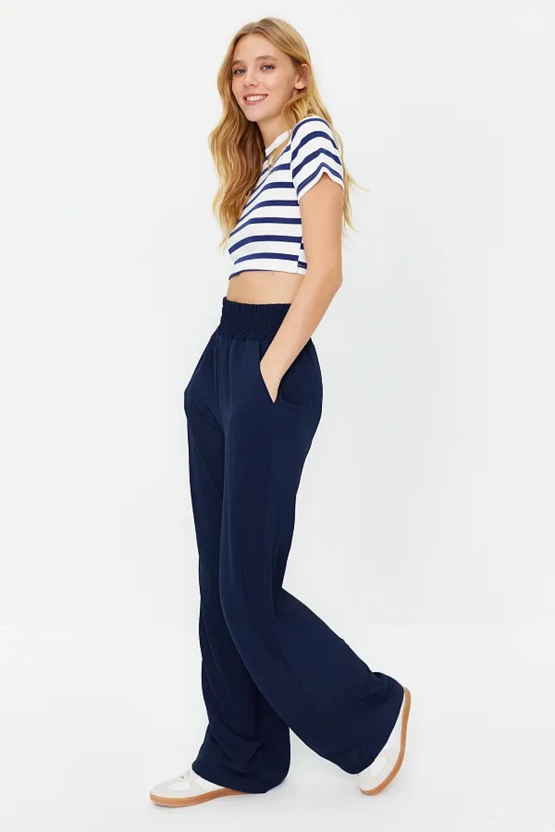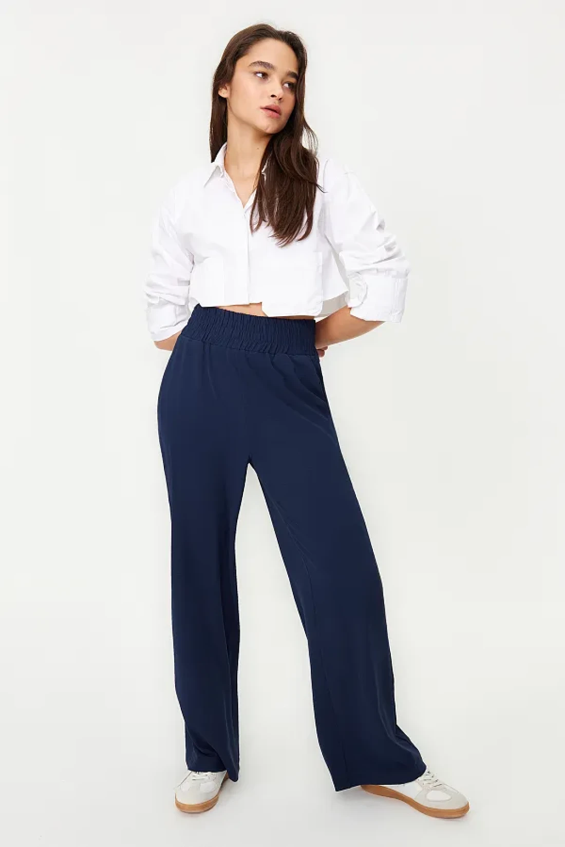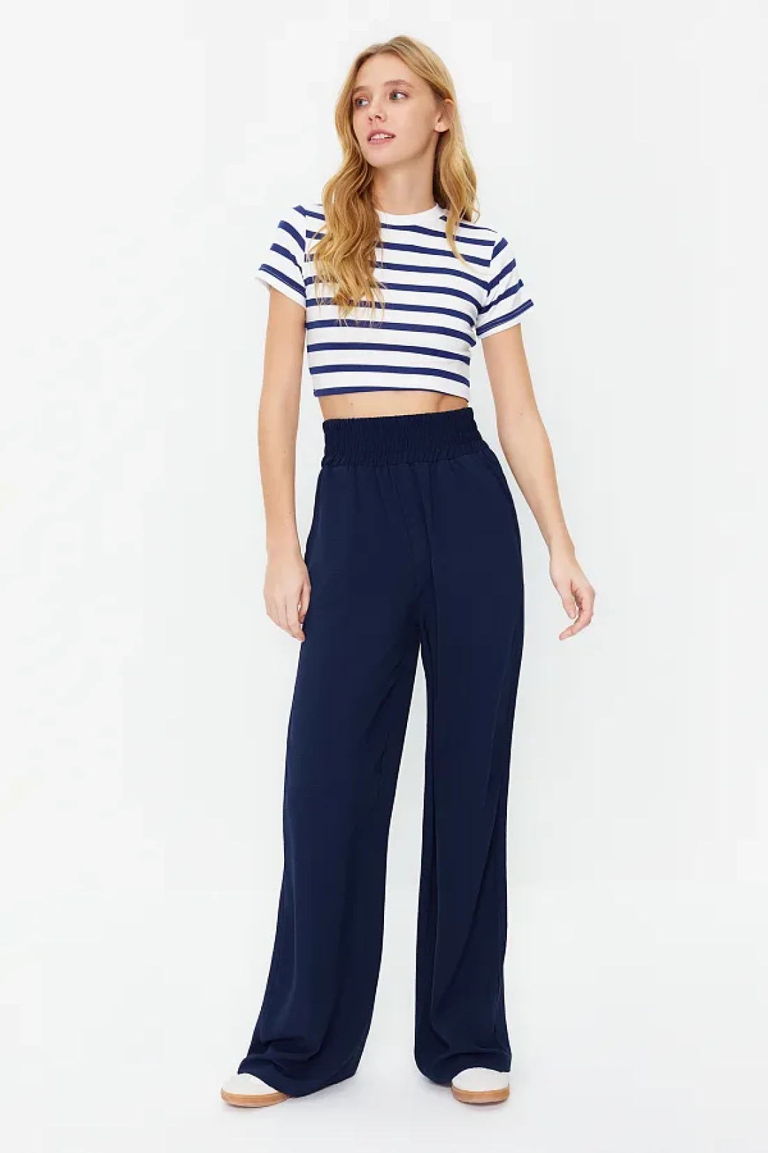 Collection بنطلون منسوج مرن باللون الأزرق الداكن بأرجل واسعة وخصر عريض للكاحل TWOSS22PL00024