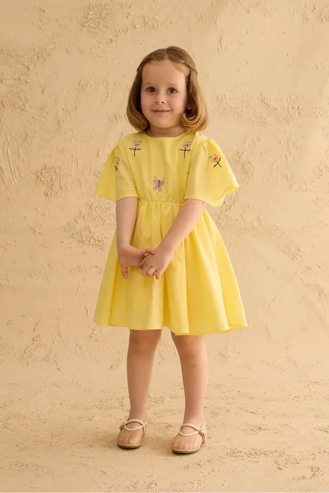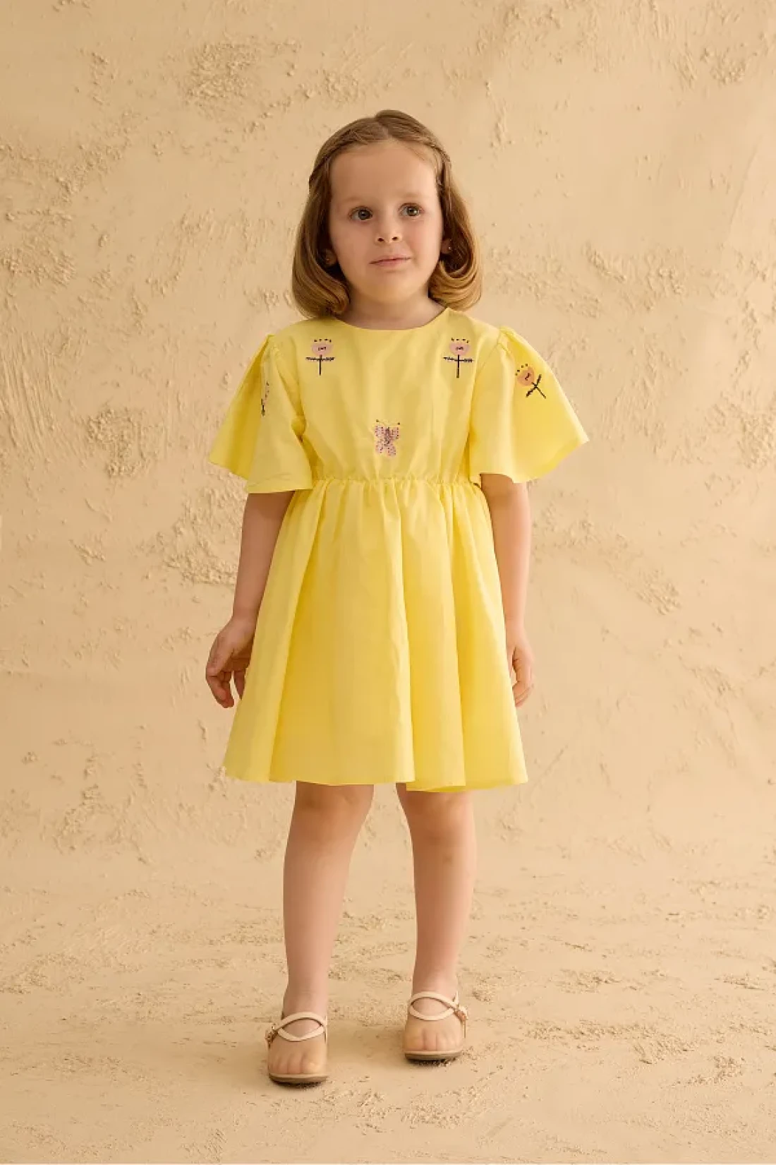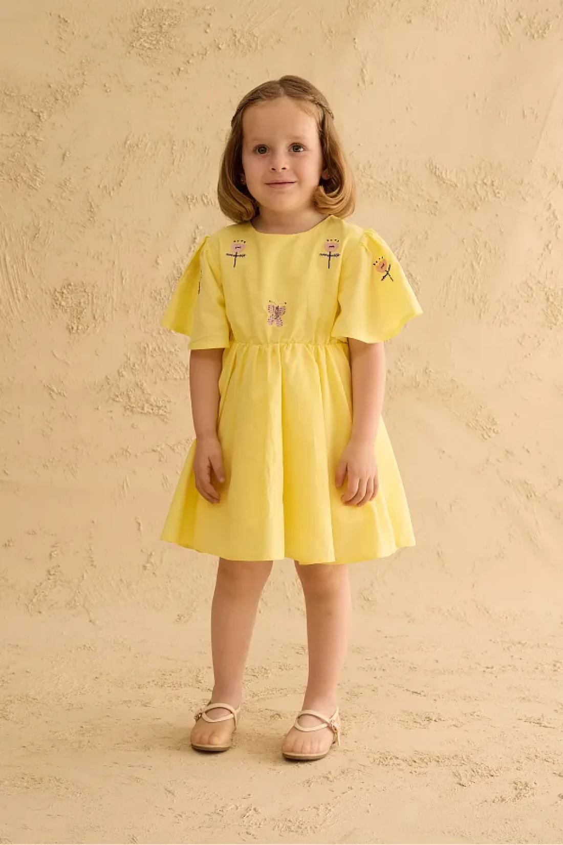 فستان مصنوع من قماش الفوال القطني 100%، بأكمام قصيرة مكشكشة، وإغلاق بسحاب في الخلف، وتفاصيل مطرزة، وخصر مرن رفيع.